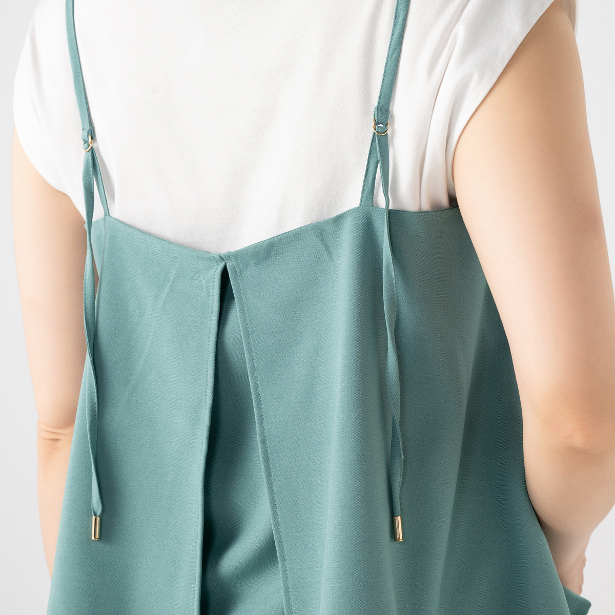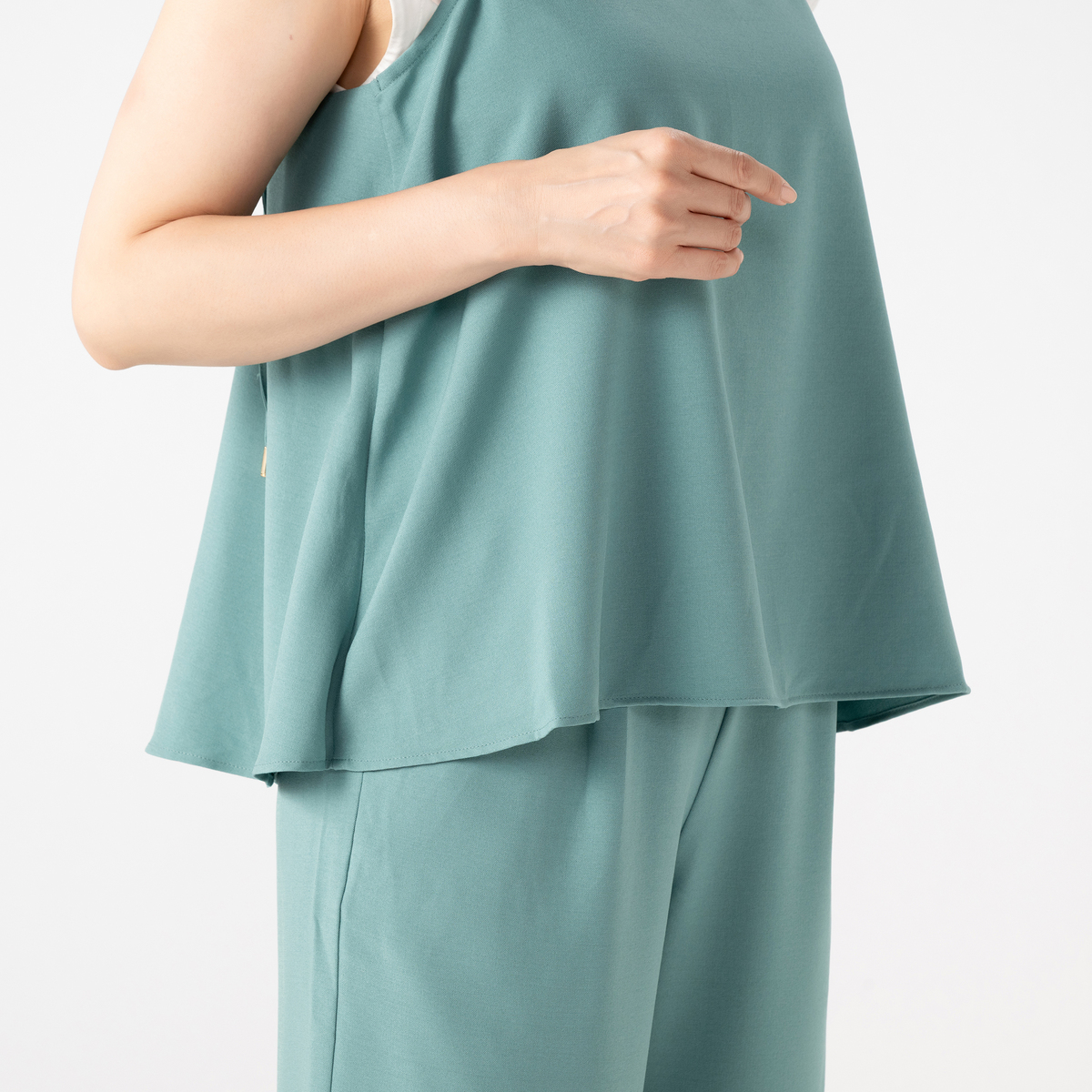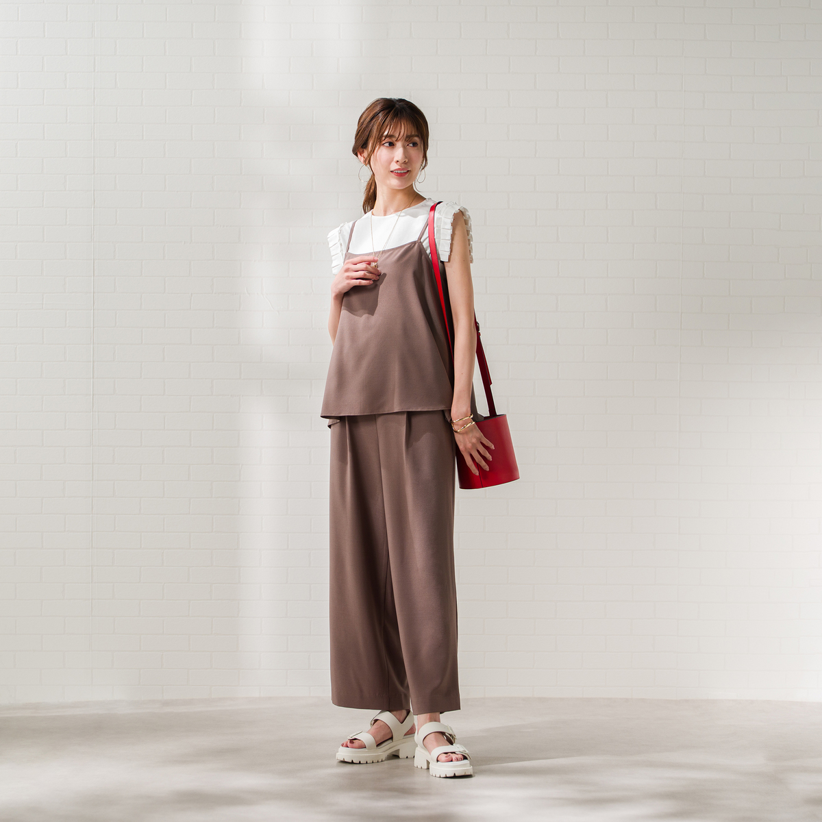 キャミソールとワイドパンツのセットアップ。麻素材のような杢調に染色が出る素材を使用。ポリエステル混素材のためシワになりにくく、軽くてさらりとした肌ざわりです。細めの肩紐やひらひらとした裾が可愛らしく、腰まわりの体形カバーも期待できます