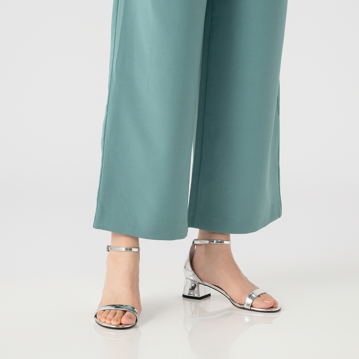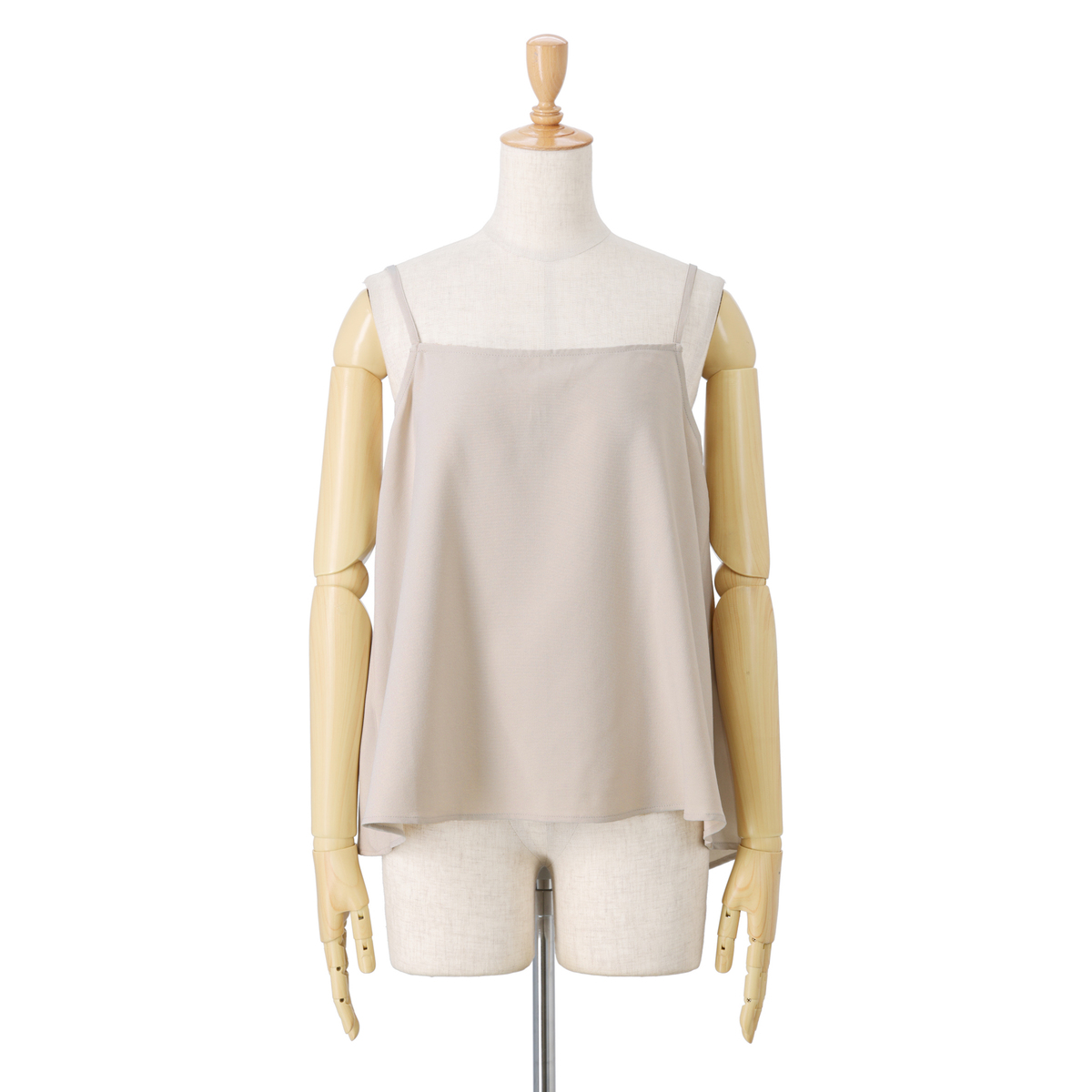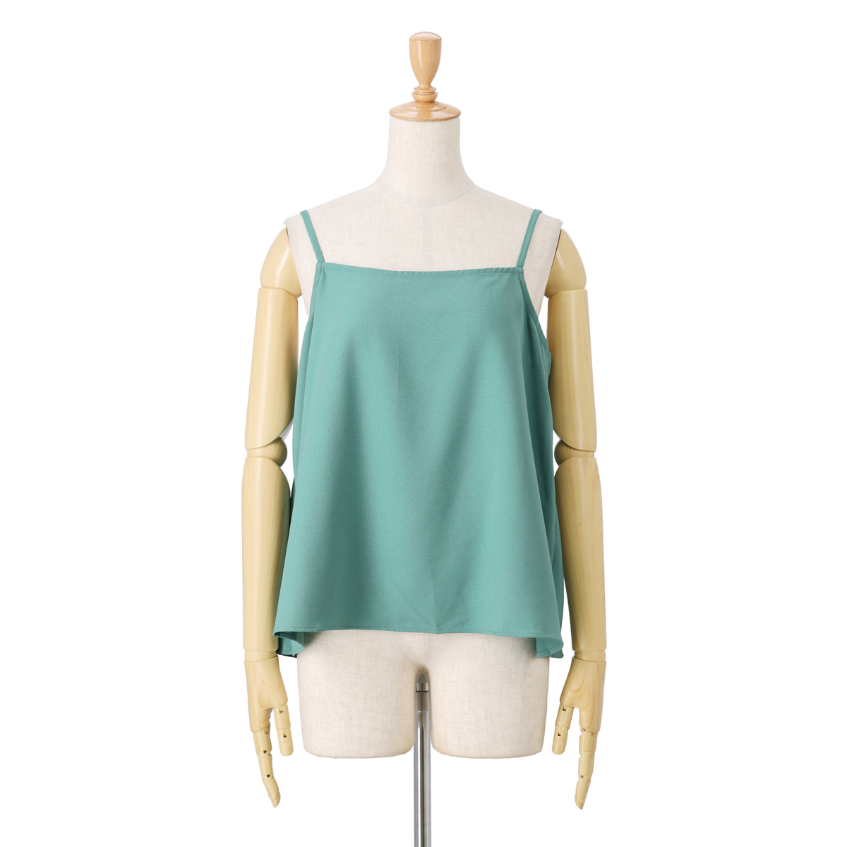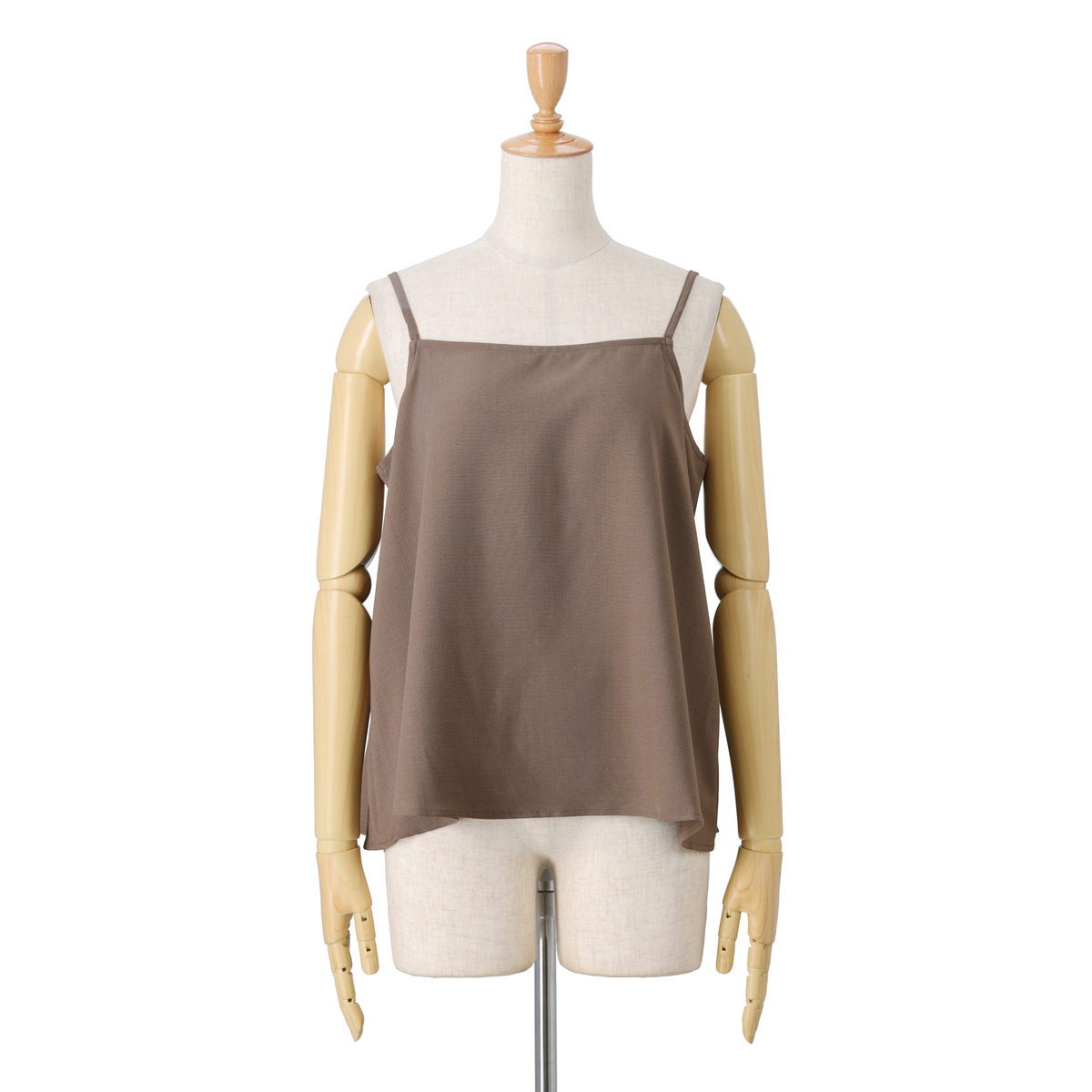 キャミソールとワイドパンツのセットアップ。麻素材のような杢調に染色が出る素材を使用。ポリエステル混素材のためシワになりにくく、軽くてさらりとした肌ざわりです。細めの肩紐やひらひらとした裾が可愛らしく、腰まわりの体形カバーも期待できます