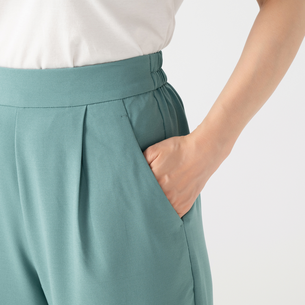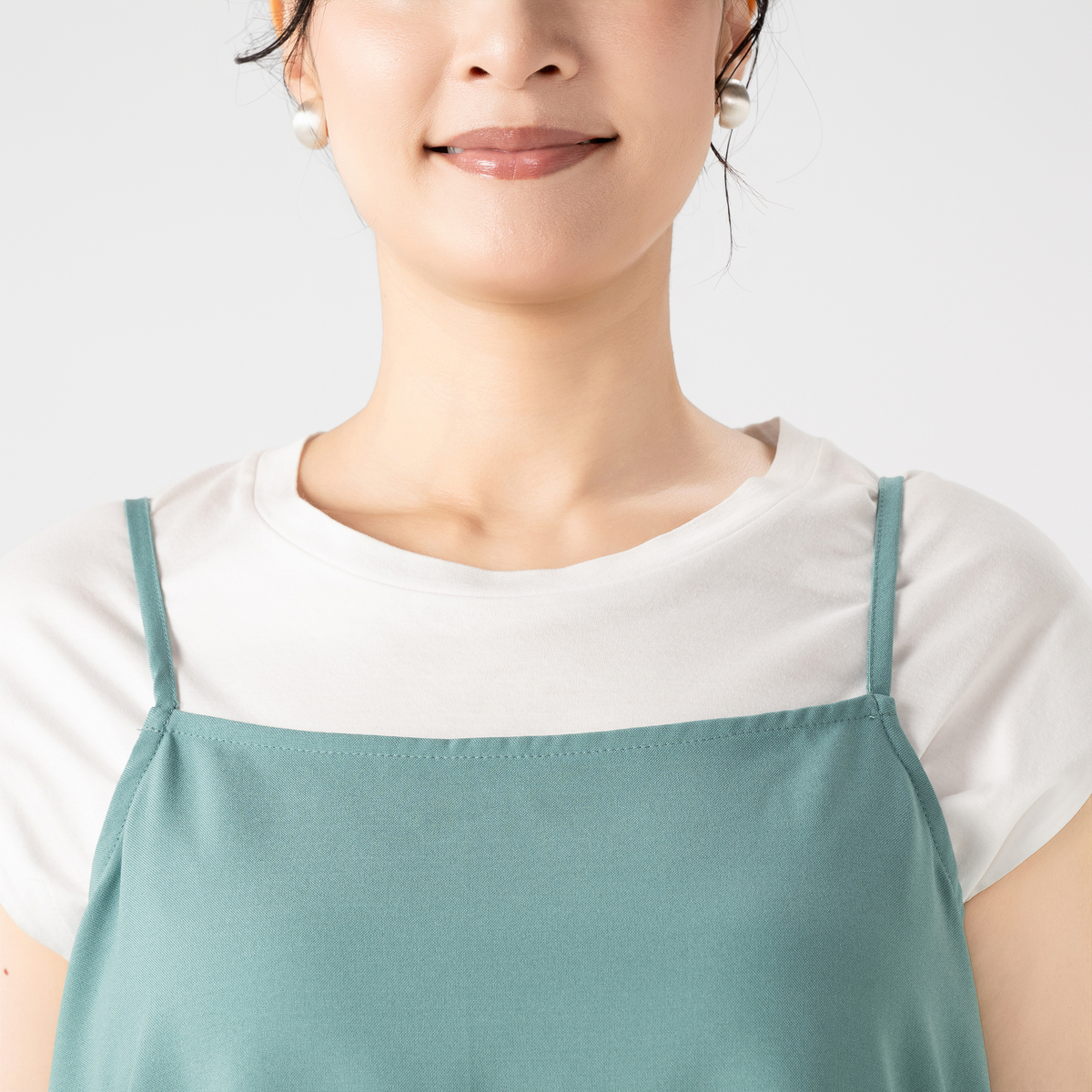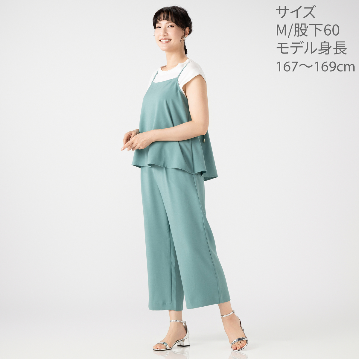 キャミソールは肩紐で調節でき、パンツは後ろ全体がゴム仕様で引っ張って穿けるプルオンタイプ。フロントにタック入りで、両脇にポケットも付いています。股下は60cmまたは65cmから選べます
