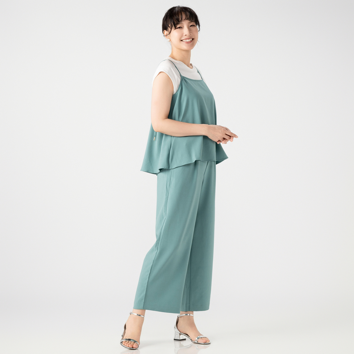 キャミソールとワイドパンツのセットアップ。麻素材のような杢調に染色が出る素材を使用。ポリエステル混素材のためシワになりにくく、軽くてさらりとした肌ざわりです。細めの肩紐やひらひらとした裾が可愛らしく、腰まわりの体形カバーも期待できます