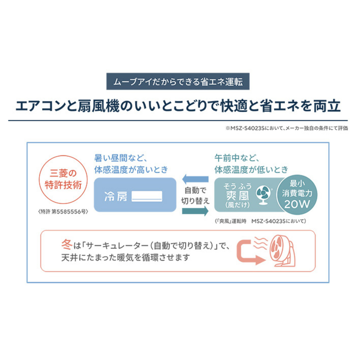*1)三菱の特許技術(特許第5585556号)/「体感」設定時のみ。センサーが感知する情報は 天井、間取り、状態、壁、床/“ムーブアイ”は、室内機の直下近傍を見ることができません。犬や猫は検知しません。人の動き・状態、広さなどにより正しく検知できないことがあります