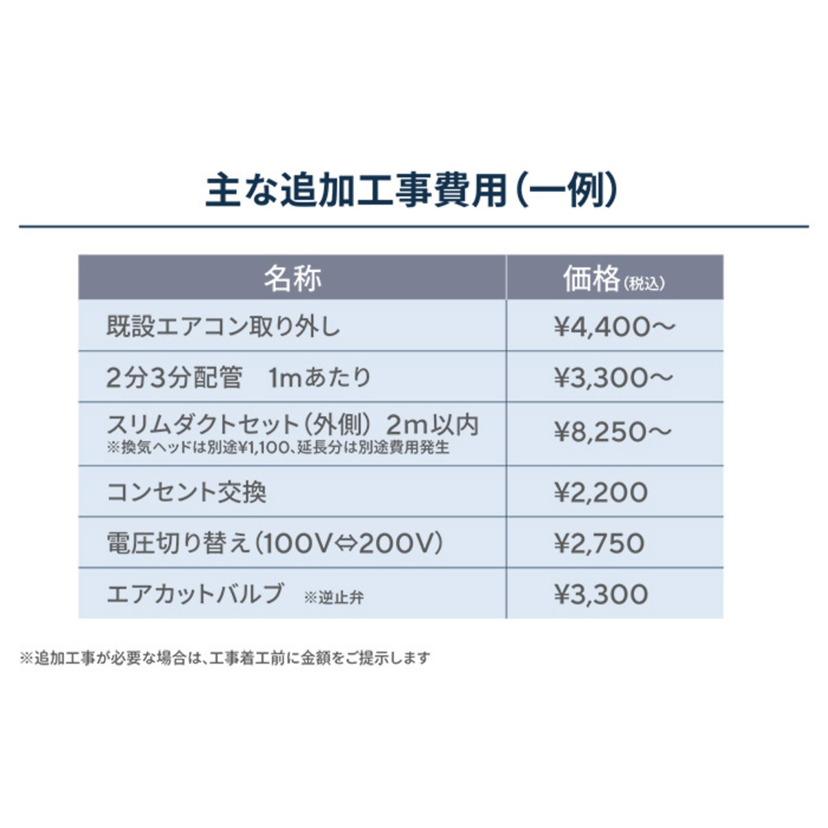 標準取り付け工事の内容は、下記をご参照ください。<標準工事内容>■室内機の設置(穴あけ含む)■配管(4mまで)■室外機設置(地面またはベランダ設置)■プラスチックブロック ■配管のテープ巻き※配管パイプの長さが4m以上であったり、室外機を屋根などに設置したりと、標準取り付け工事の内容に当てはまらない場合は、追加料金にて承ることが可能です。詳しくは工事業者からの連絡時にお問い合わせください