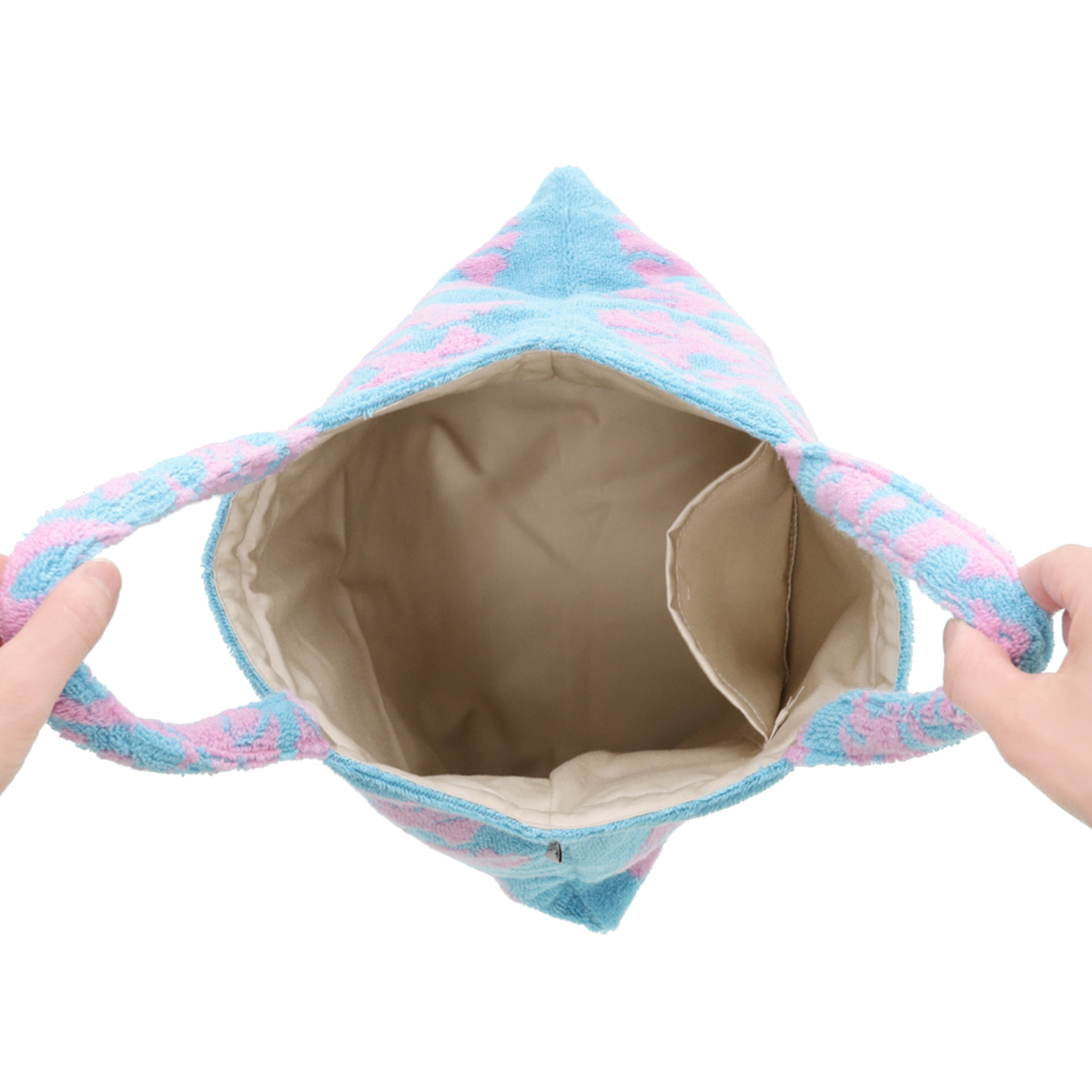 [サイズ(約)] 縦32×横32×マチ1cm ハンドル立ち上がり:16cm [重量(約)] 150g [素材] 表地:綿100% 裏地:綿100% [仕様] 開閉:オープン式 底ビョウ:無 [ポケット] 内側:オープンポケット×1 外側:無 [注意事項] ※初めのうちは、色が多少出ることがありますので、白物と一緒に洗わないで下さい ※洗濯後は、すぐ干して下さい。塩素系漂白剤は、使用しないでください ※水道水中の塩素により、色が変わる事がありますので、すすぎは短時間で行ってください ※パイルは他のものに引っかかりやすいので、ネット洗いをお勧めします ※破損の原因となりますので、尖ったものや鋭利なものは入れないで下さい ※最初より2〜3回の洗濯時には色落ちすることもありますので白いものと一緒に洗わないで下さい ※この商品は糸及び組織の性質上、他の物に引っ掛かりやすいので、単独で洗うか洗濯ネットをお使いください ※クリーニングの際はクリーニングネットを使用し、静止型の乾燥機をお使いください ※ネット使用 ※つけ置き禁止 ※点止めつり干し禁止 ※あて布使用 ※弱く絞る 【中国製】