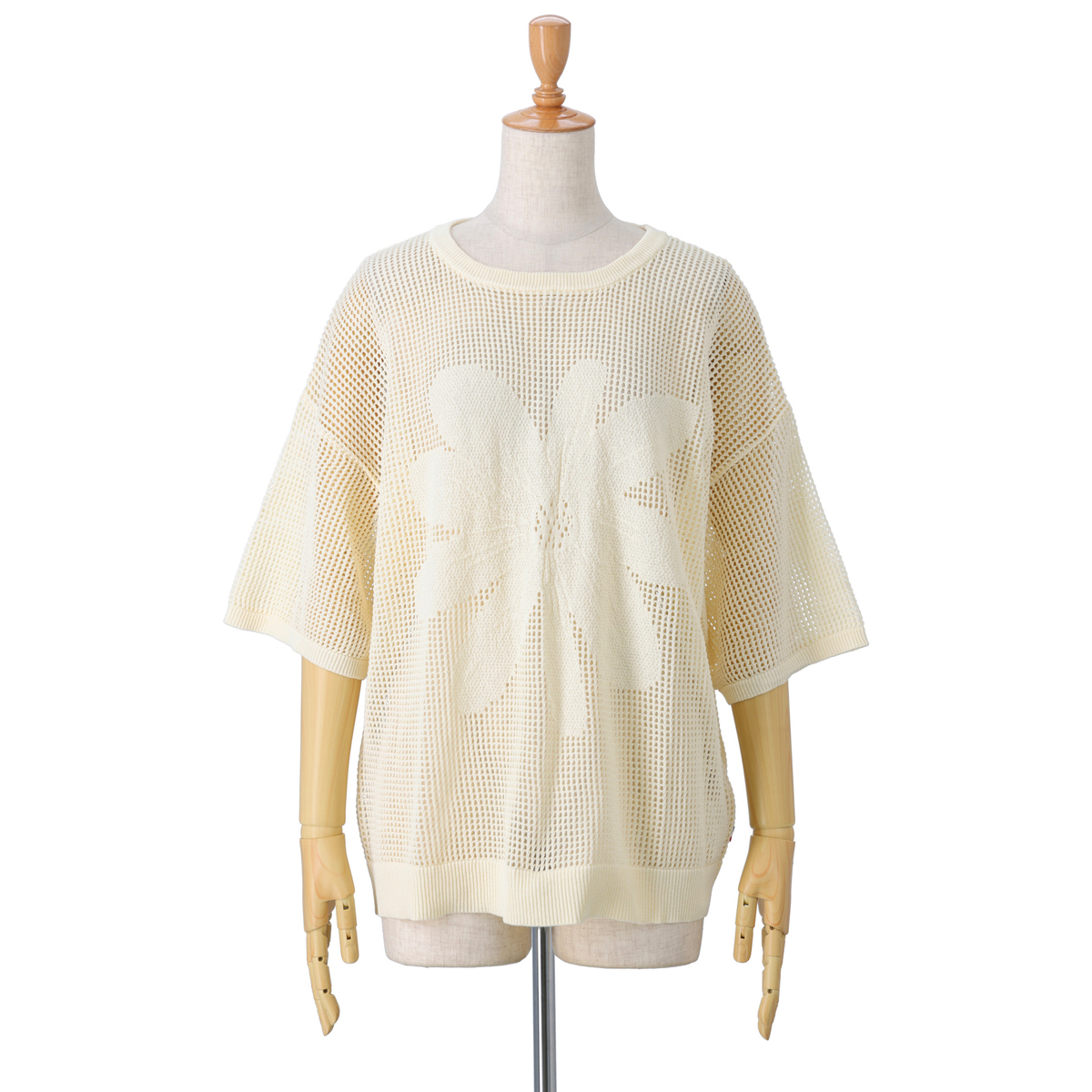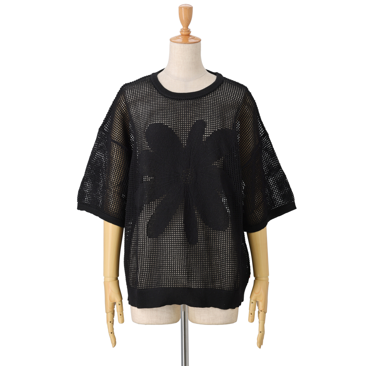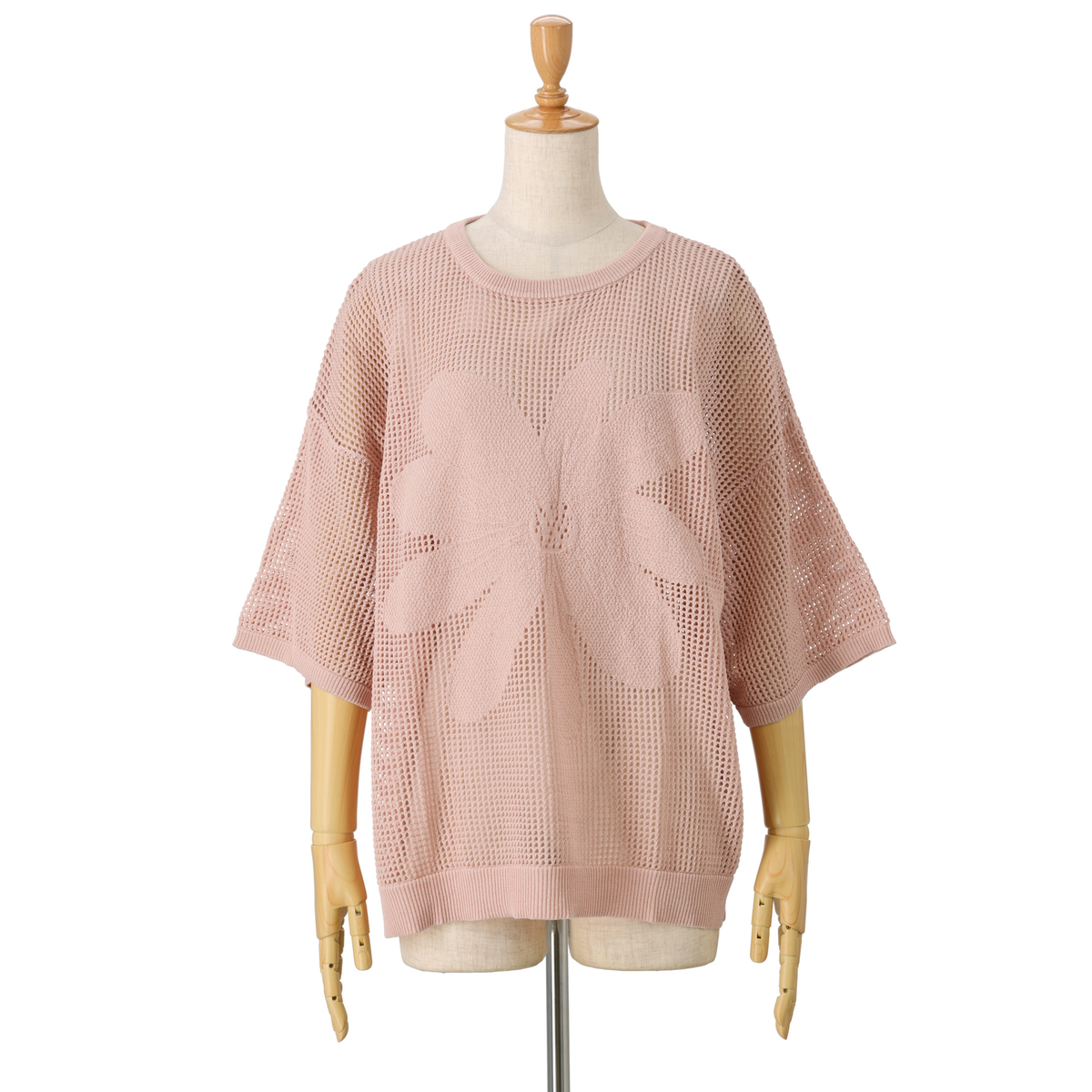 前身頃の大きな花のジャガードが目を引くニットトップス。軽やかな着心地とヘルシーな透け感で、大人可愛いスタイルを演出します