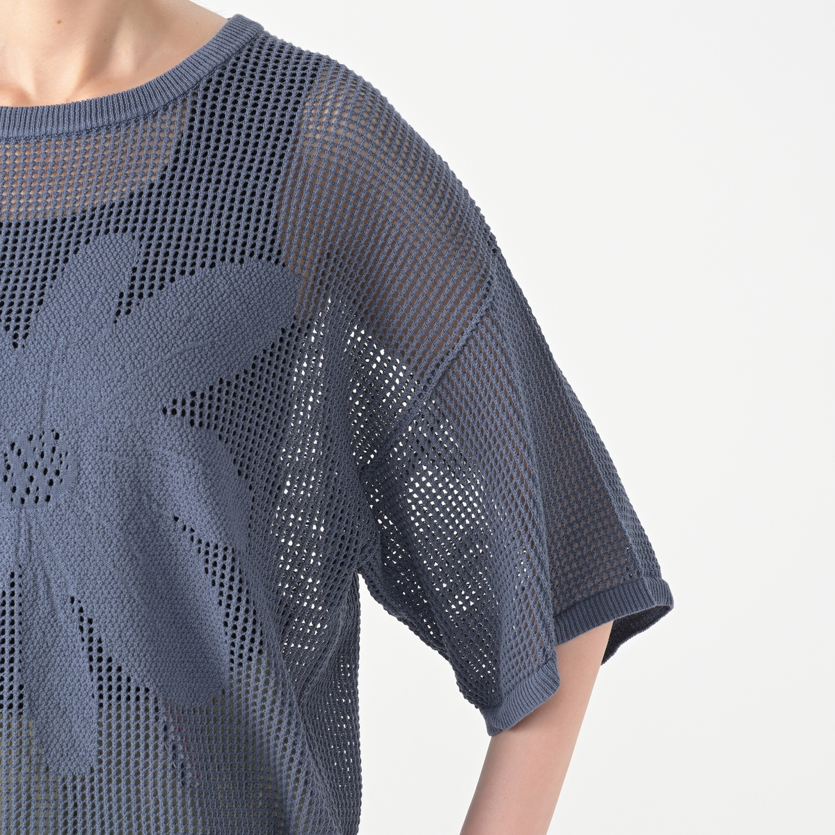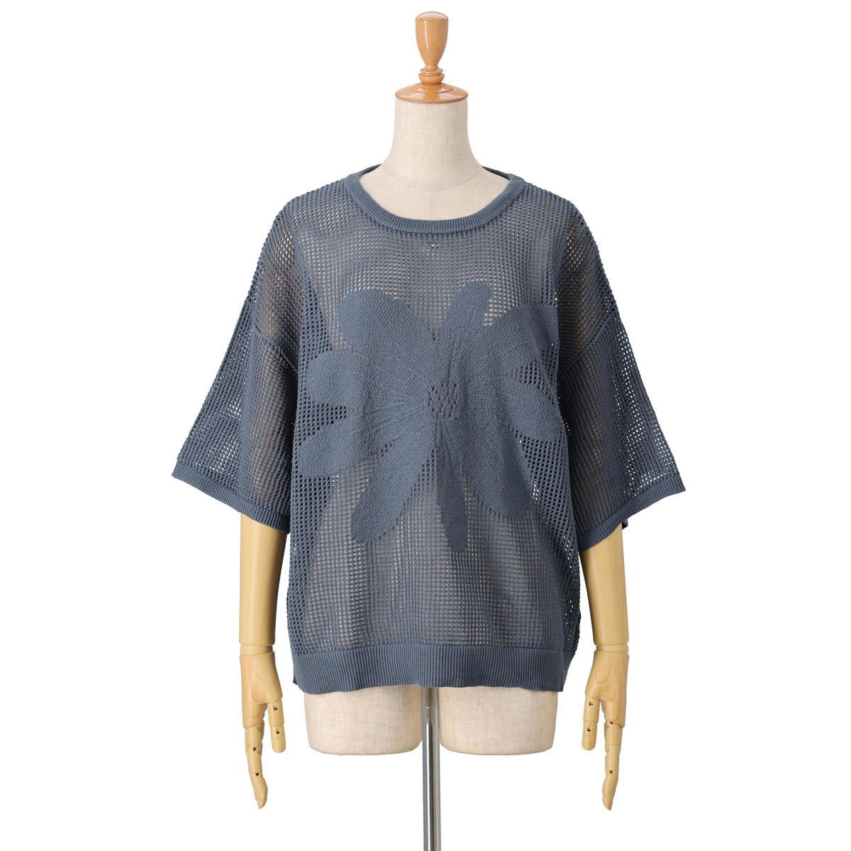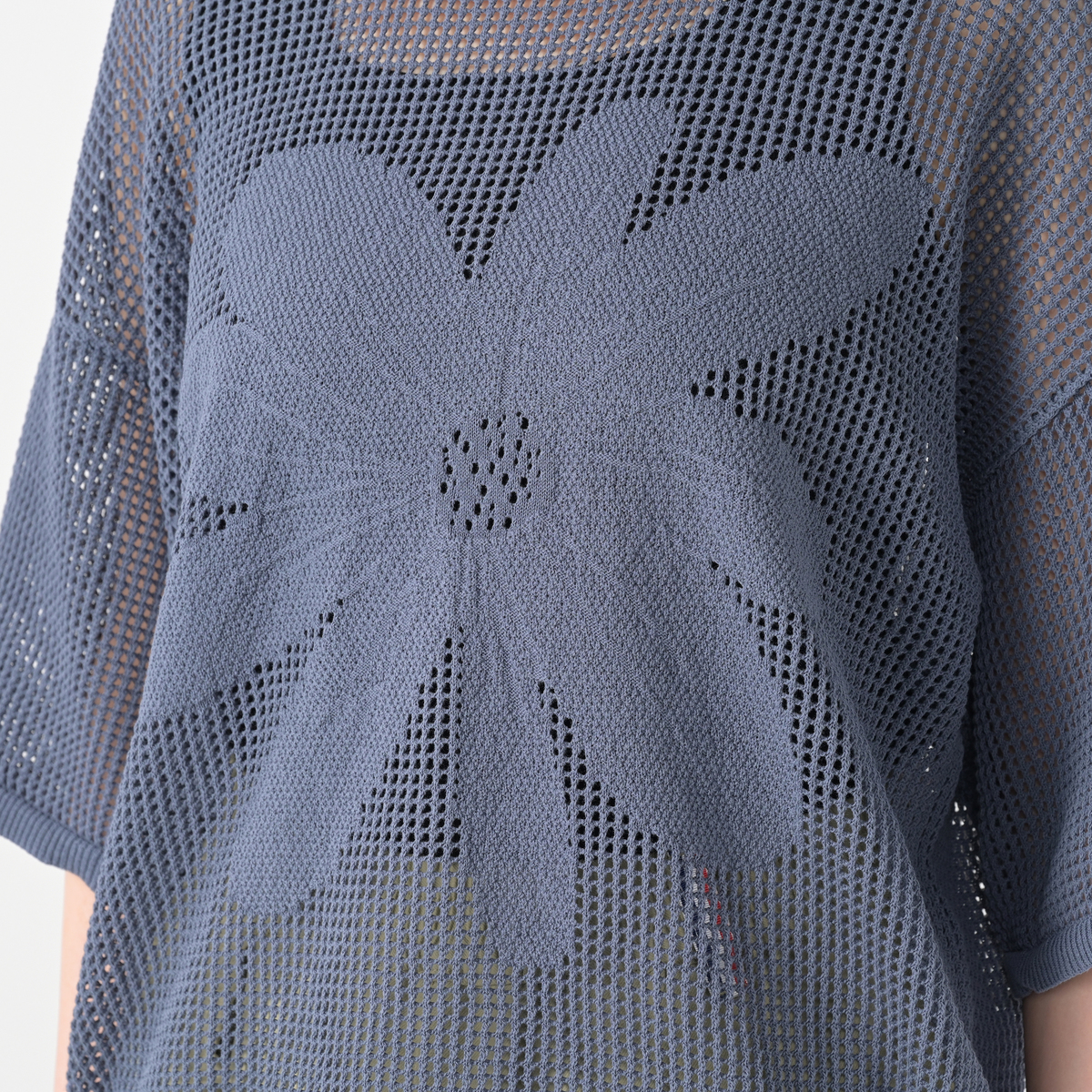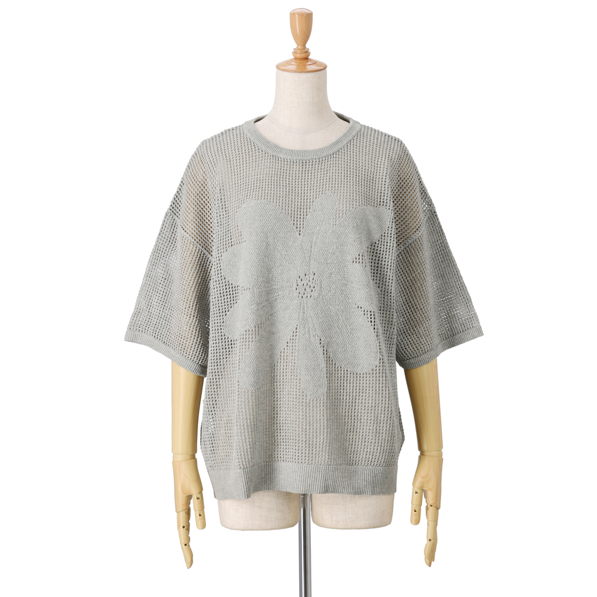 前身頃の大きな花のジャガードが目を引くニットトップス。軽やかな着心地とヘルシーな透け感で、大人可愛いスタイルを演出します