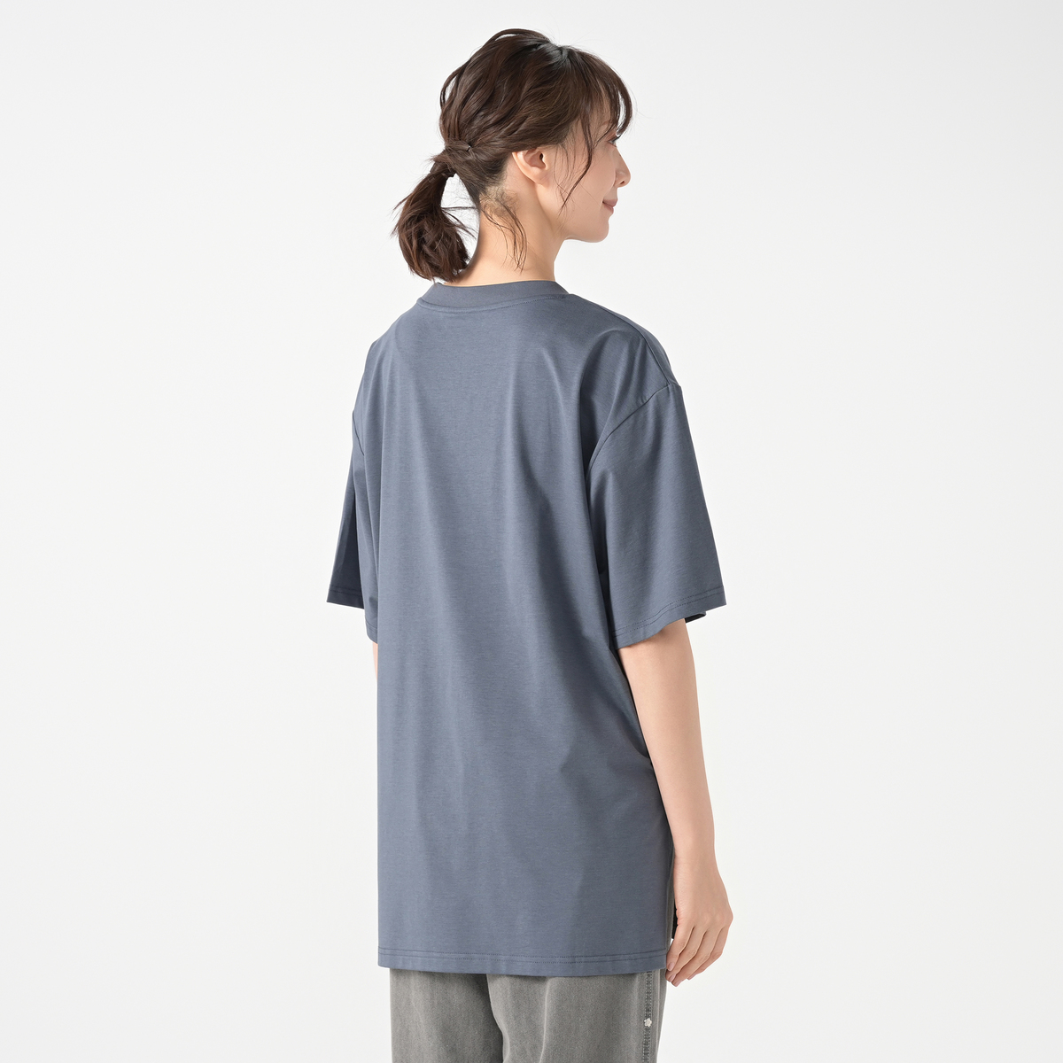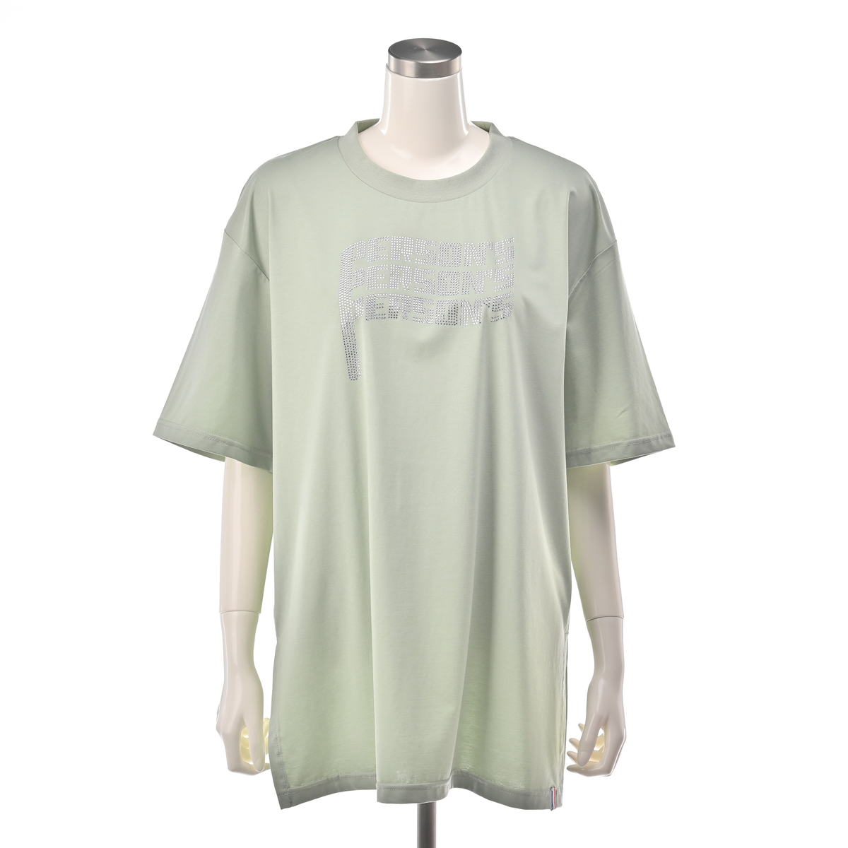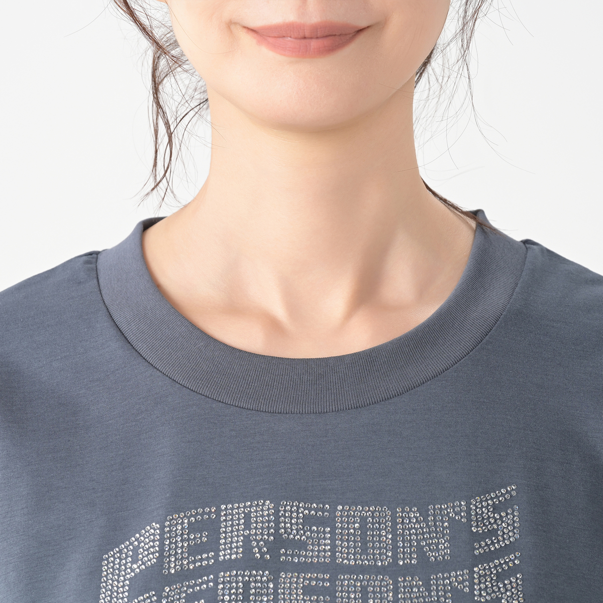 ラインストーンのロゴが上の方にあるのでサマーデニムジャンスカと一緒に着ると絶妙に位置が合います。ただチュニック丈なのでラインストーンが上の方にある分、下の余白部分が増えるのでTシャツ単独で着ると体が大きく見えてしまうかもしれません。生地は薄めのサラサラで涼感があり猛暑の中でも着やすいです。