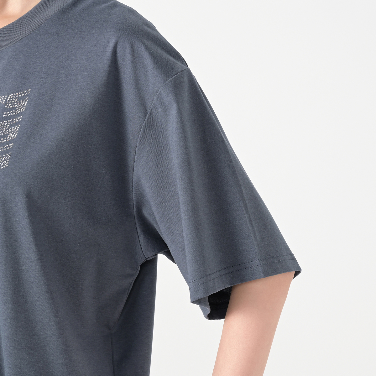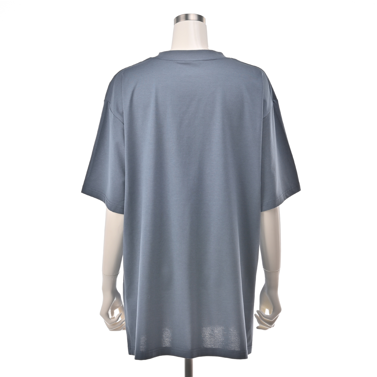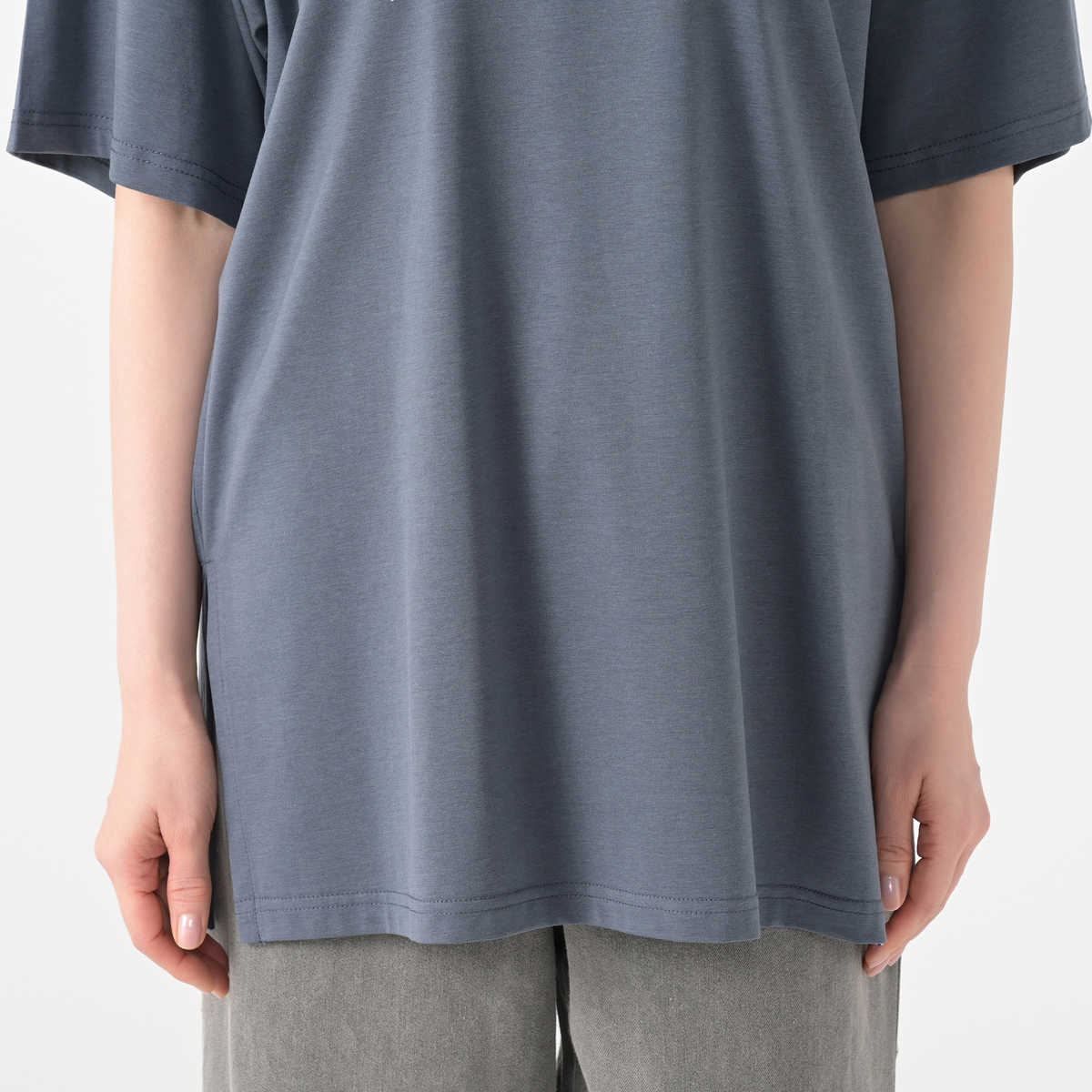 ラインストーンのロゴが上の方にあるのでサマーデニムジャンスカと一緒に着ると絶妙に位置が合います。ただチュニック丈なのでラインストーンが上の方にある分、下の余白部分が増えるのでTシャツ単独で着ると体が大きく見えてしまうかもしれません。生地は薄めのサラサラで涼感があり猛暑の中でも着やすいです。