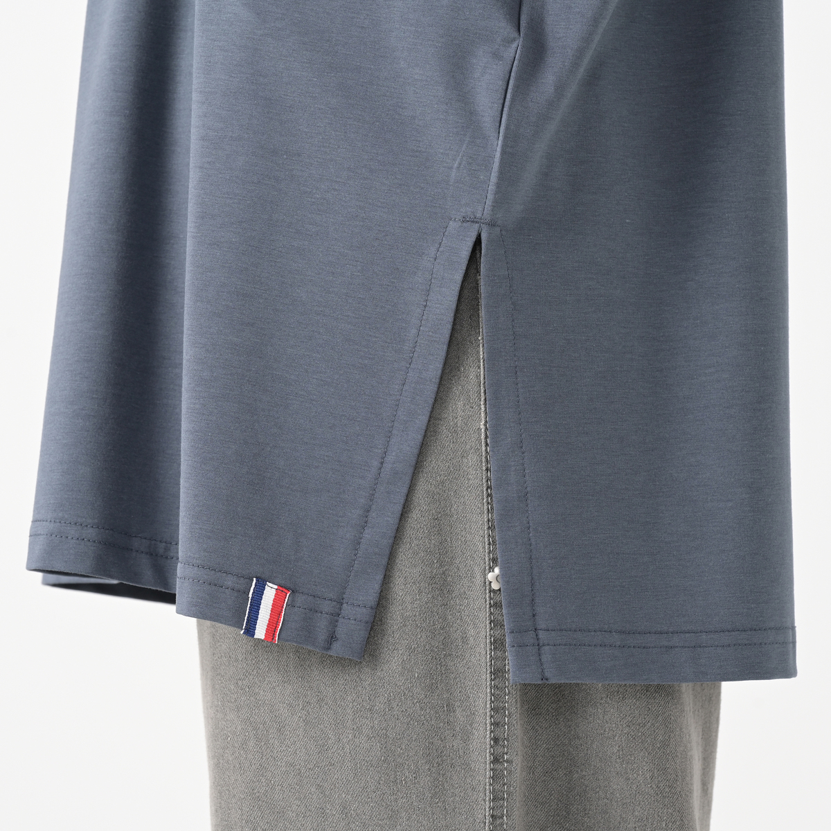 さらりとしたカットソー生地を使用したロング丈のクルーネック半袖Tシャツ。ラインストーンのロゴで旗を表現し、コーディネートのアクセントとして活躍します