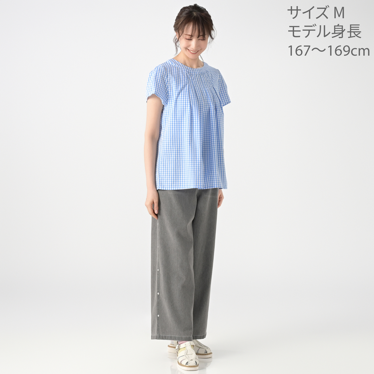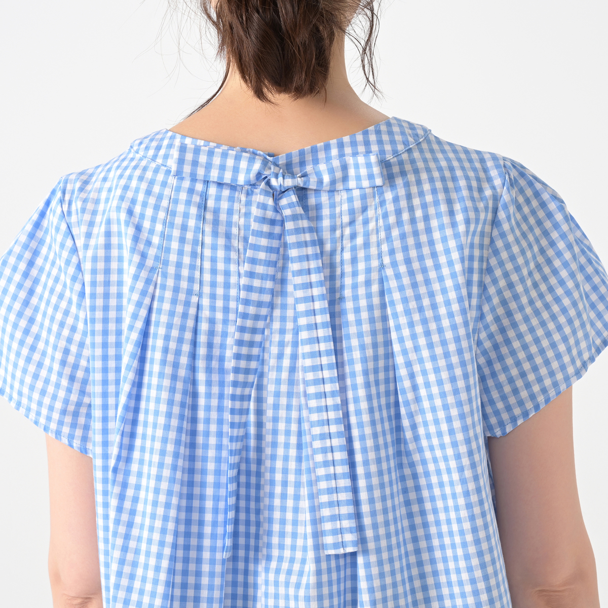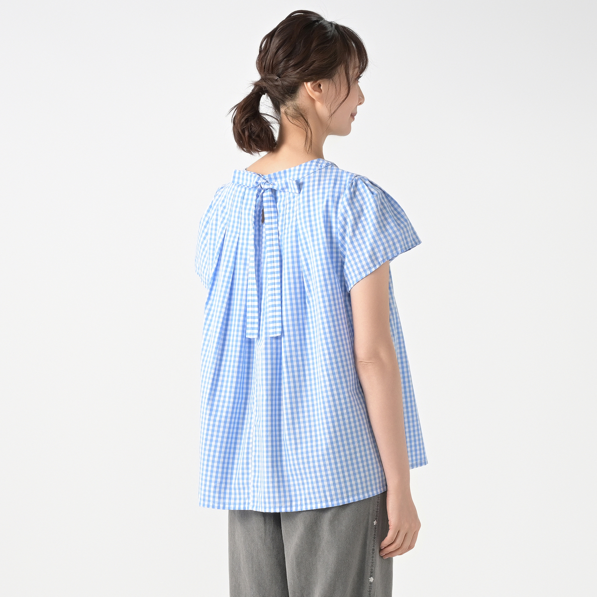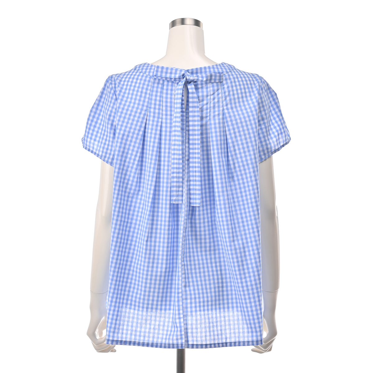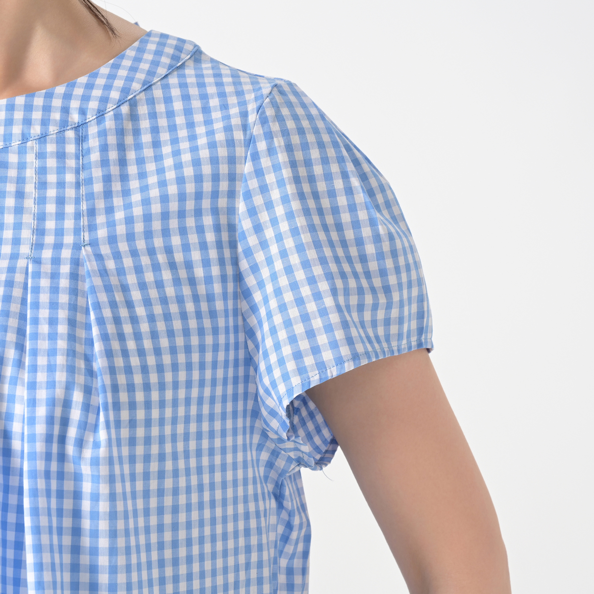 薄手のギンガムチェック素材で軽やかなブラウス。前後のタックが上品な印象を与え、立体感のあるフレンチスリーブが腕まわりをカモフラージュします