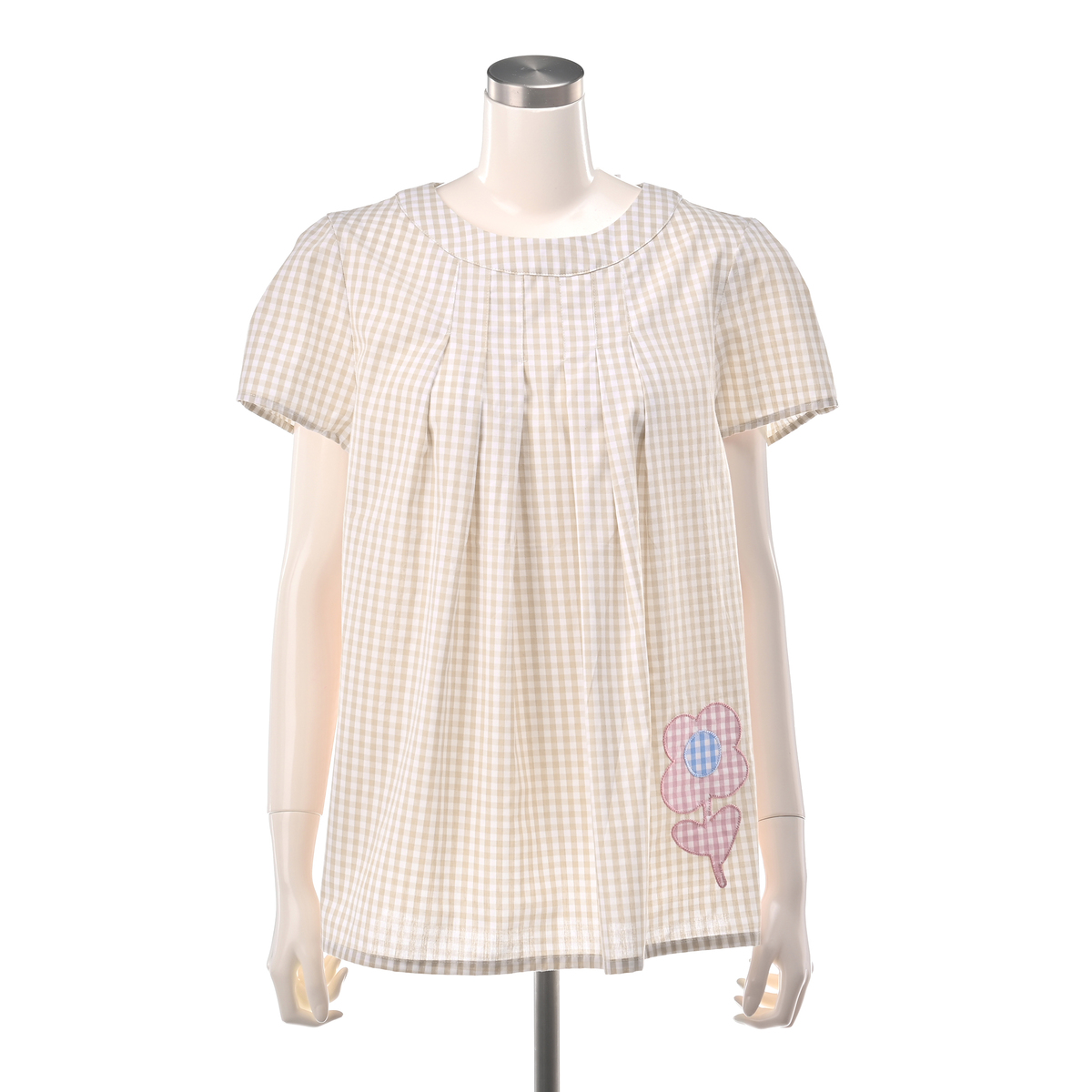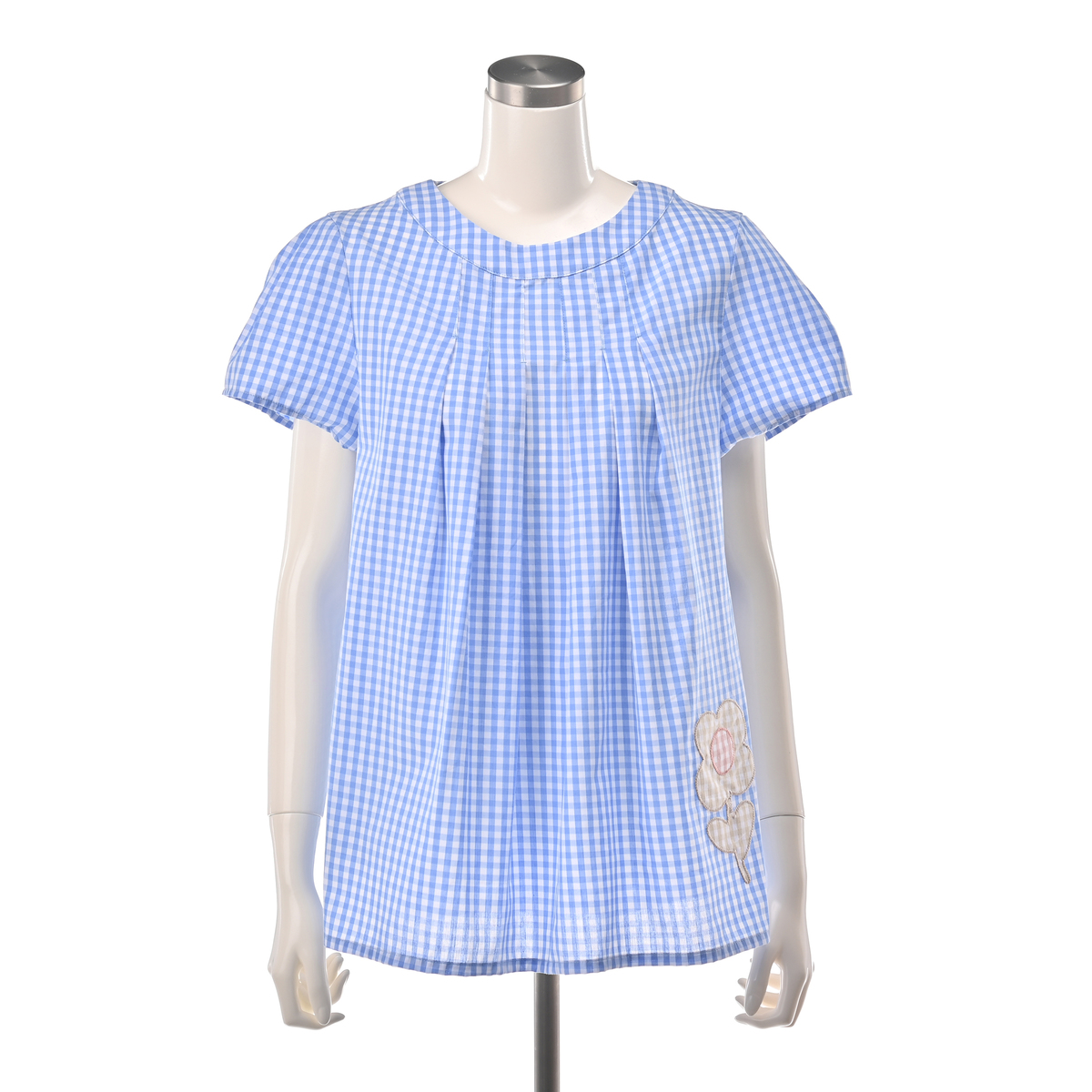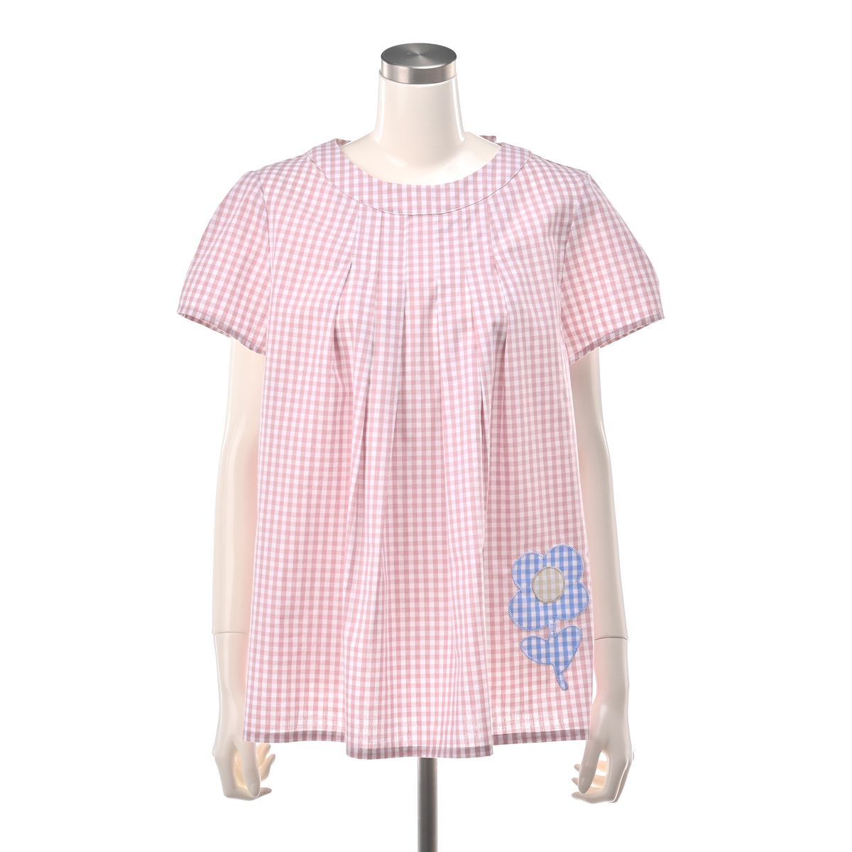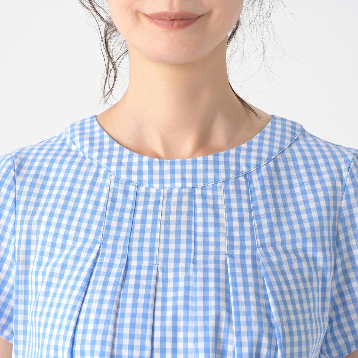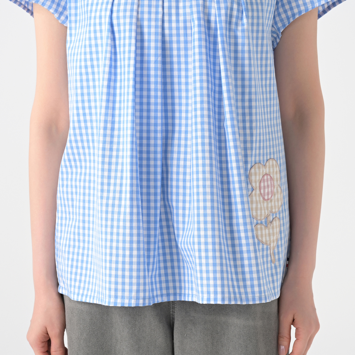 薄手のギンガムチェック素材で軽やかなブラウス。前後のタックが上品な印象を与え、立体感のあるフレンチスリーブが腕まわりをカモフラージュします