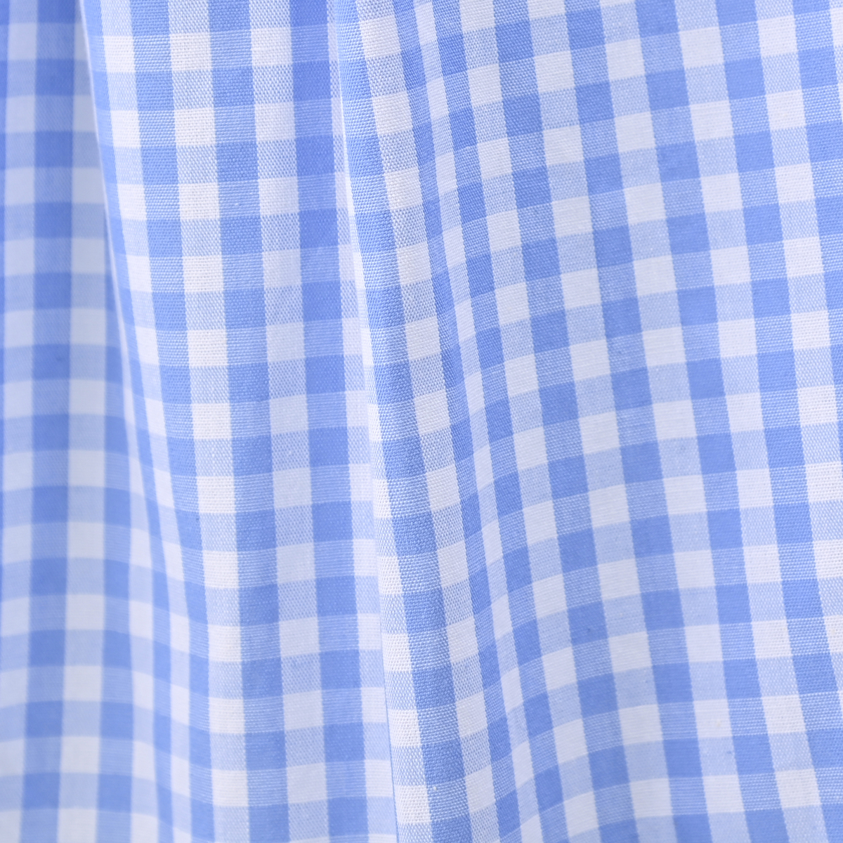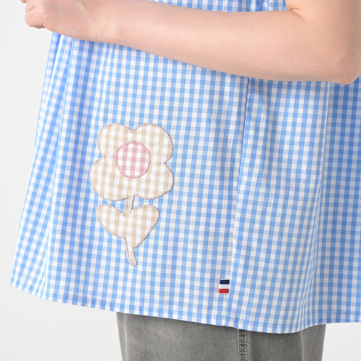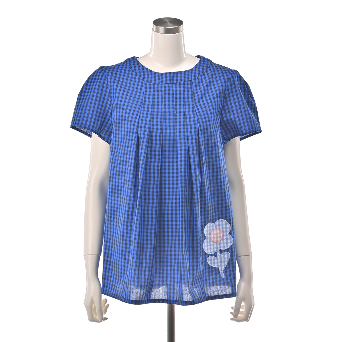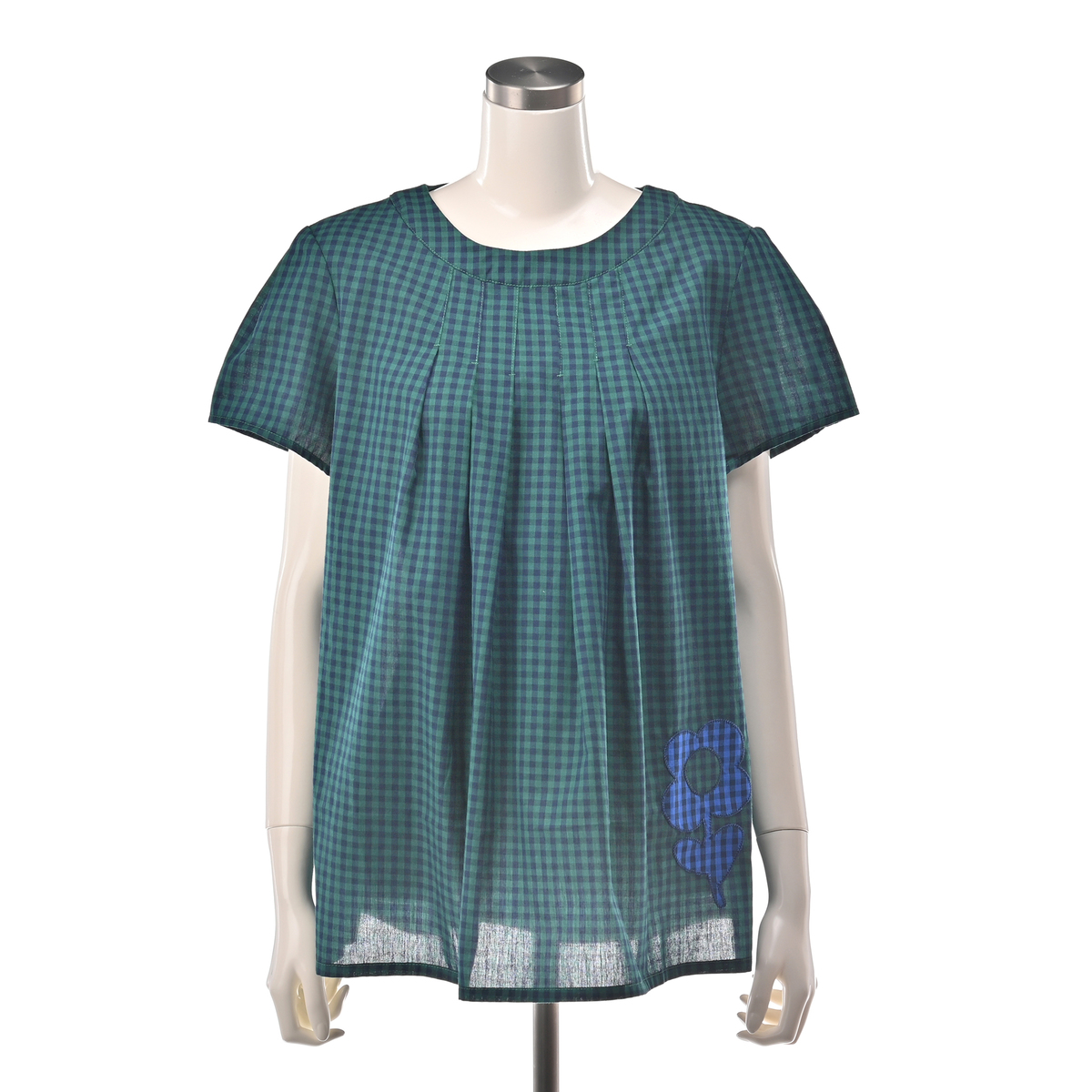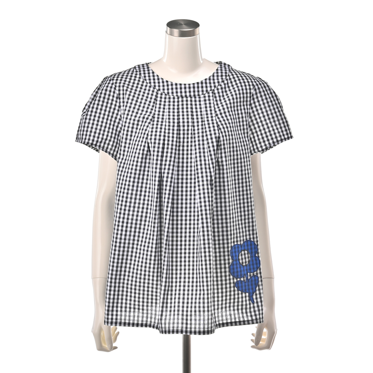 薄手のギンガムチェック素材で軽やかなブラウス。前後のタックが上品な印象を与え、立体感のあるフレンチスリーブが腕まわりをカモフラージュします