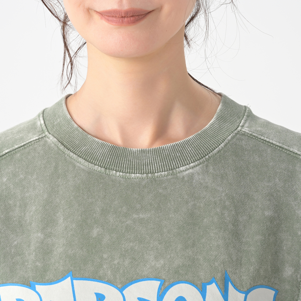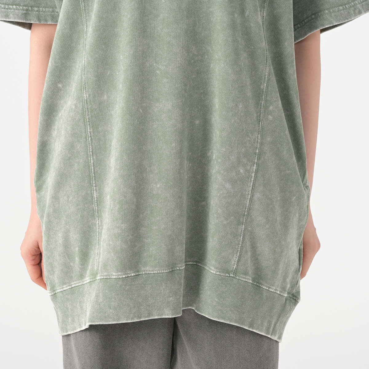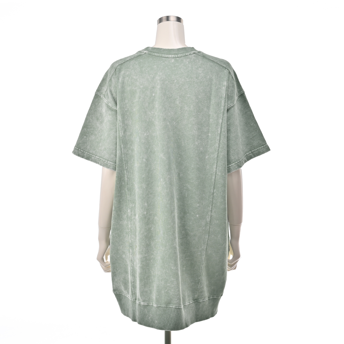 製品染め、洗い加工を施した、薄手の裏毛素材の半袖トップス。ゆったりとした着心地で、製品加工ならではの色や風合いが楽しめます