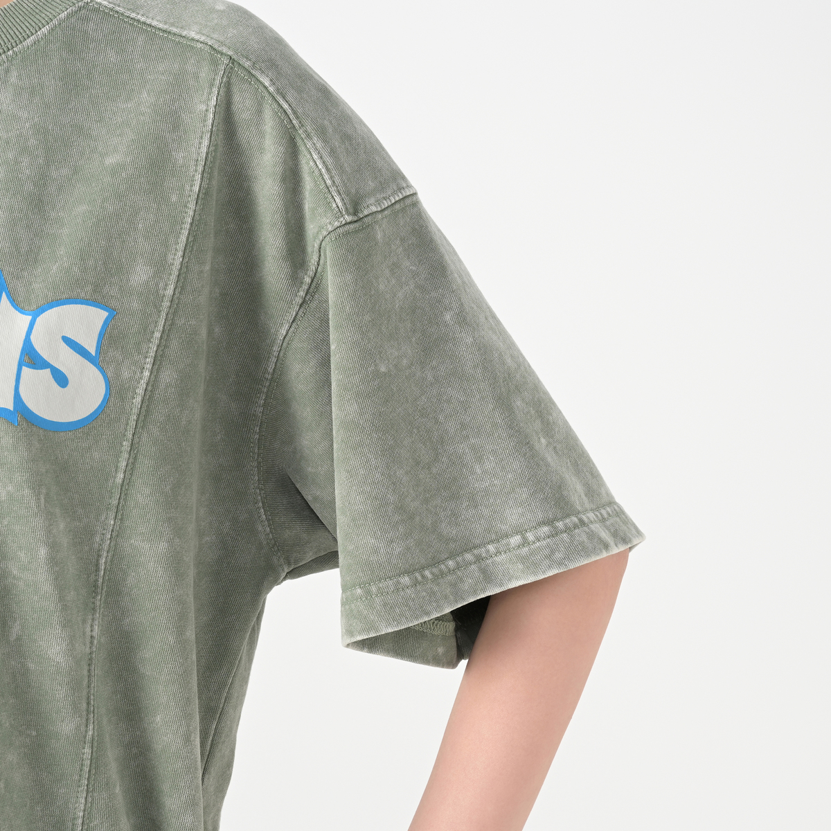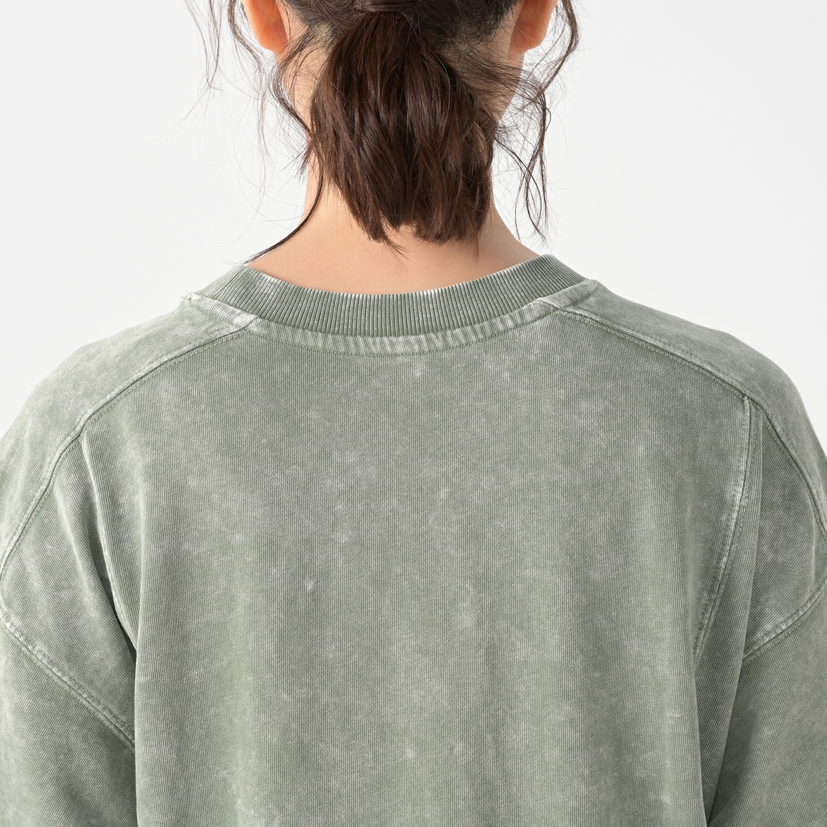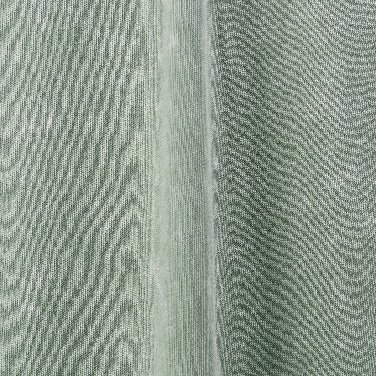 製品染め、洗い加工を施した、薄手の裏毛素材の半袖トップス。ゆったりとした着心地で、製品加工ならではの色や風合いが楽しめます