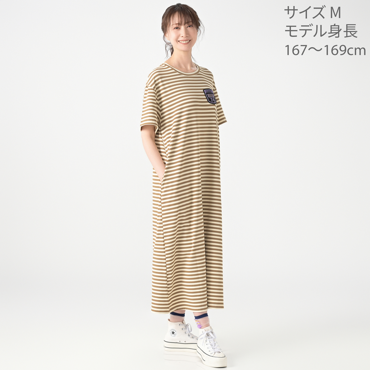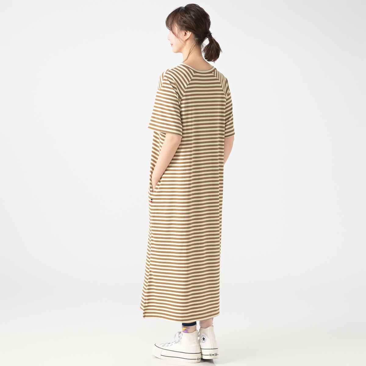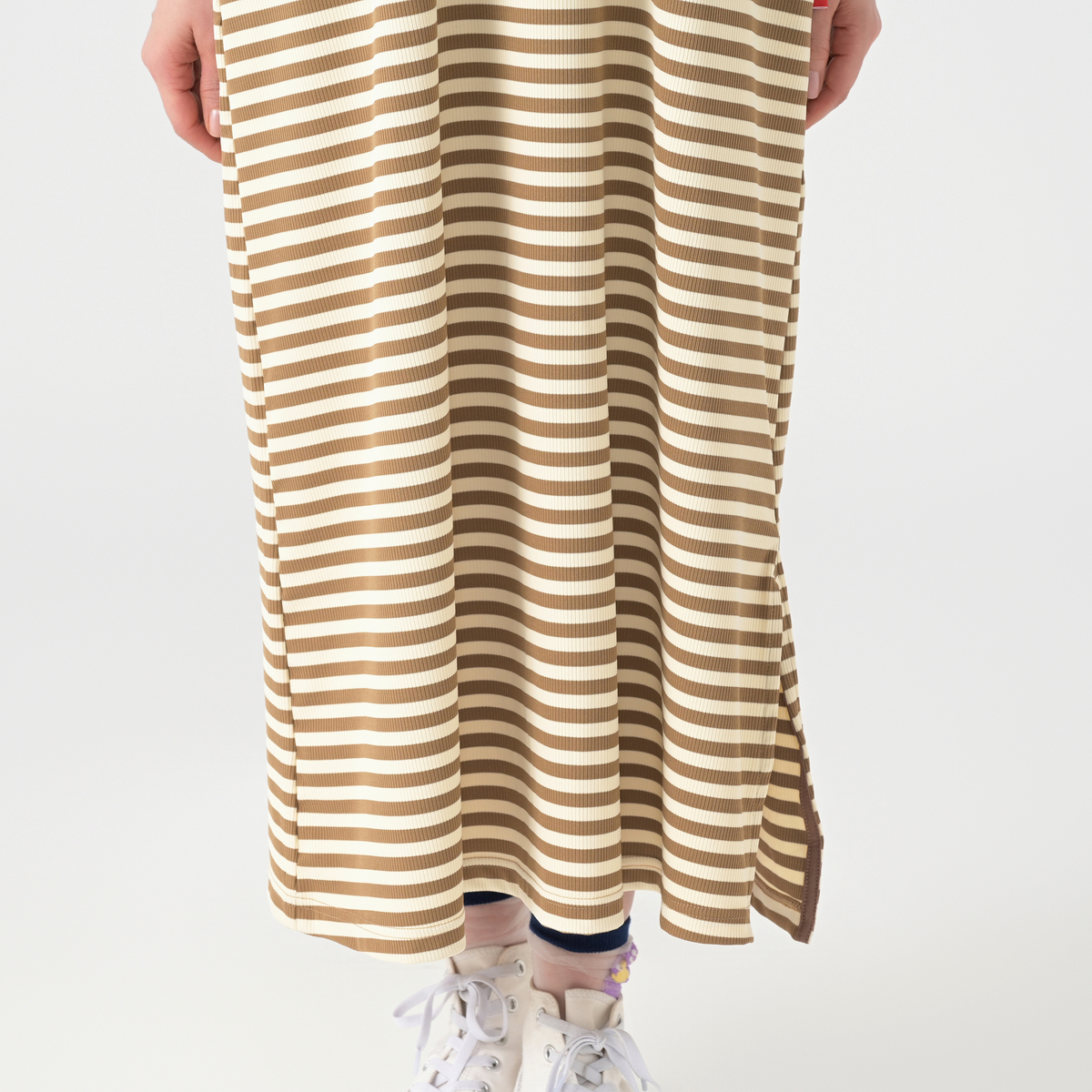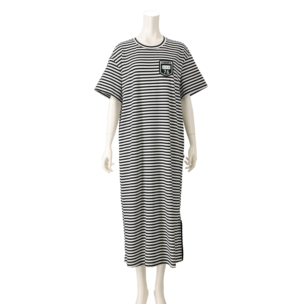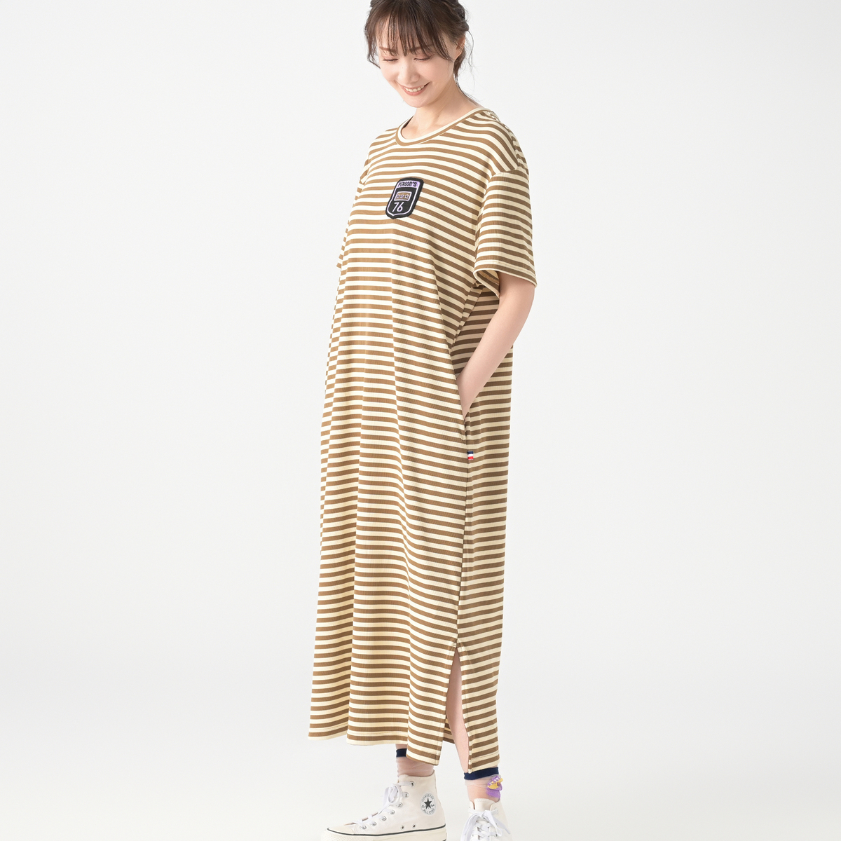 程よい薄手のリブ編みのボーダー素材を使用した半袖ロングワンピース。左裾だけ深めのスリットが入っています