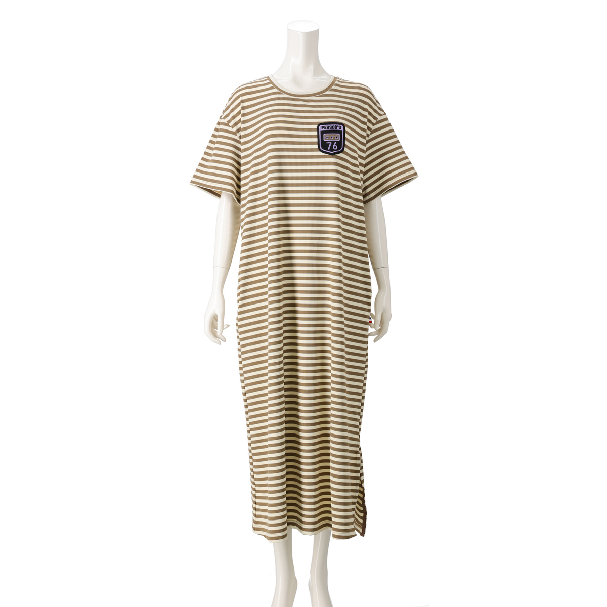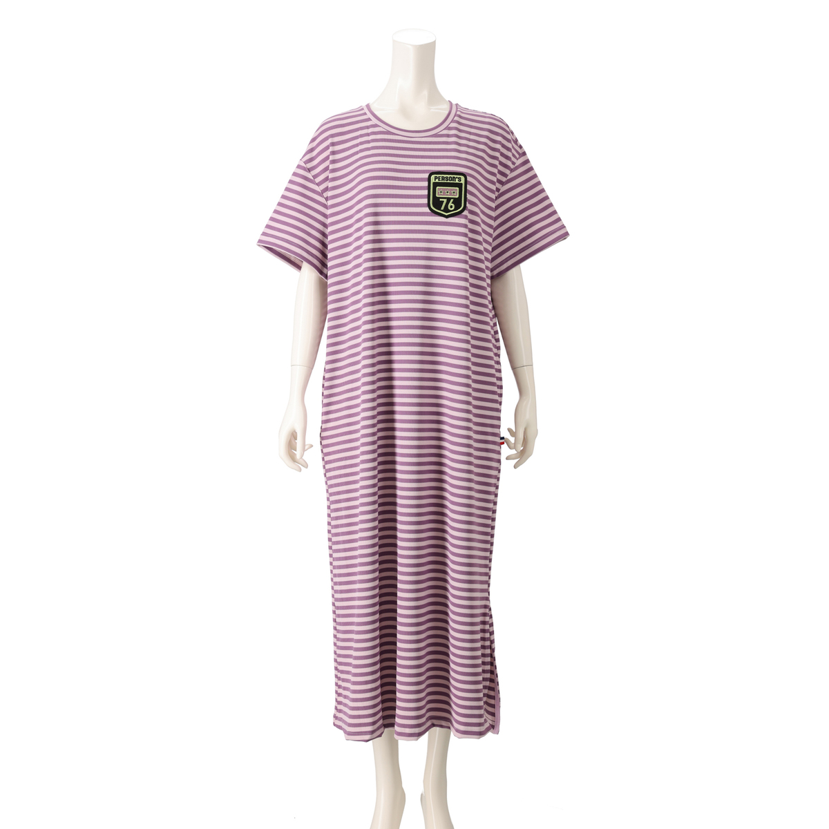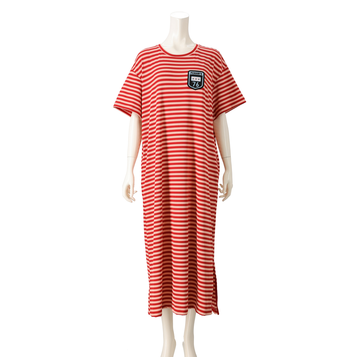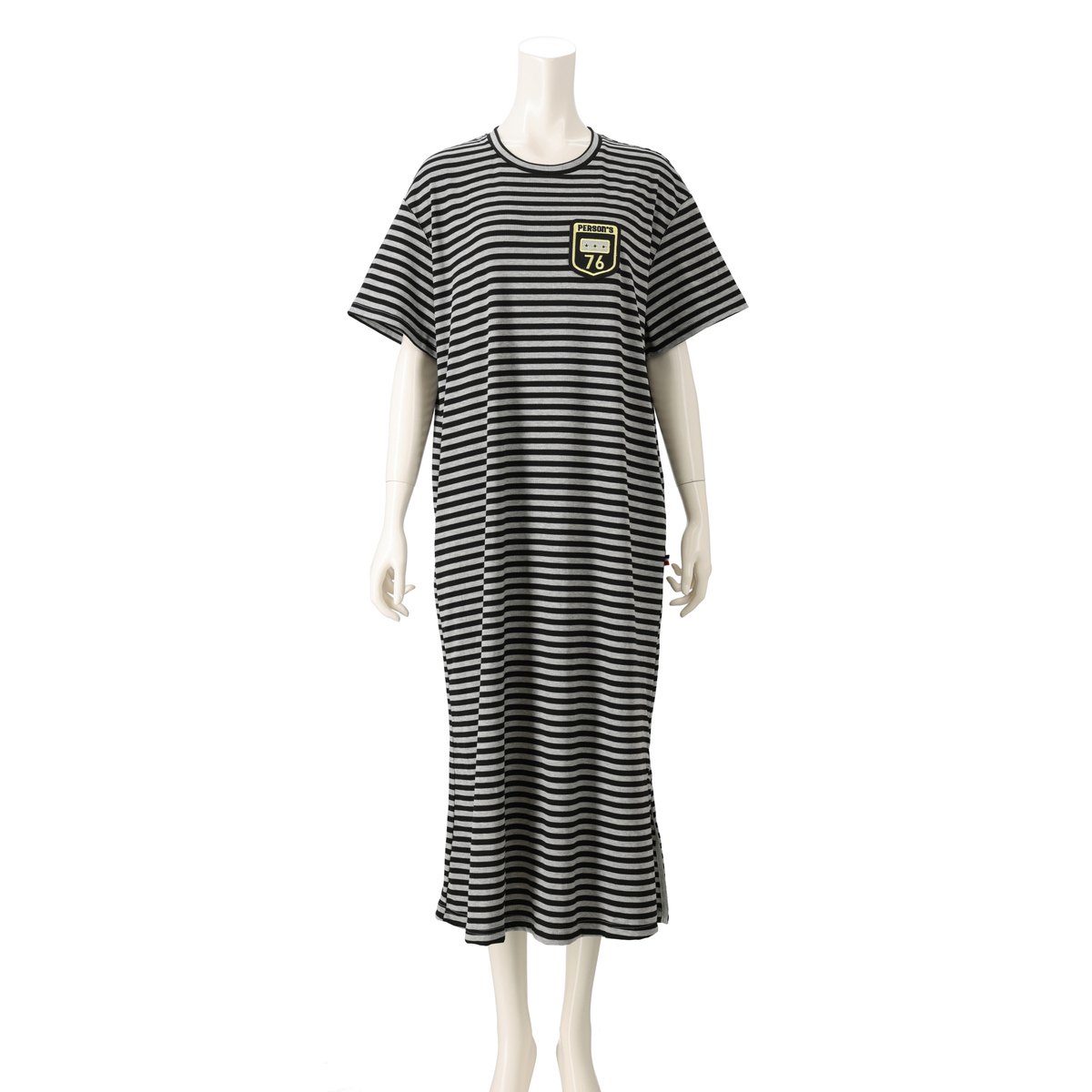 程よい薄手のリブ編みのボーダー素材を使用した半袖ロングワンピース。左裾だけ深めのスリットが入っています