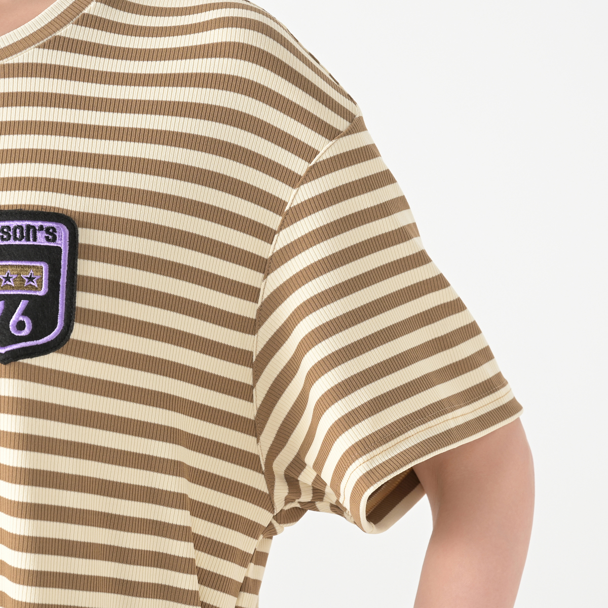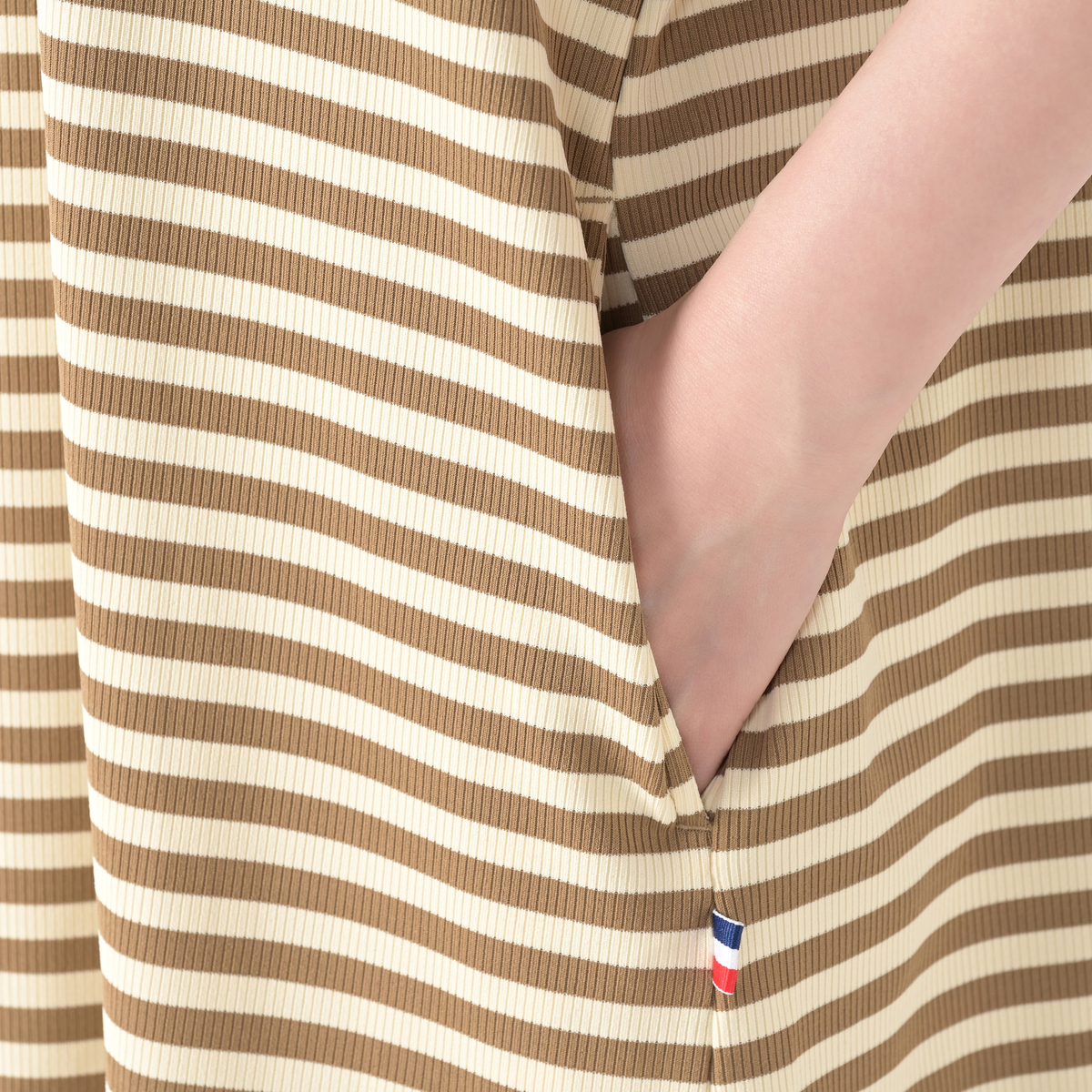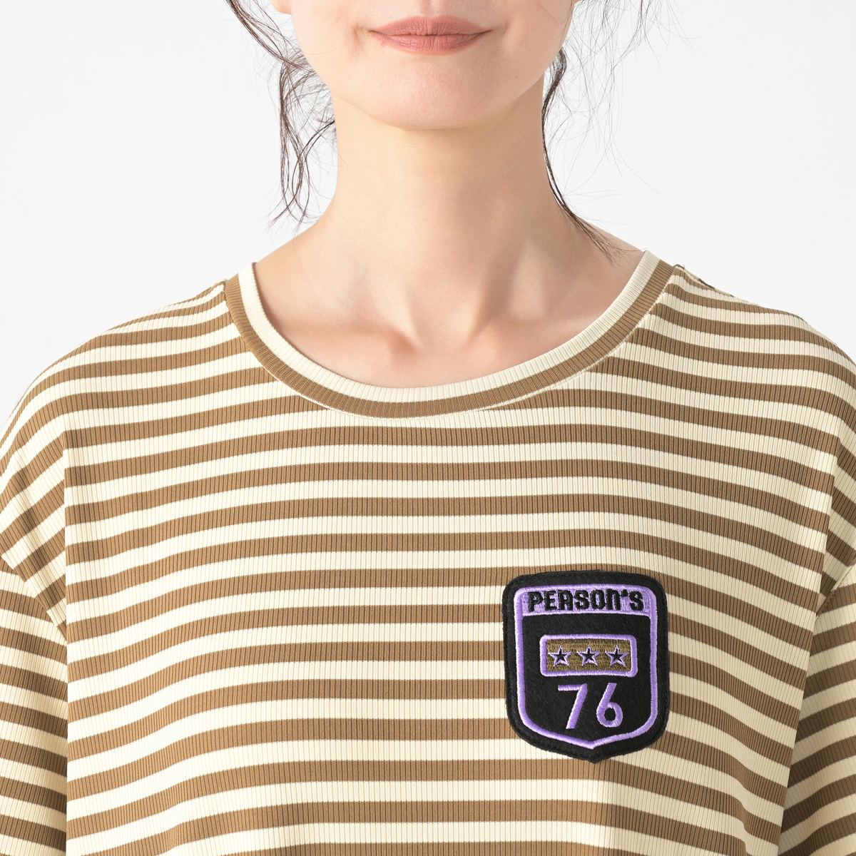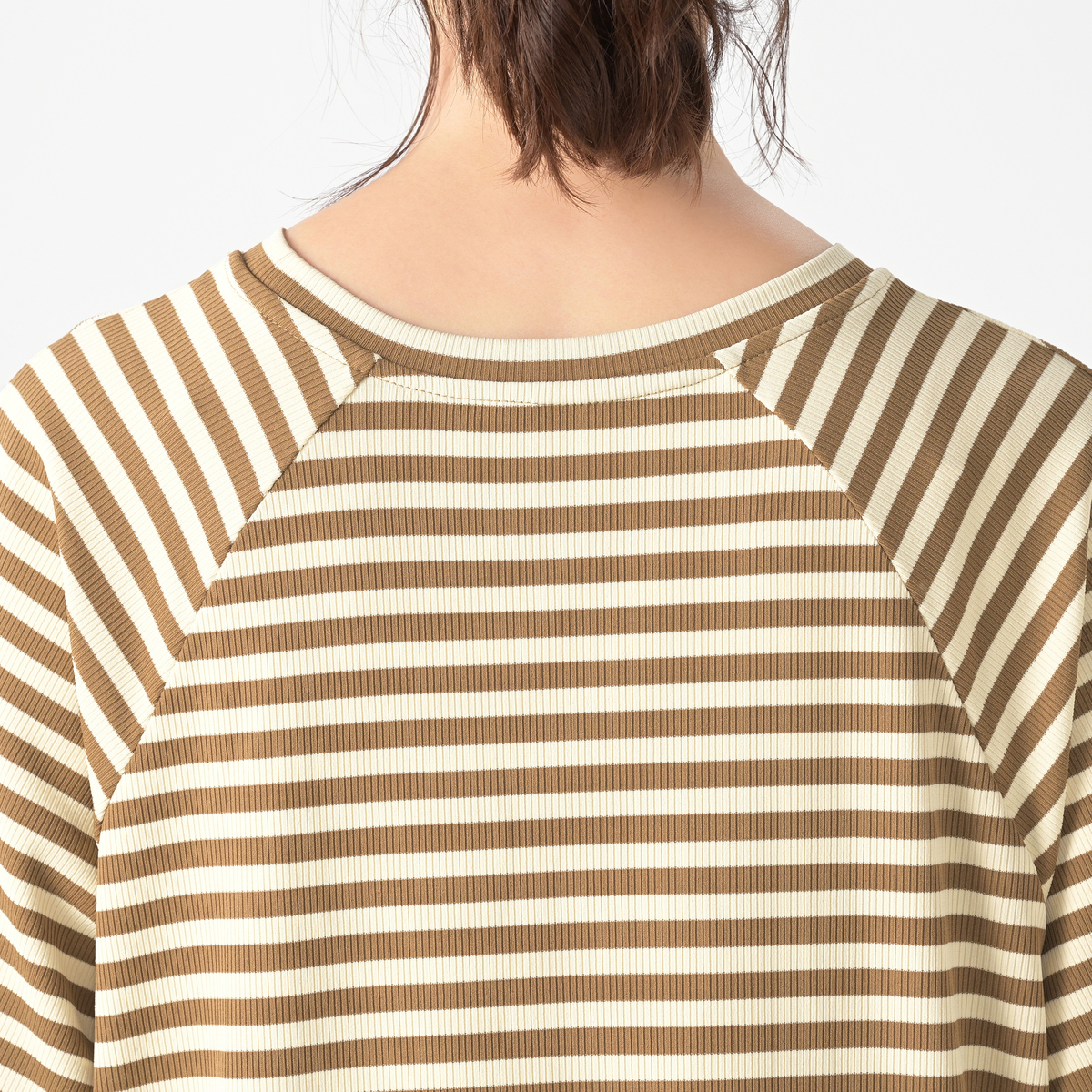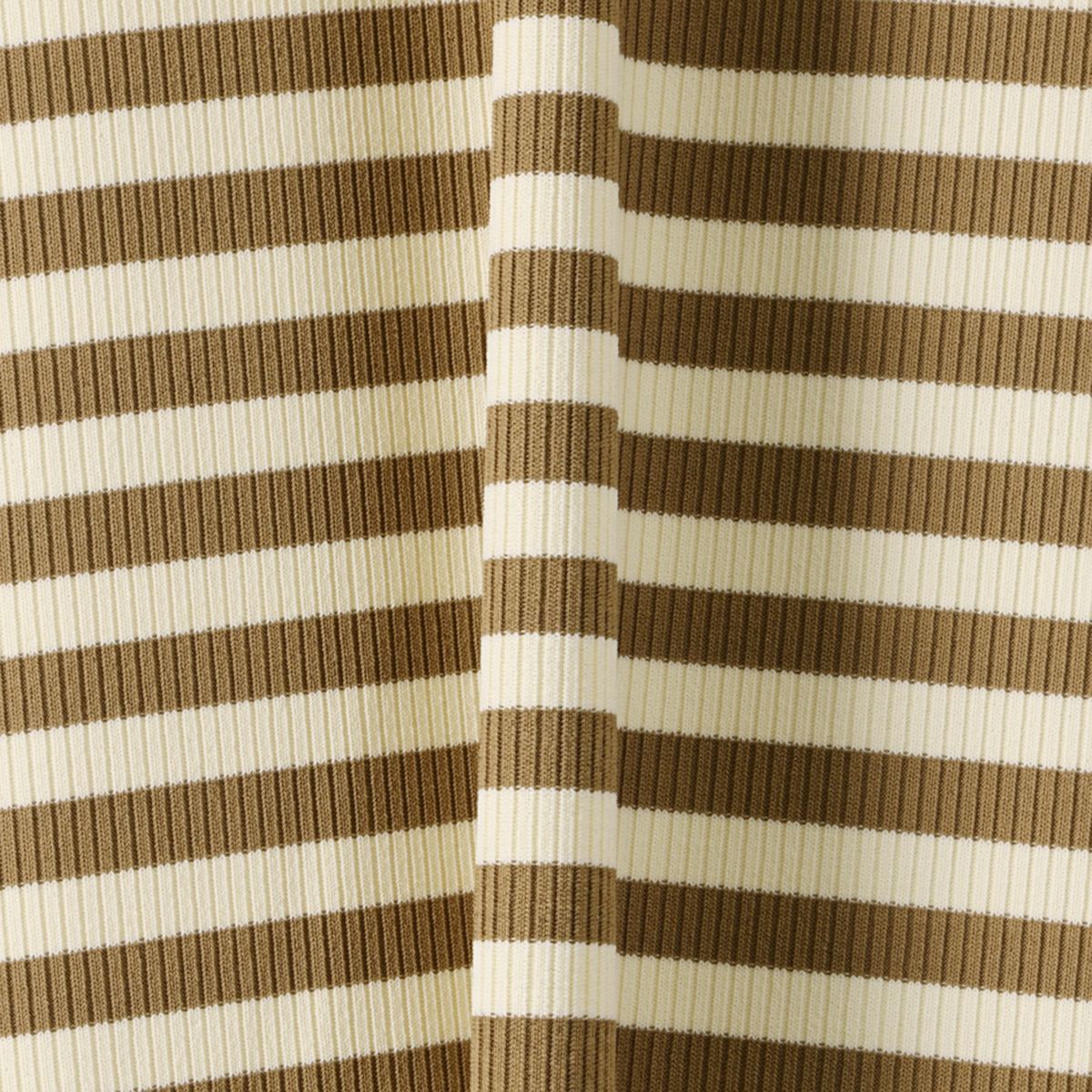 程よい薄手のリブ編みのボーダー素材を使用した半袖ロングワンピース。左裾だけ深めのスリットが入っています