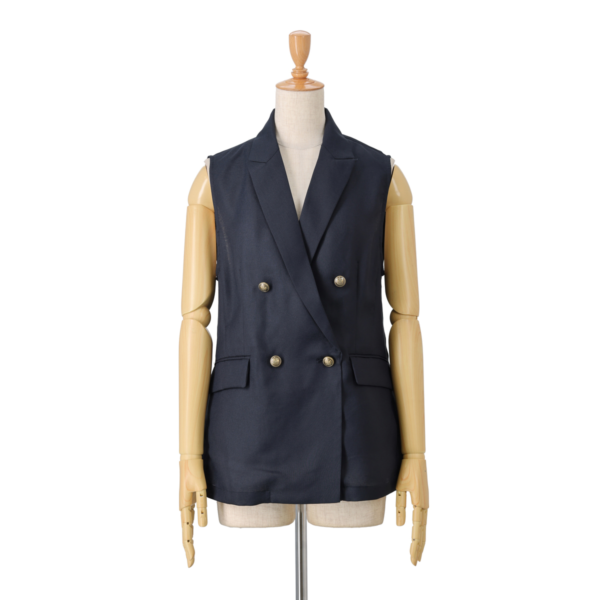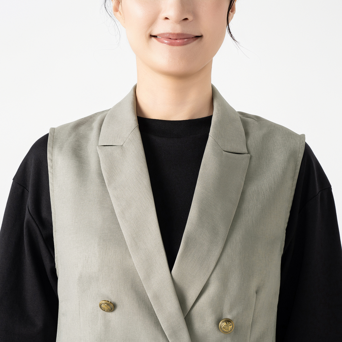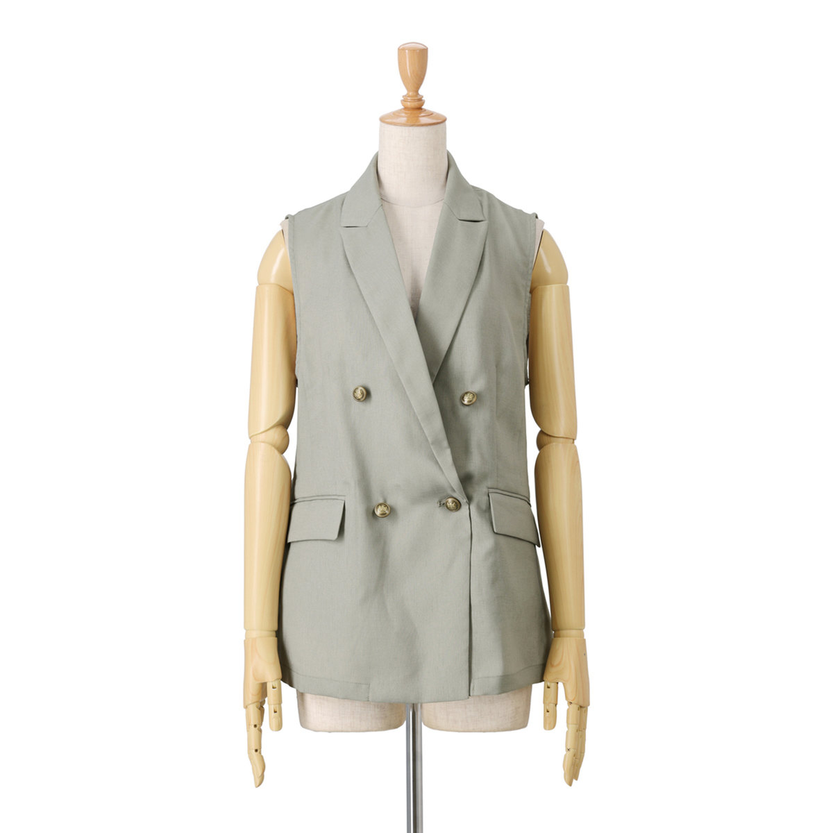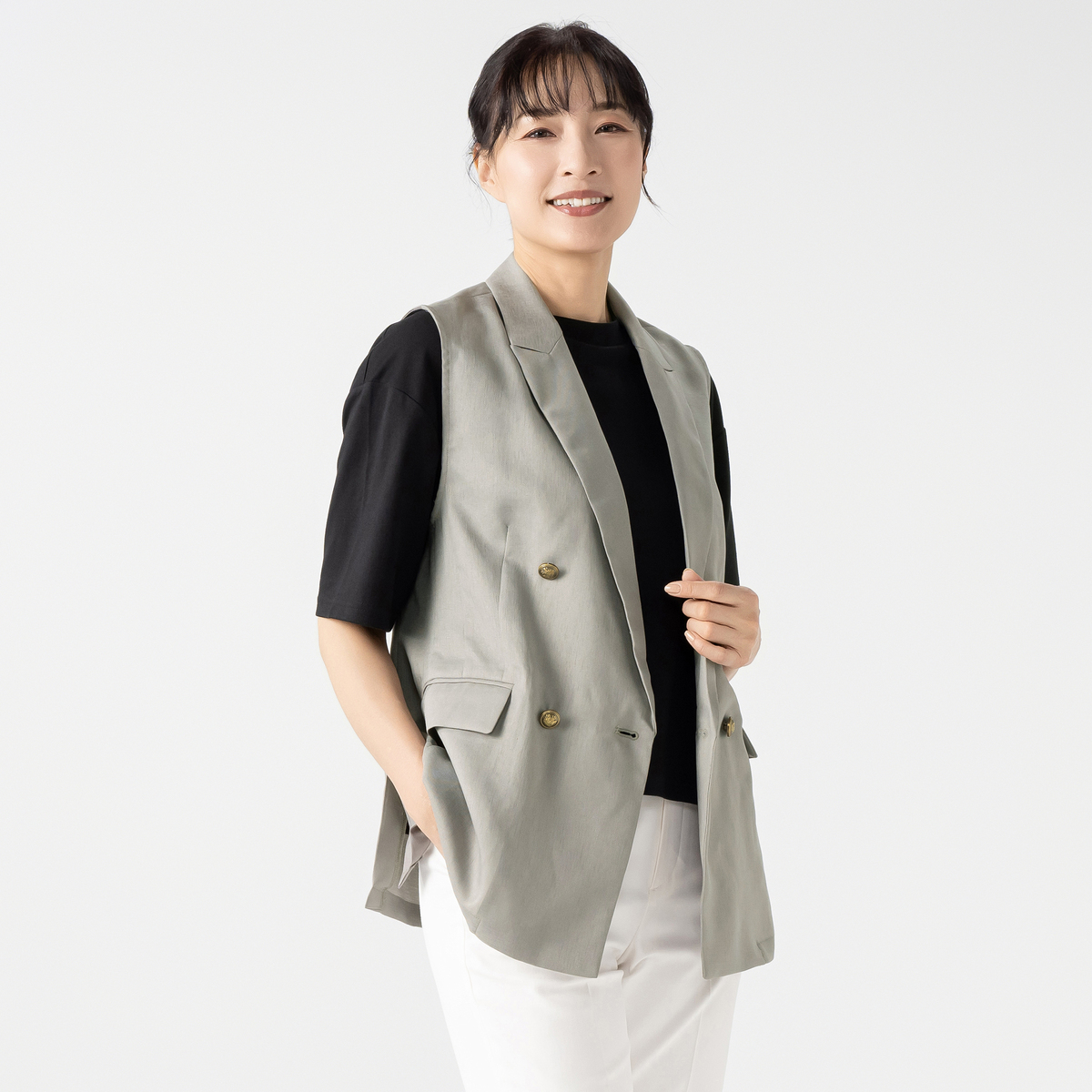 軽やかに羽織れるダブル前ジレ。気軽に羽織れてきちんと感もあり、ダブルボタンもアクセントになっています