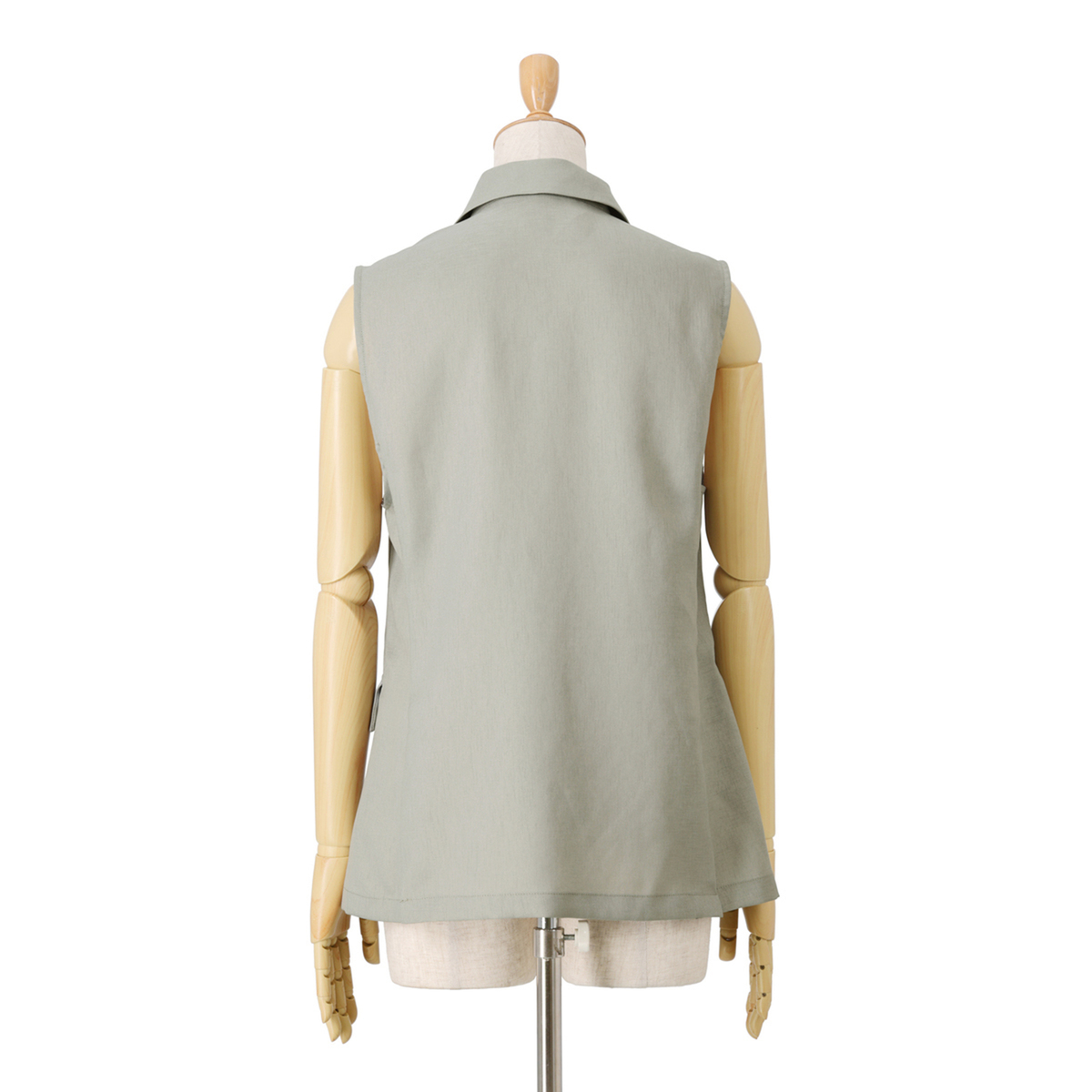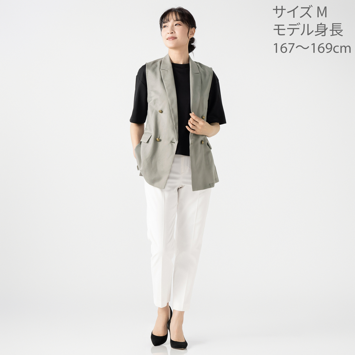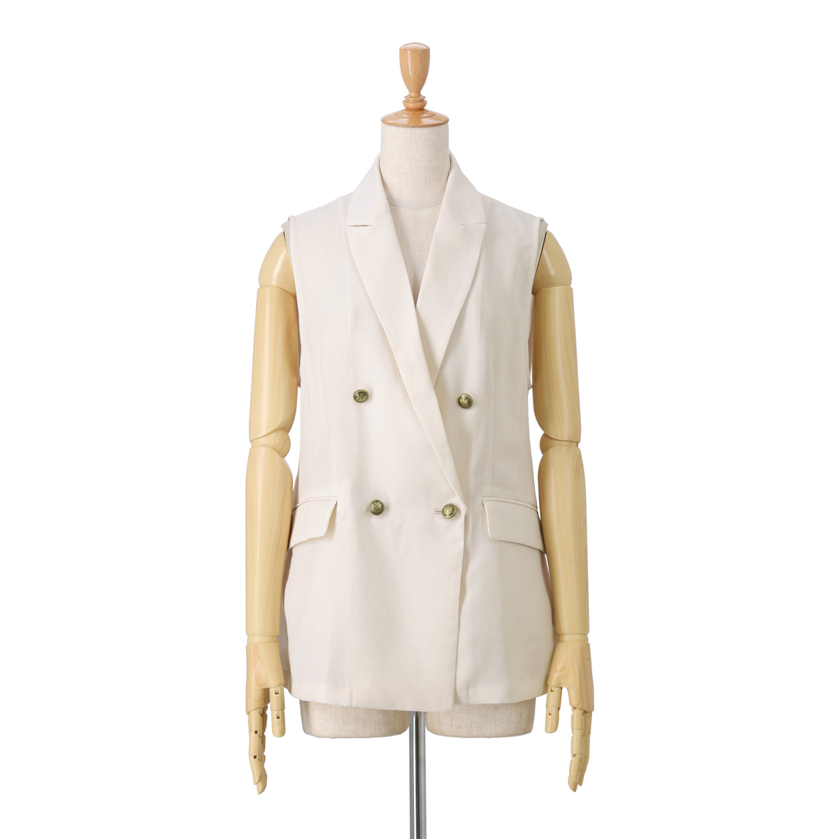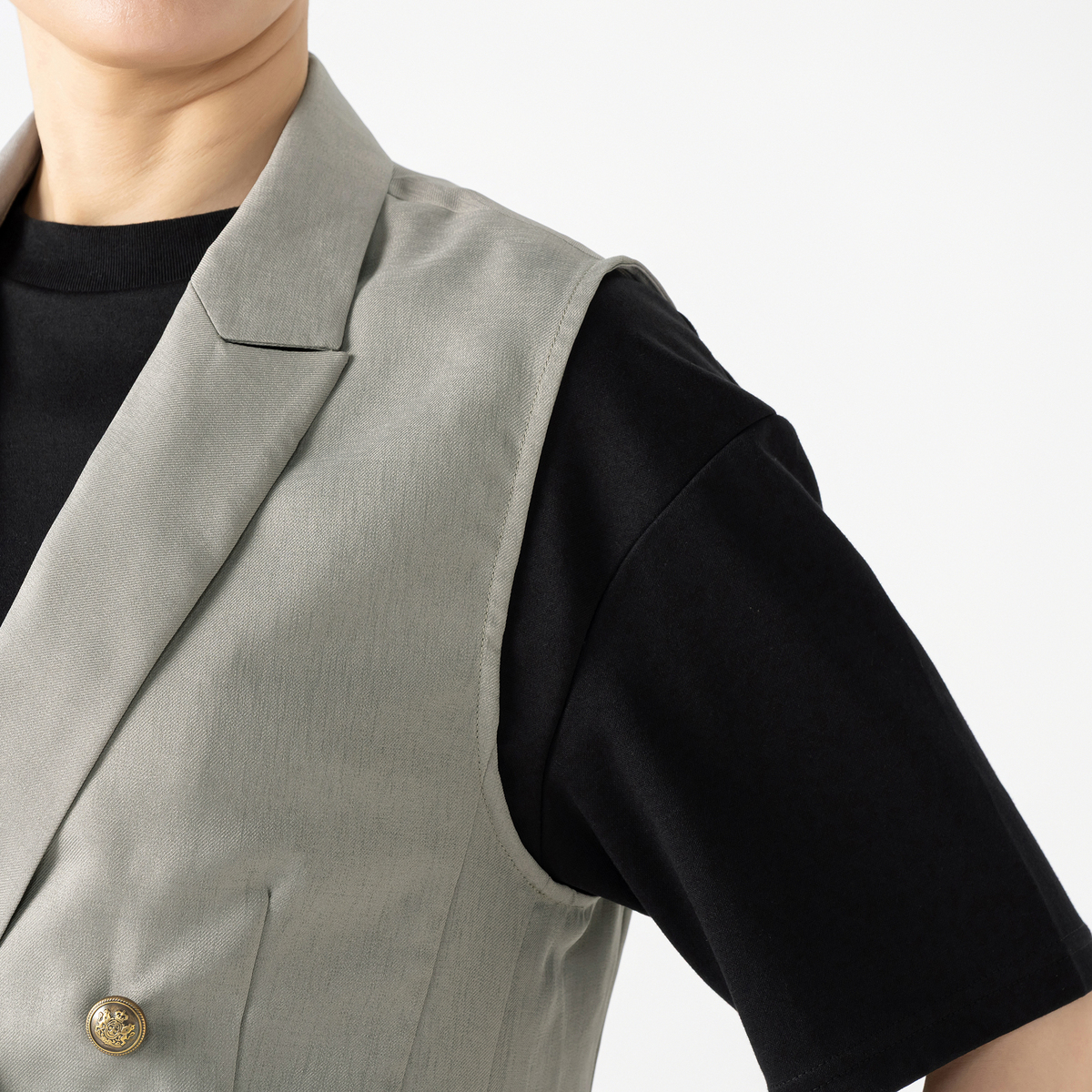 軽やかに羽織れるダブル前ジレ。気軽に羽織れてきちんと感もあり、ダブルボタンもアクセントになっています