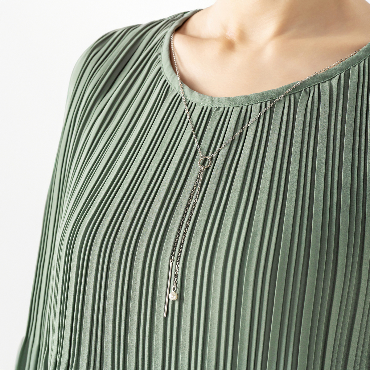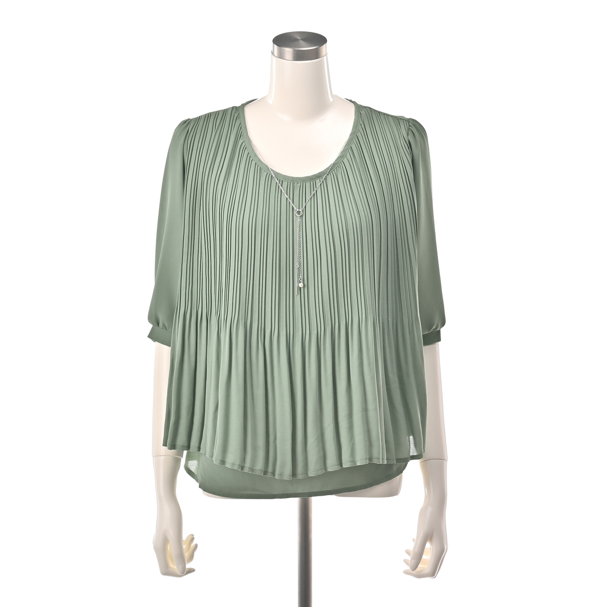 働く女性を応援するブランド「Beauty Fit」のアクセ付ブラウス。前身頃はプリーツで洗練された印象に。ネット使用で洗濯機洗い可能です