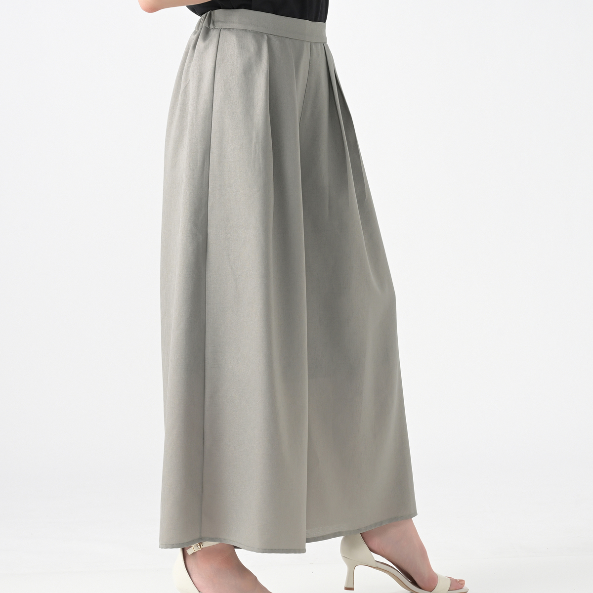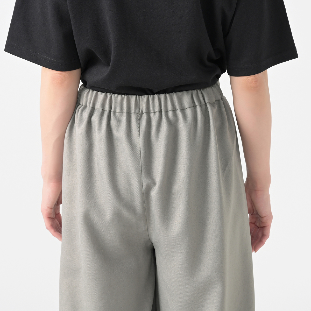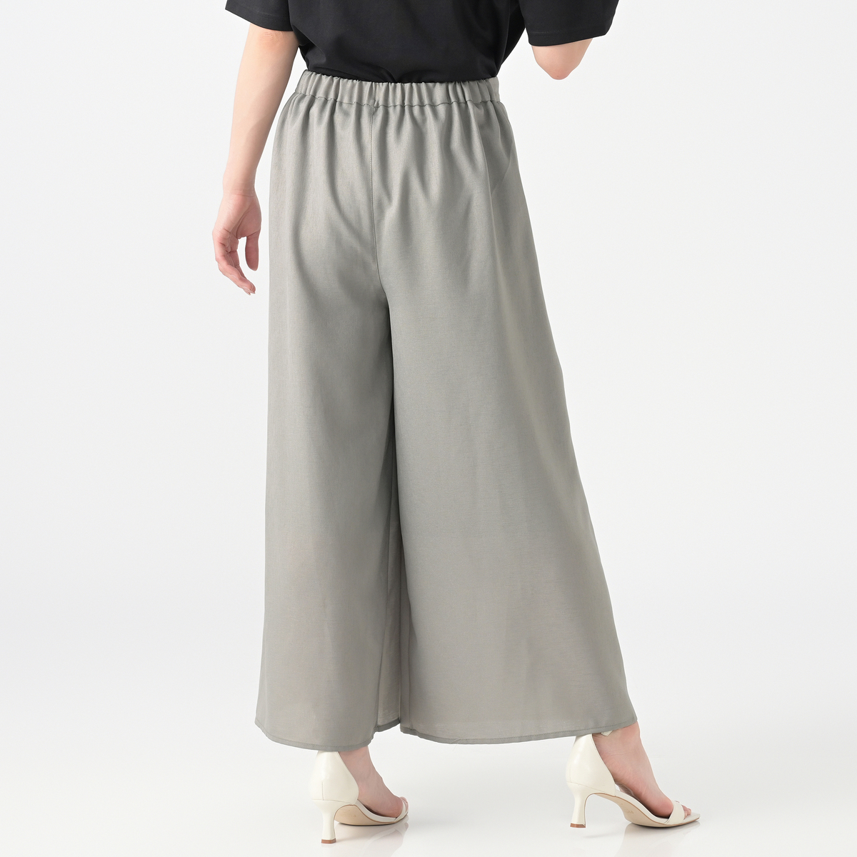 タック入りで穿き心地のよいワイドパンツ。ウエストは後ろ全体はゴム仕様。ご自宅で洗濯機洗い出来る手軽さと、合わせるだけでお洒落見えするデザイン性が魅力です