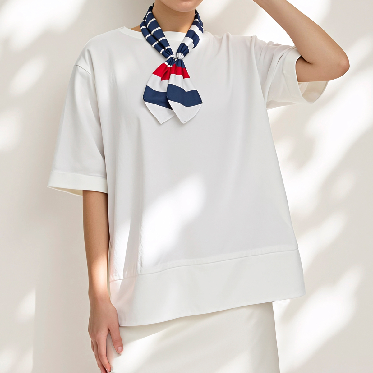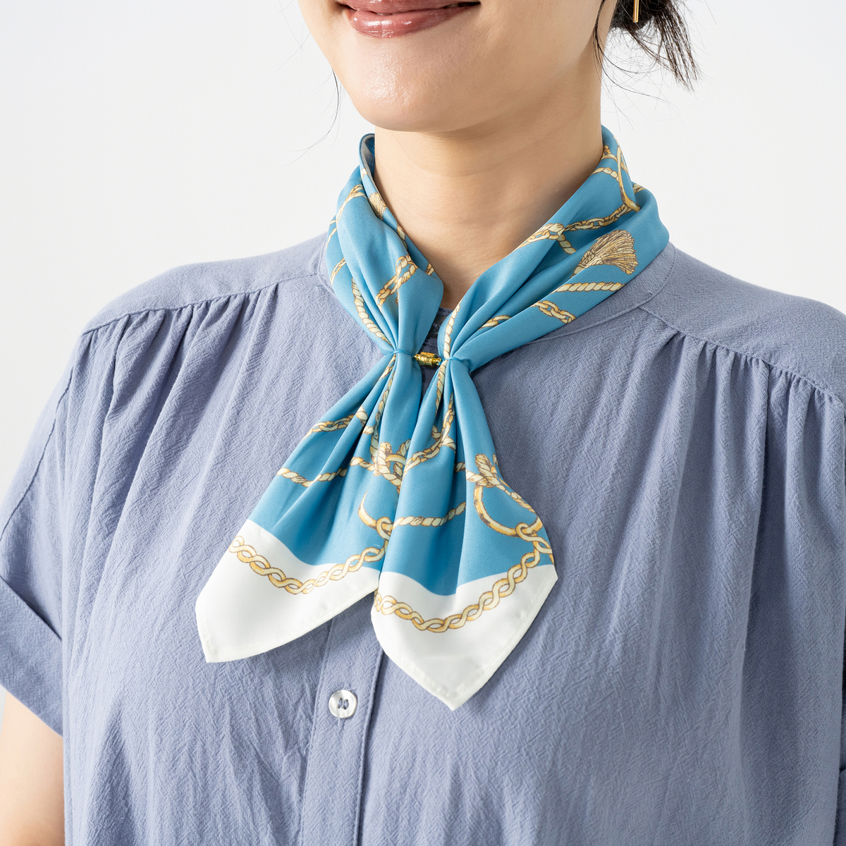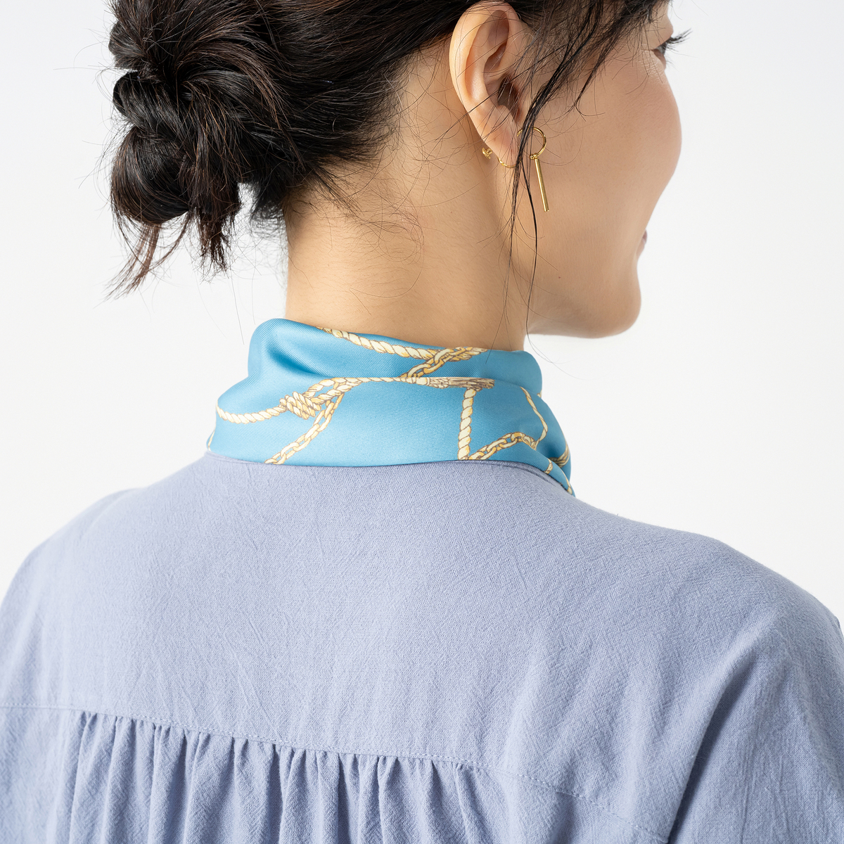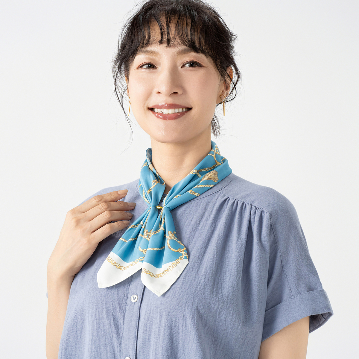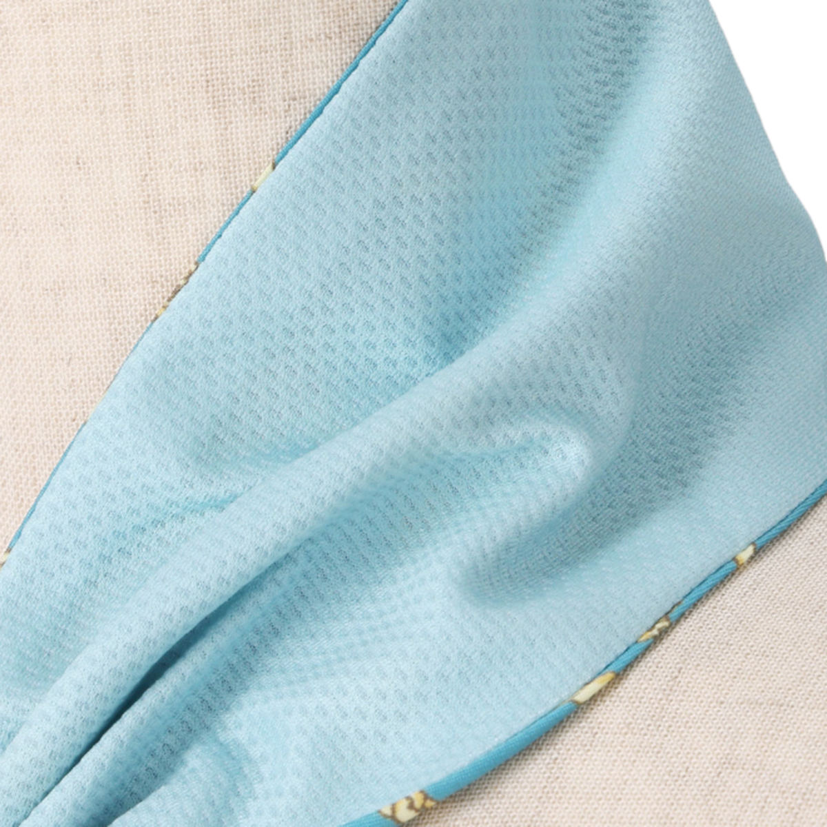 接触冷感性があり、ひんやり涼しく使えるスカーフ。汗をかいたら洗濯機洗いでき、繰り返し使えます。首に当たる内側部分は接触冷感性のある生地で、オシャレをしながら日よけも暑さ対策もできます