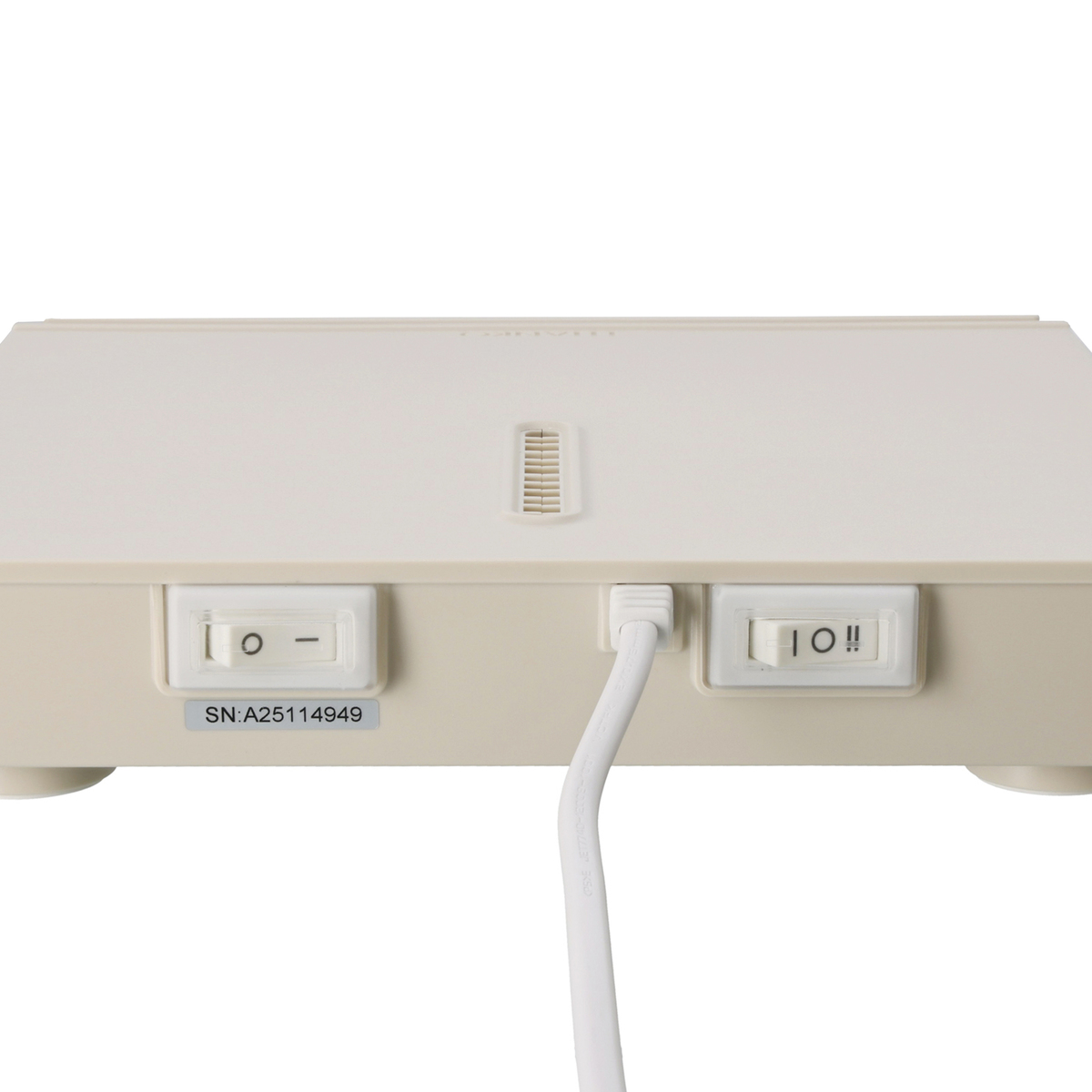 幅26×奥行27×高さ4.5cmのコンパクト&スリムサイズ。防水規格IPX2、約120kgまでの方がご使用になれます。本体にある風量調整ボタンで風量が強・中・弱に切り替えられ、本体にある操作ボタンで送風モードが「乗るとオン」・「連続10分」に切り替えられます(連続10分:再度乗ると止まります)