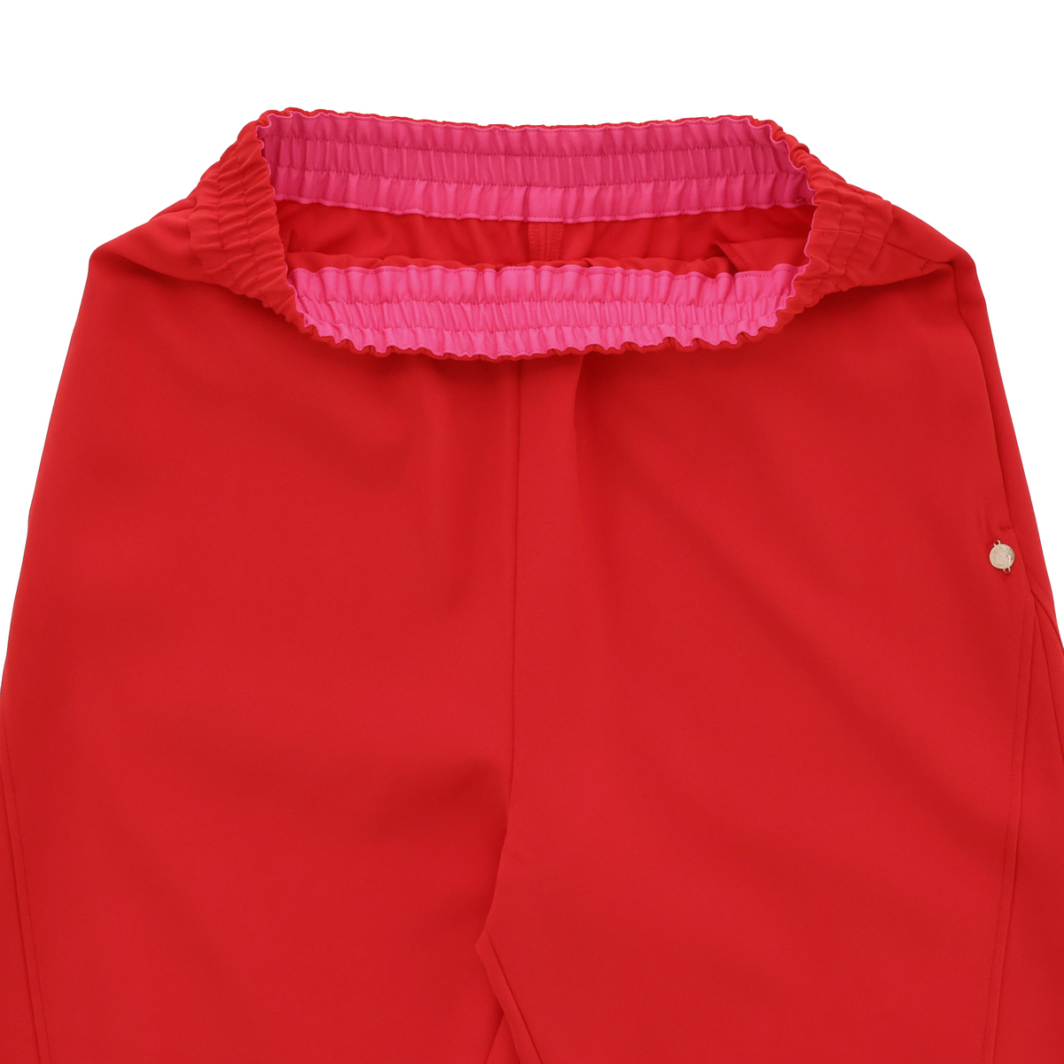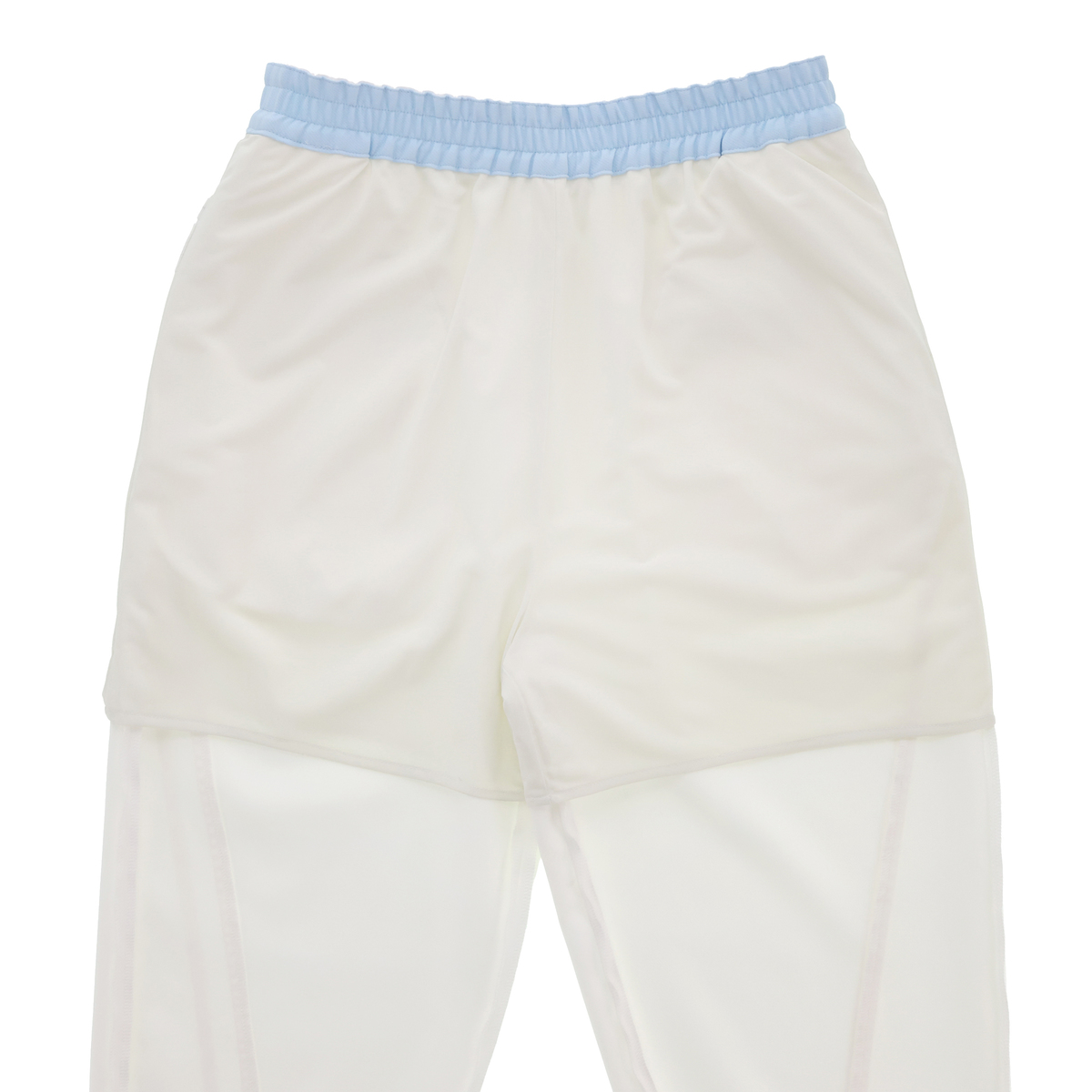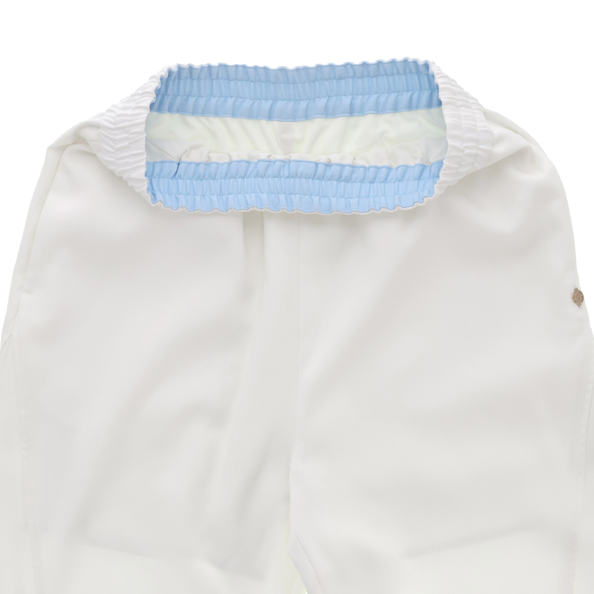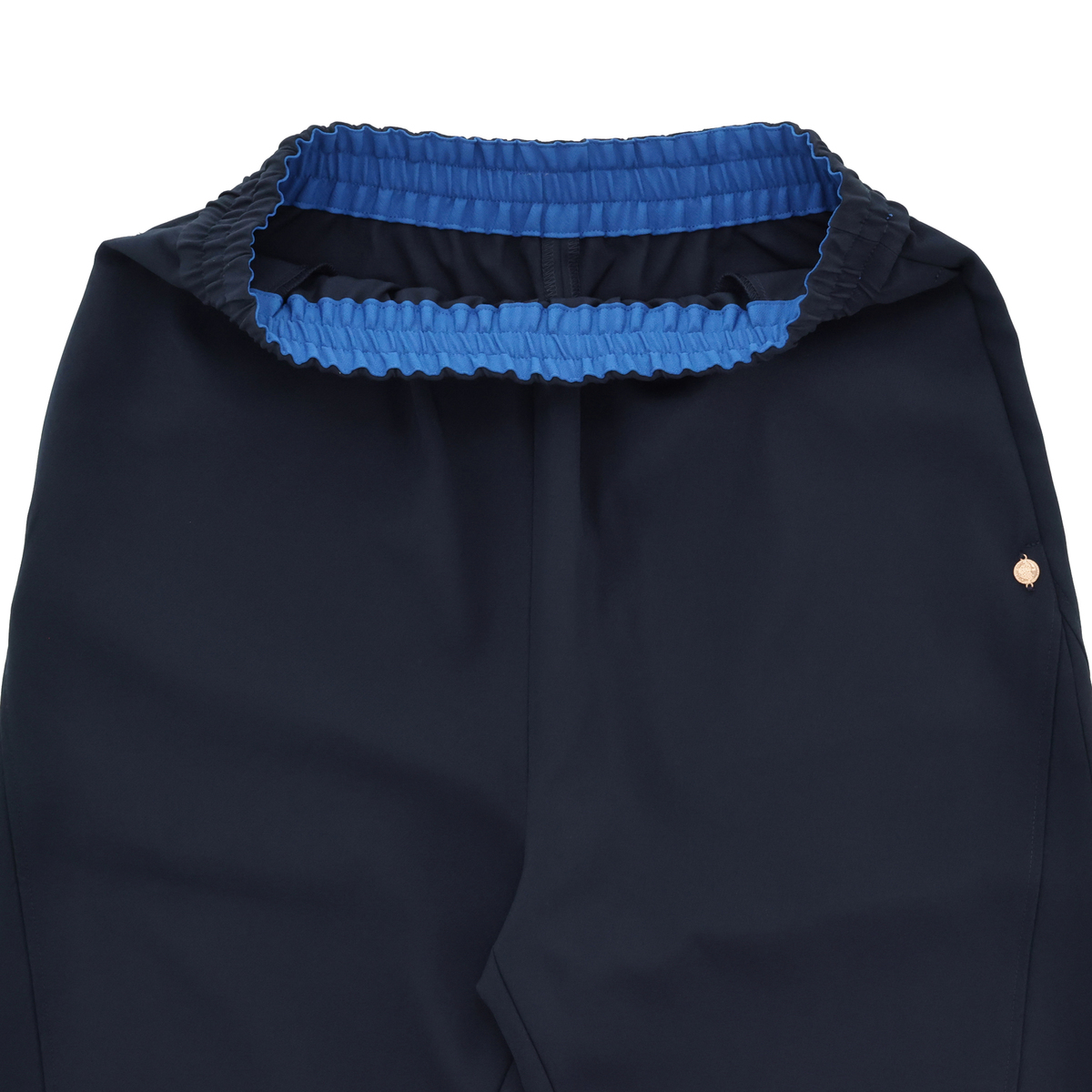 2重織り生地を使い、しっかりした素材ながらもシルエットを立体的にしたこだわりのパターン。オフホワイトのみ裏地付きで透け防止対策をしています。ベルト裏の配色、後ろポケットのトリコロール裏地や月のチャームがさりげないアクセントになっています