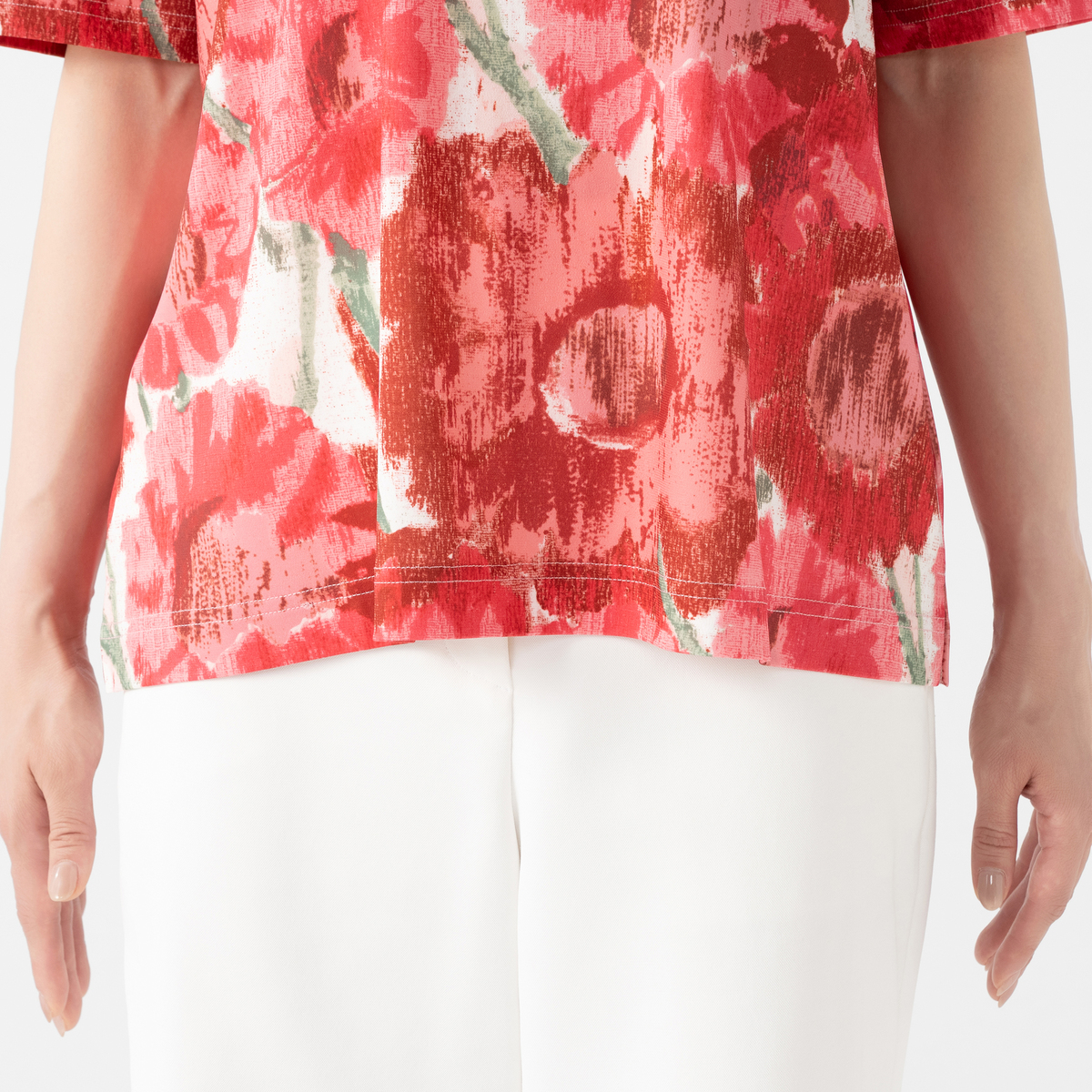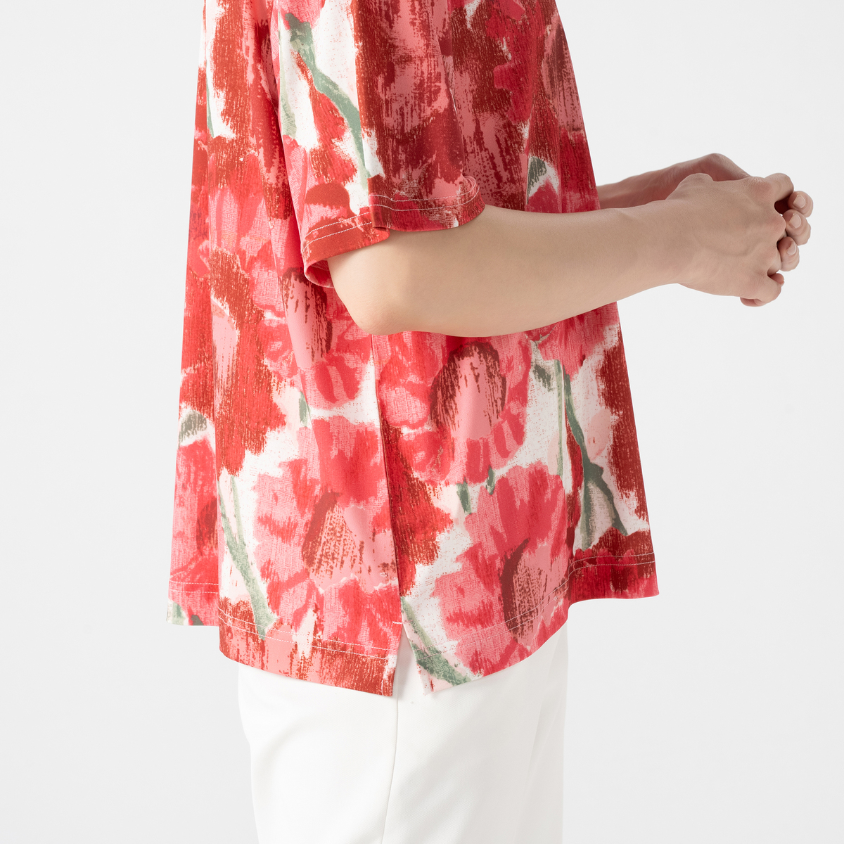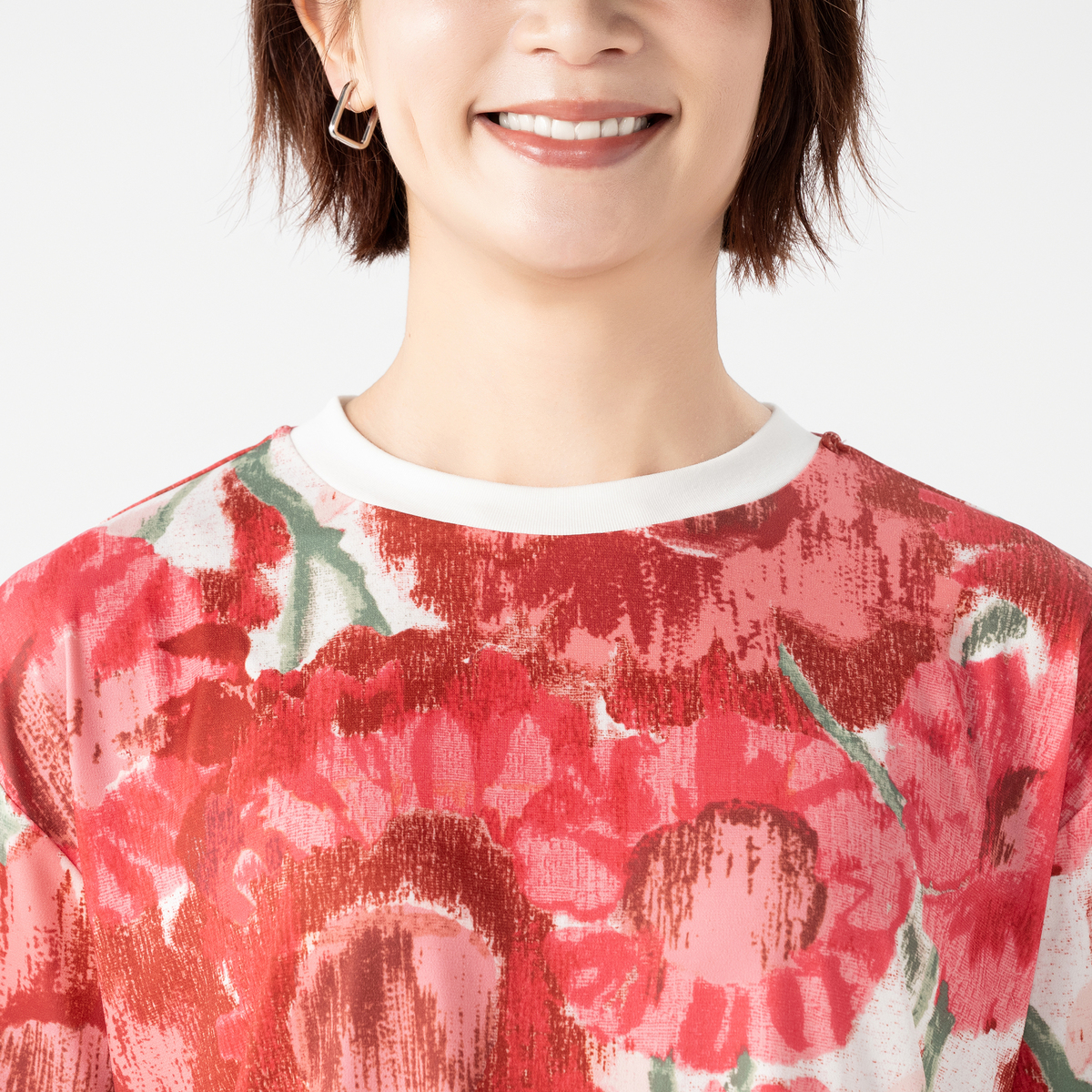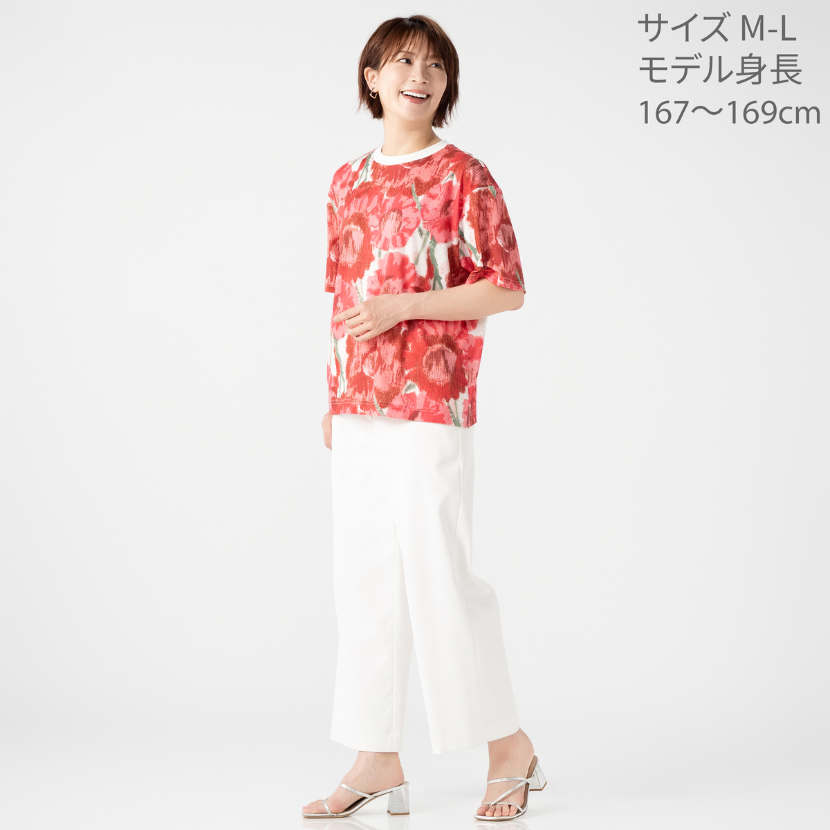 二の腕をすっぽり隠す、長めの半袖丈のトップス。身幅もゆったりしているのでプリント柄と相まって、体型カバーしながらリラクシーに着られます。裾の脇にはスリット入りで、動きやすさにも配慮しています