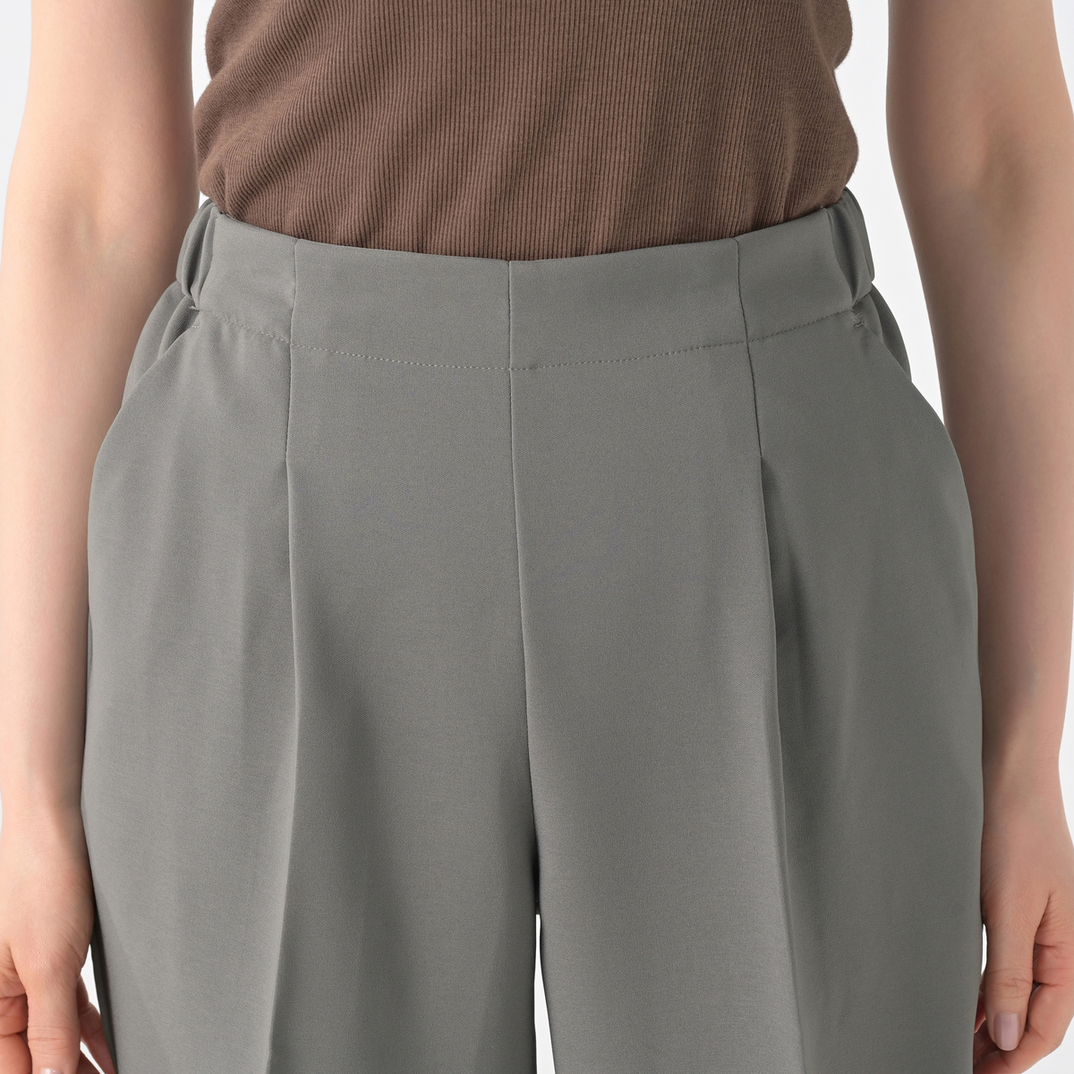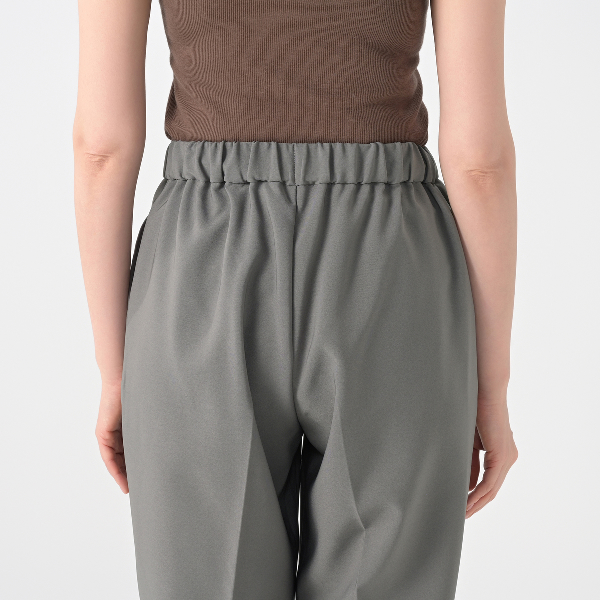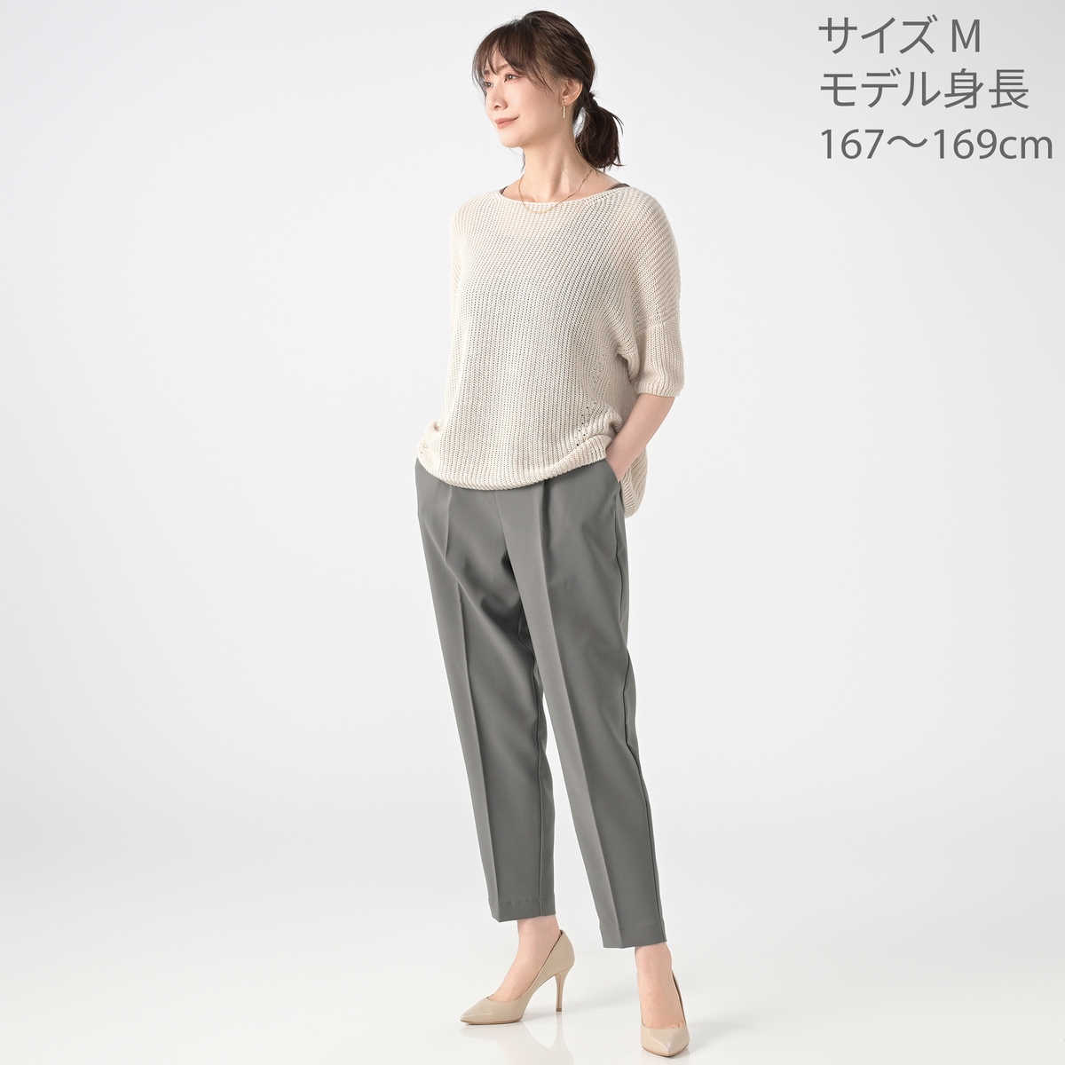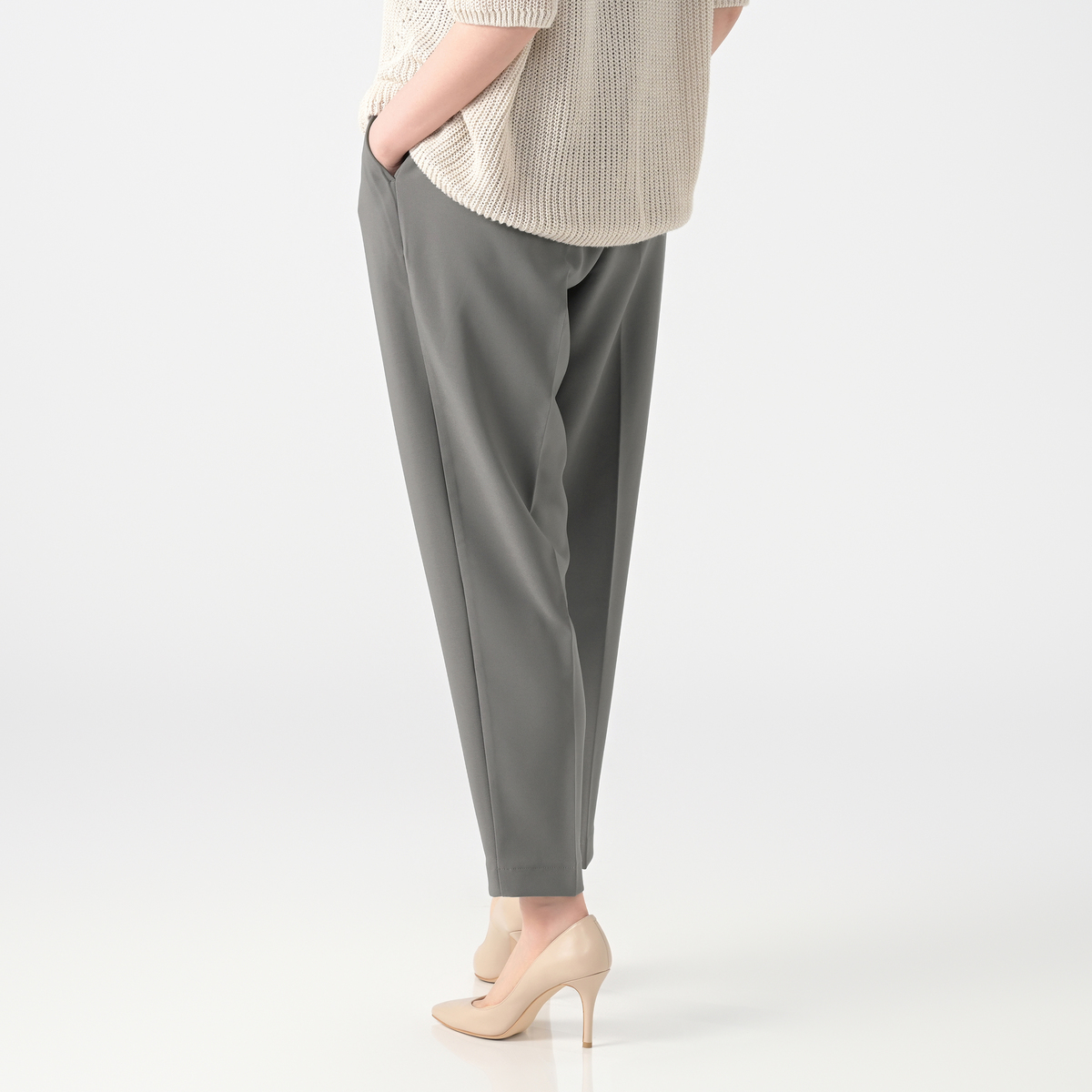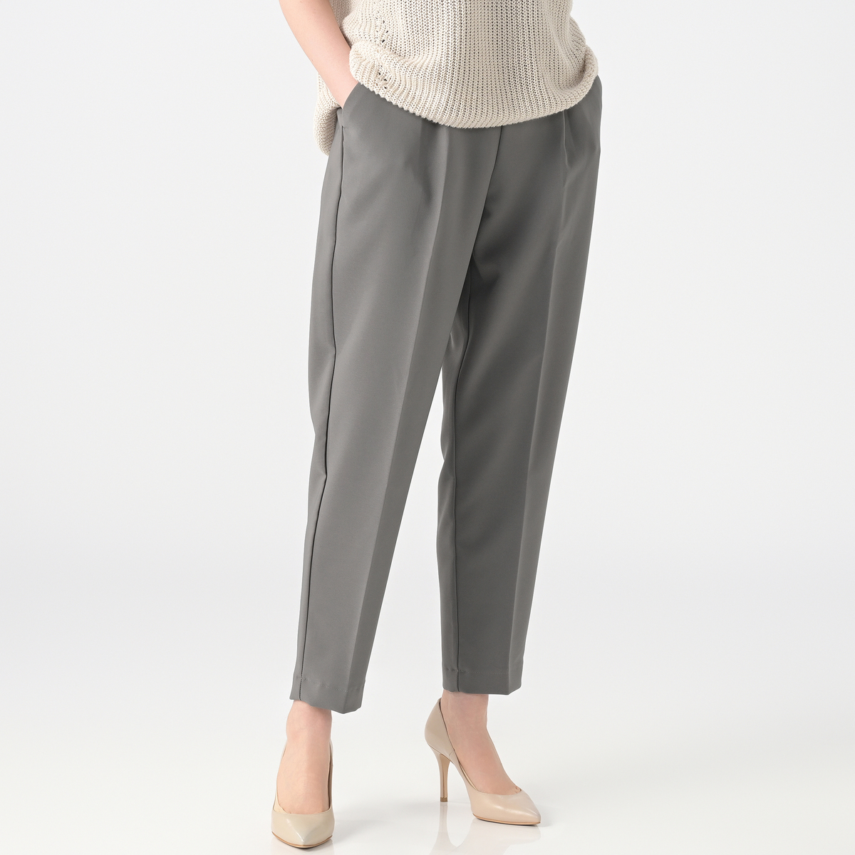 縦横に伸びるストレッチ素材で動きやすく、楽に穿けるテーパードパンツ。二重織りのきれいめ素材でドレープ感を楽しめ、股上はウエストまでの深め設計です