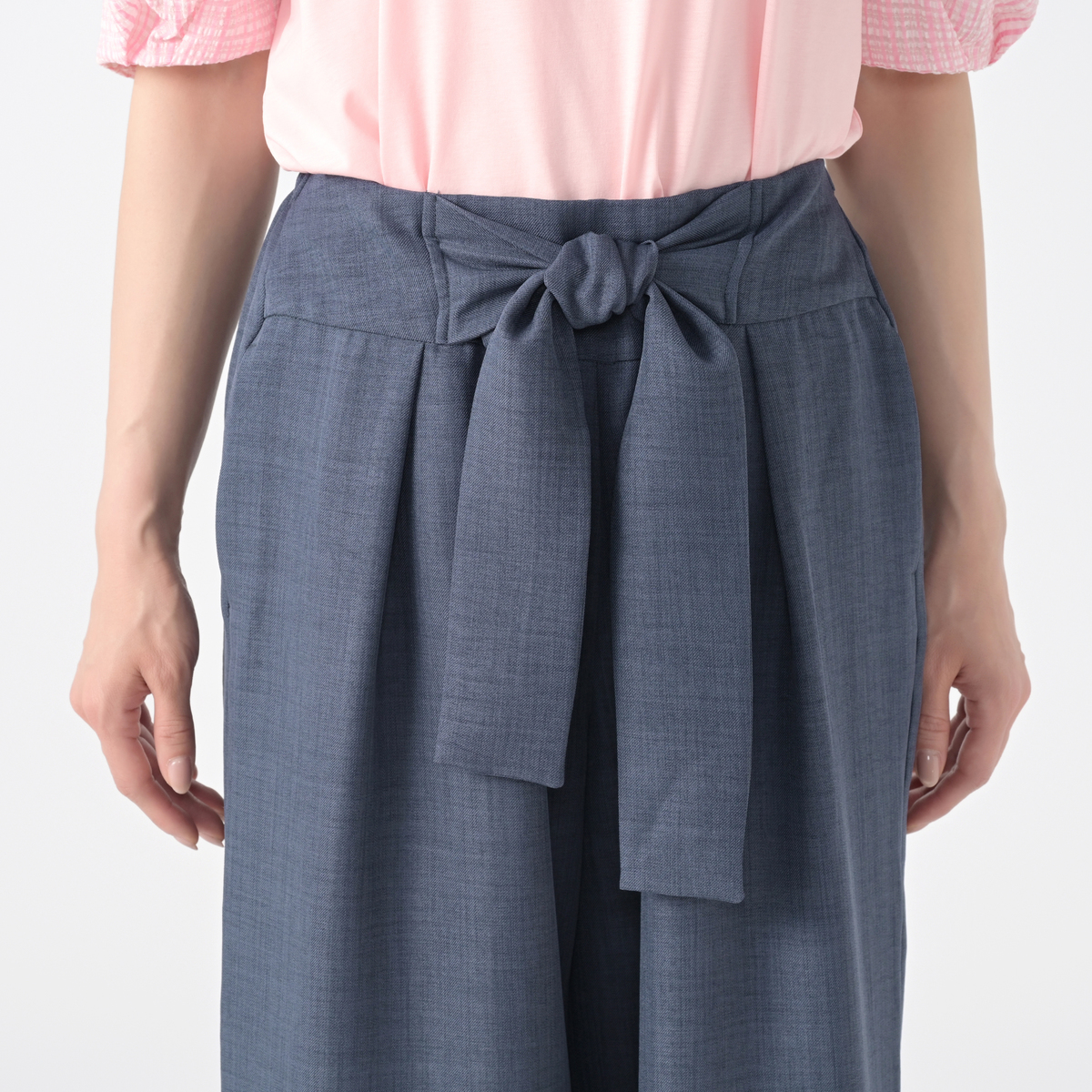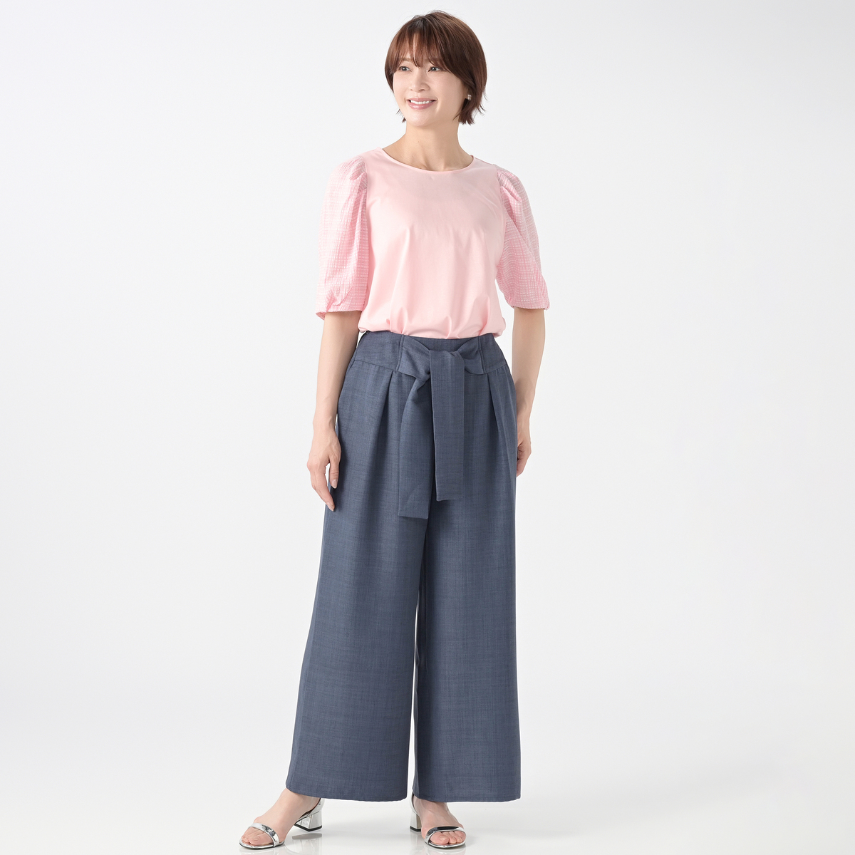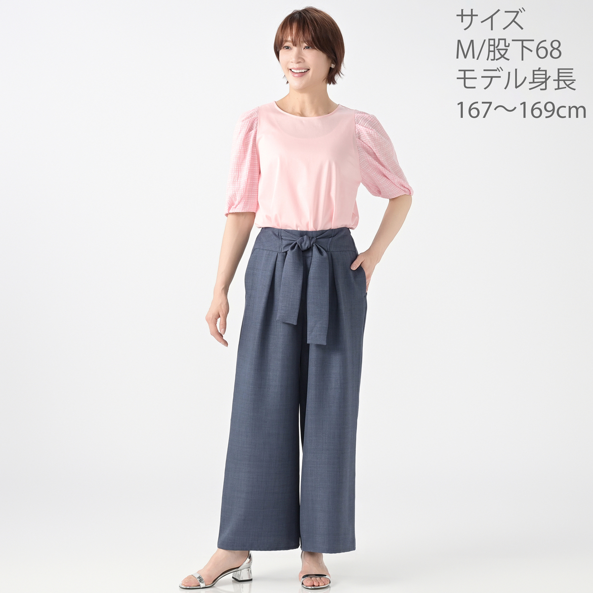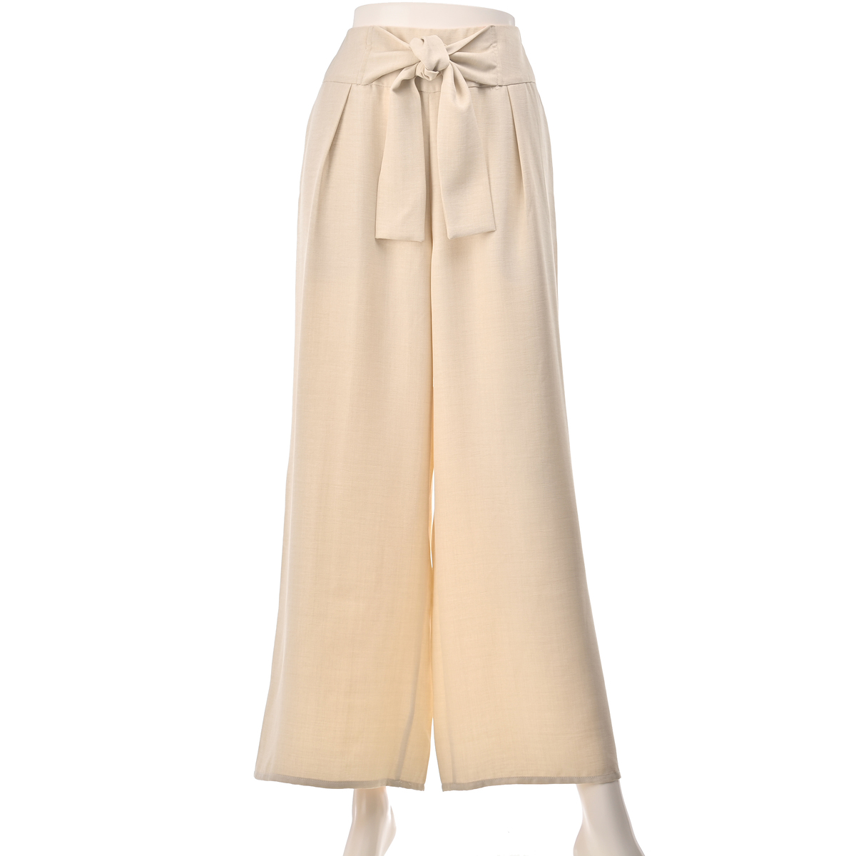腰からすとんと落ちるワイドシルエット。脚長に見えるように、前には深めのタックを入れています。同素材のベルトリボンがポイントに。やや太めのウエスト切替えから続くデザインです