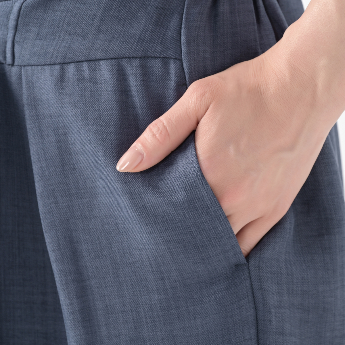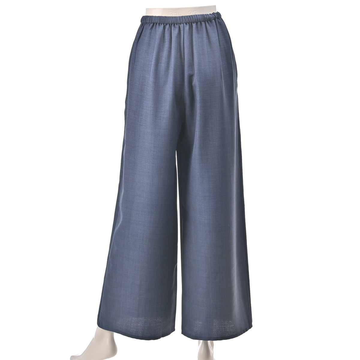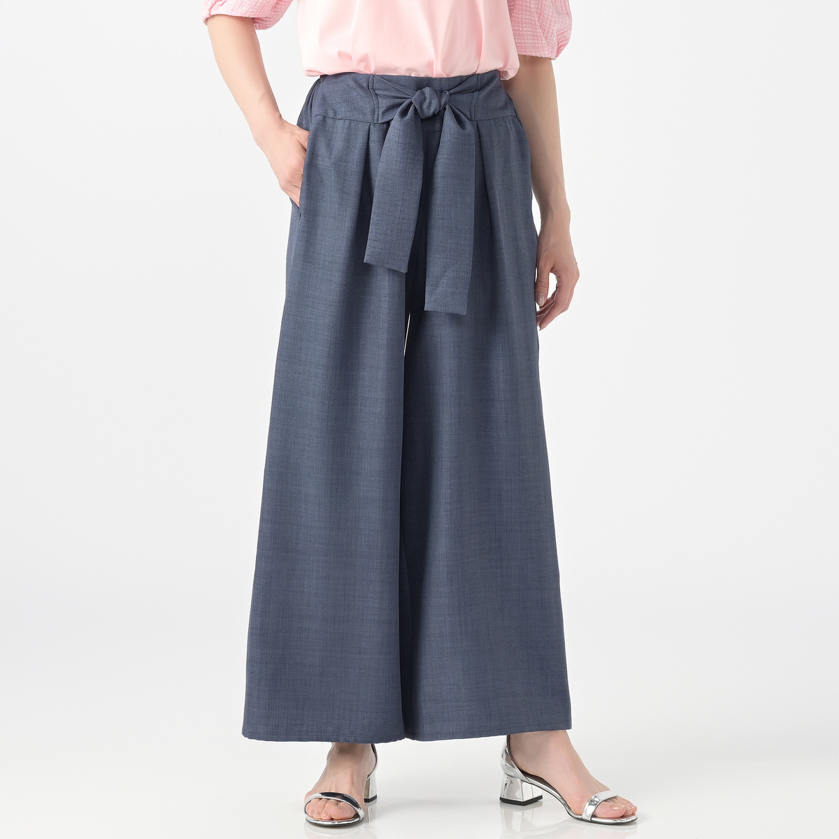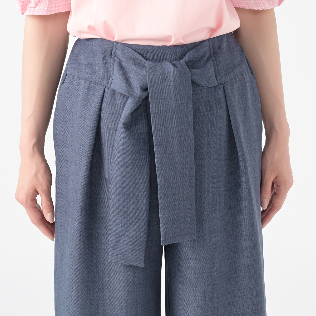 腰からすとんと落ちるワイドシルエット。脚長に見えるように、前には深めのタックを入れています。同素材のベルトリボンがポイントに。やや太めのウエスト切替えから続くデザインです