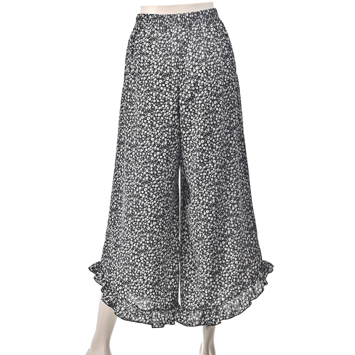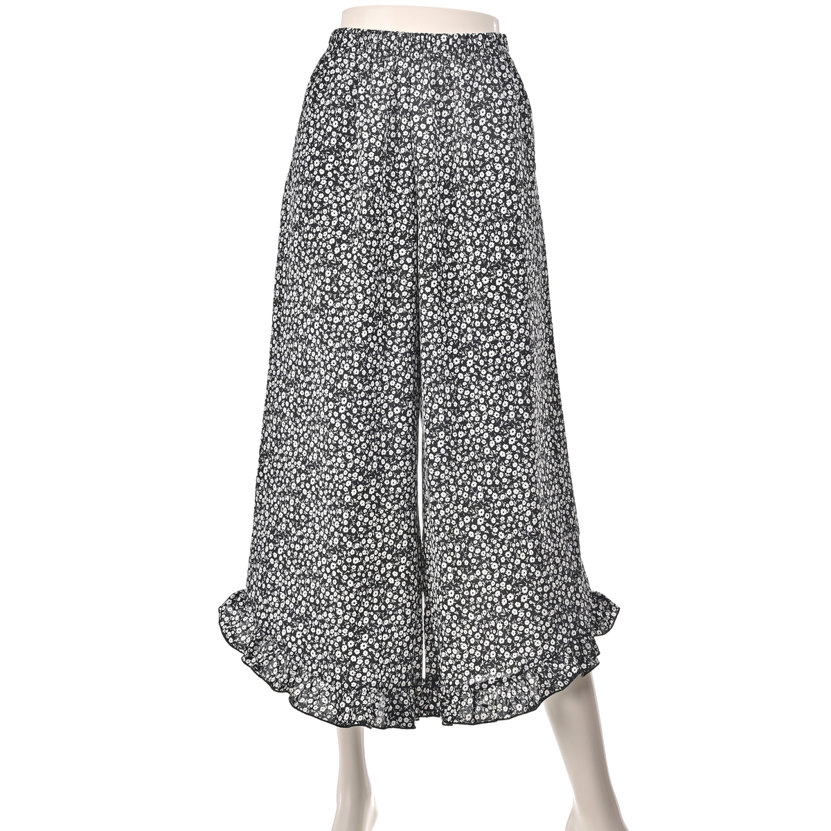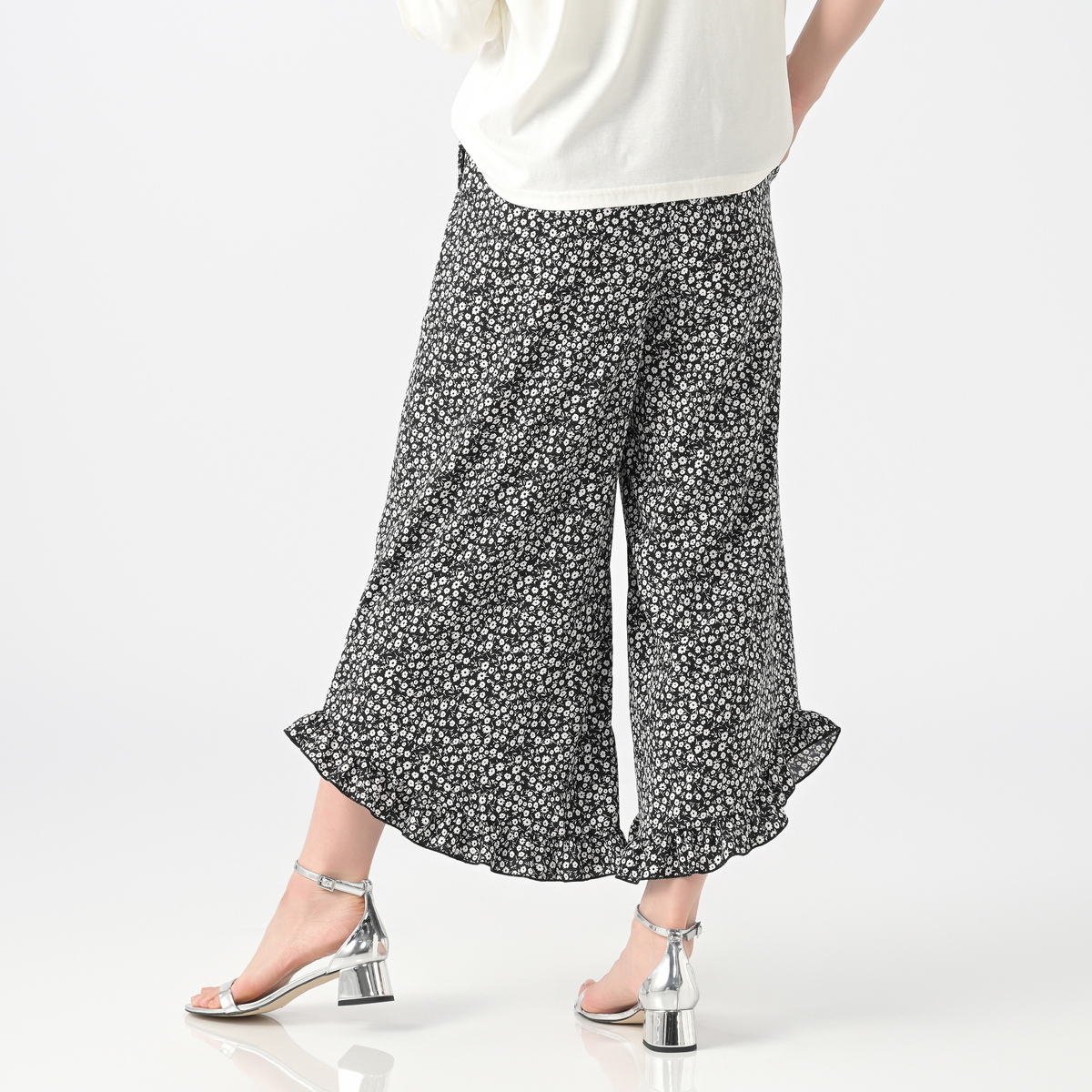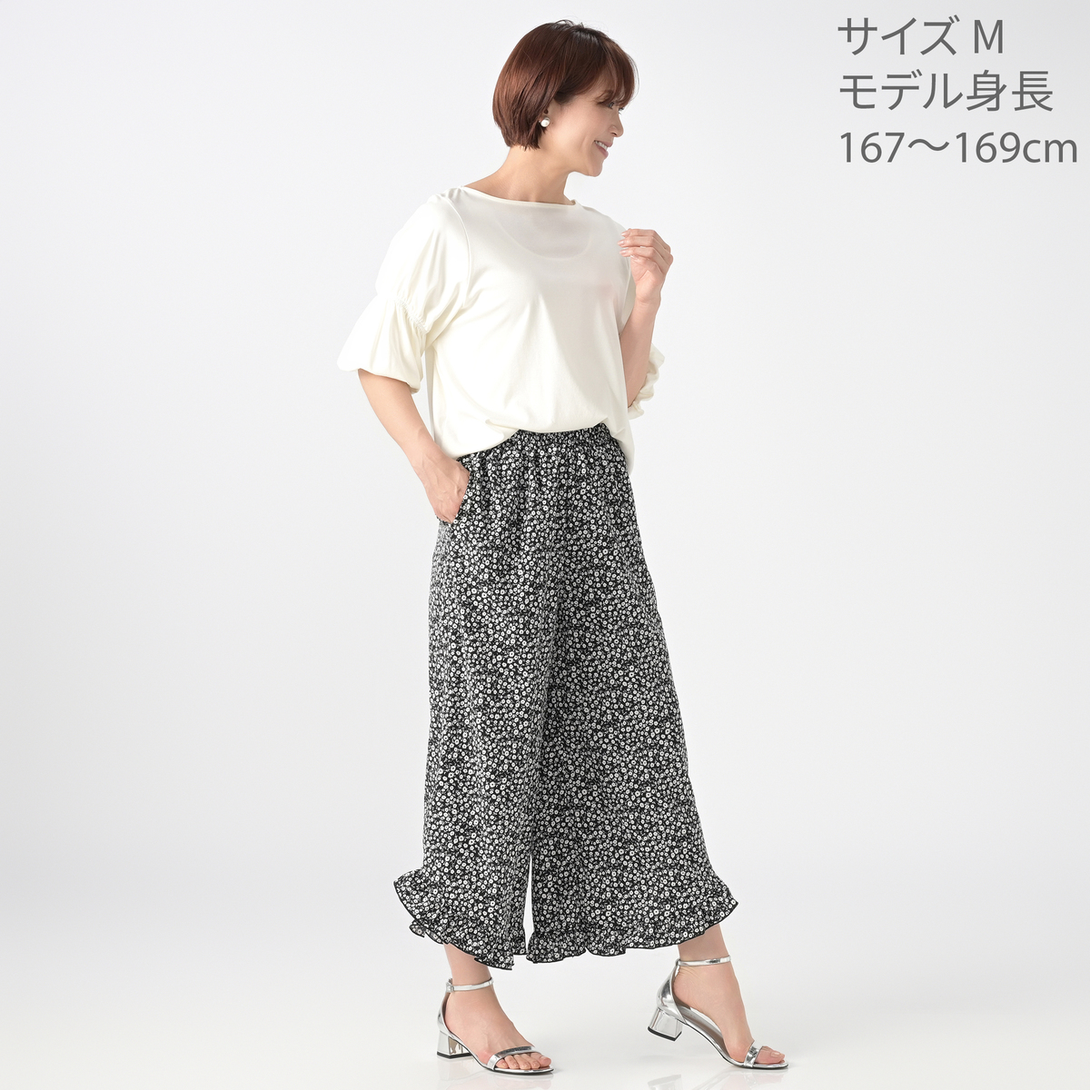 上品な小花柄のワイドパンツ。カーブデザインの裾にフリルをあしらった華やかなデザインです