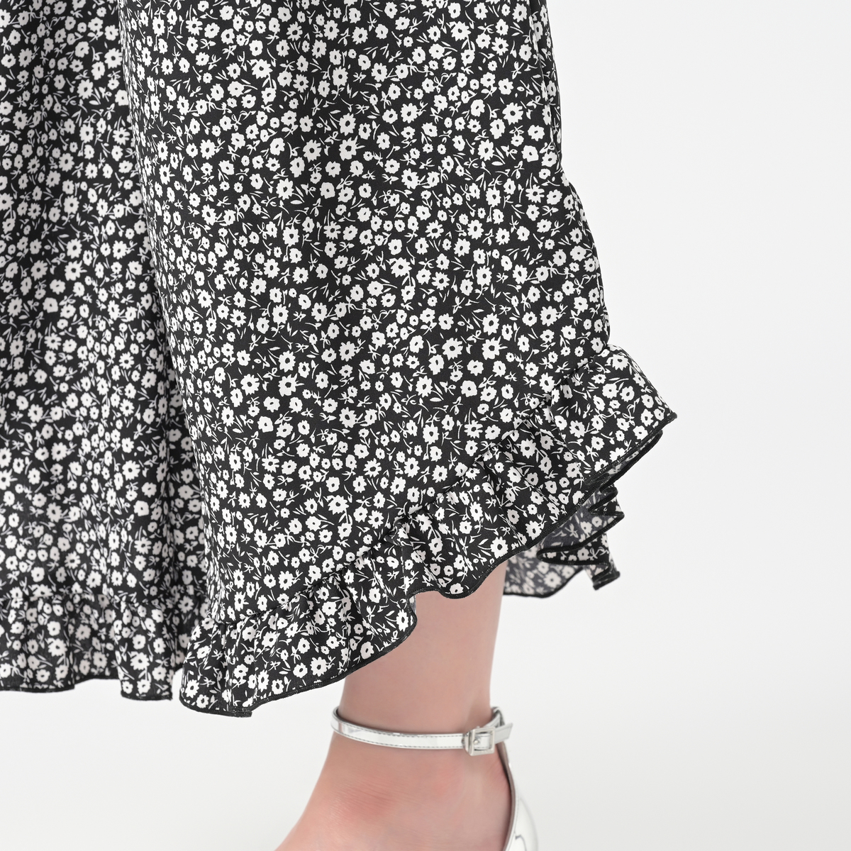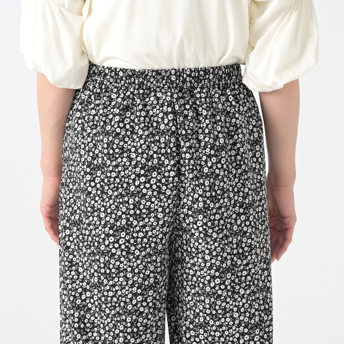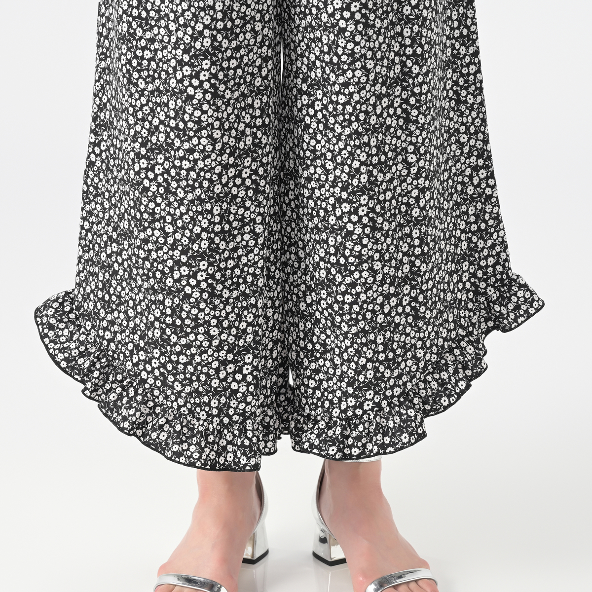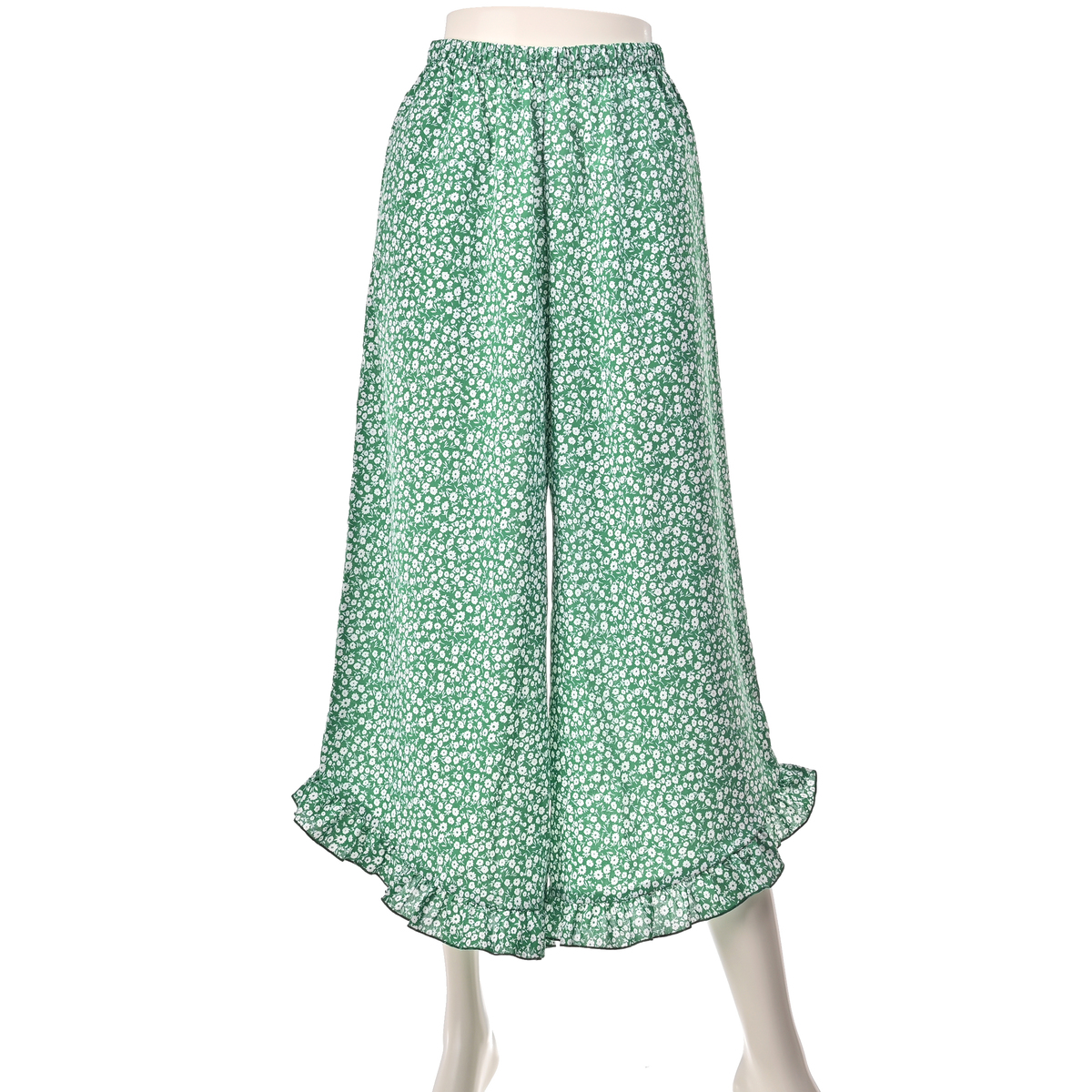 上品な小花柄のワイドパンツ。カーブデザインの裾にフリルをあしらった華やかなデザインです