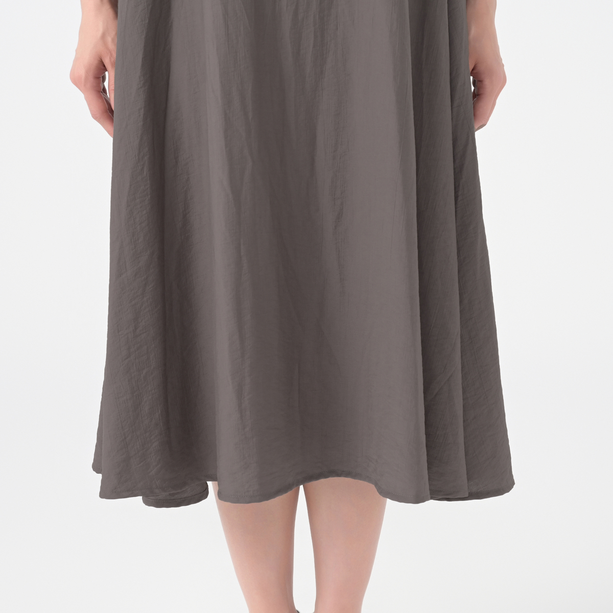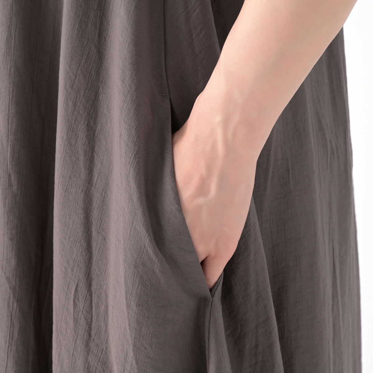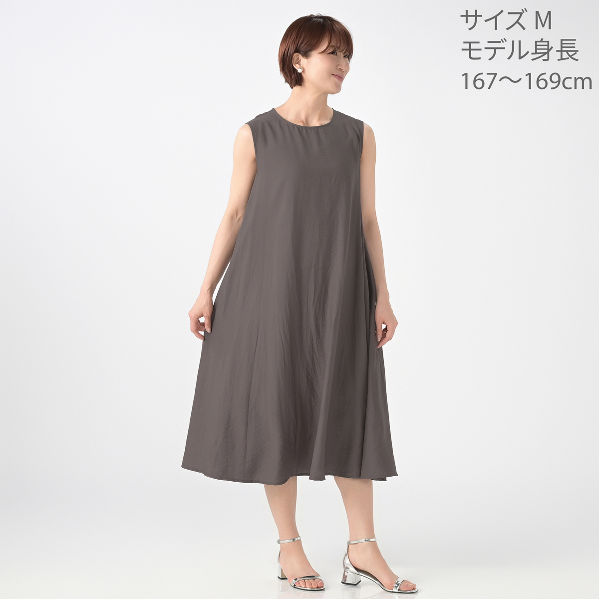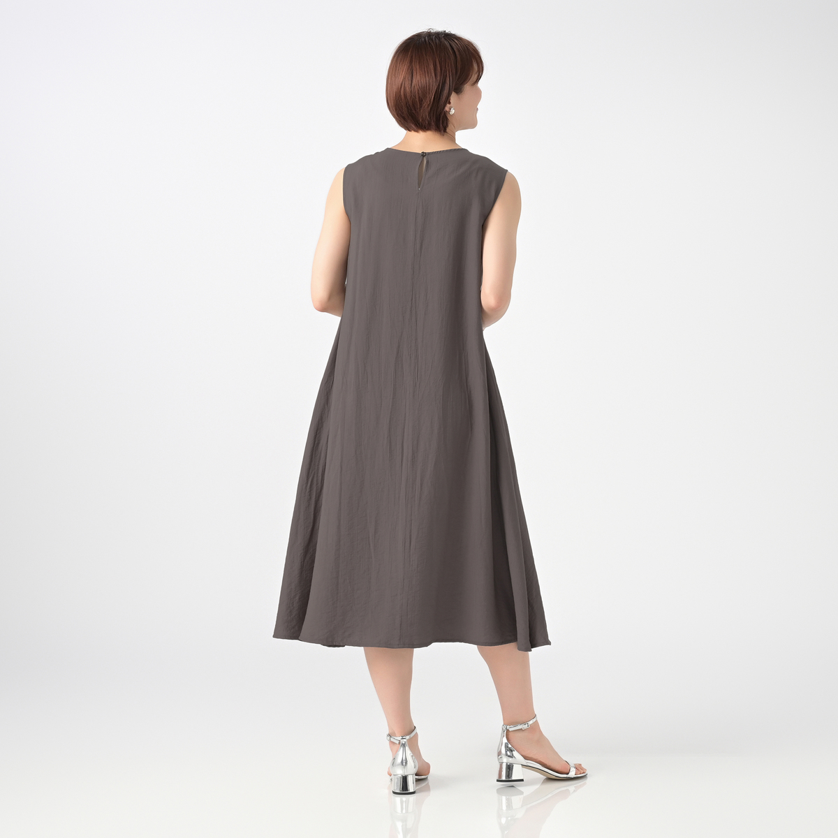 ヴィンテージワッシャー加工のレーヨン/ナイロン素材を使い、自然なシワ感とドレープ感が美しいワンピースです。生地に落ち感があるのでフロントはあえてシンプルに。フレアーなAラインシルエットが体型をさりげなくカバーし、上品でリラクシーな雰囲気を演出します