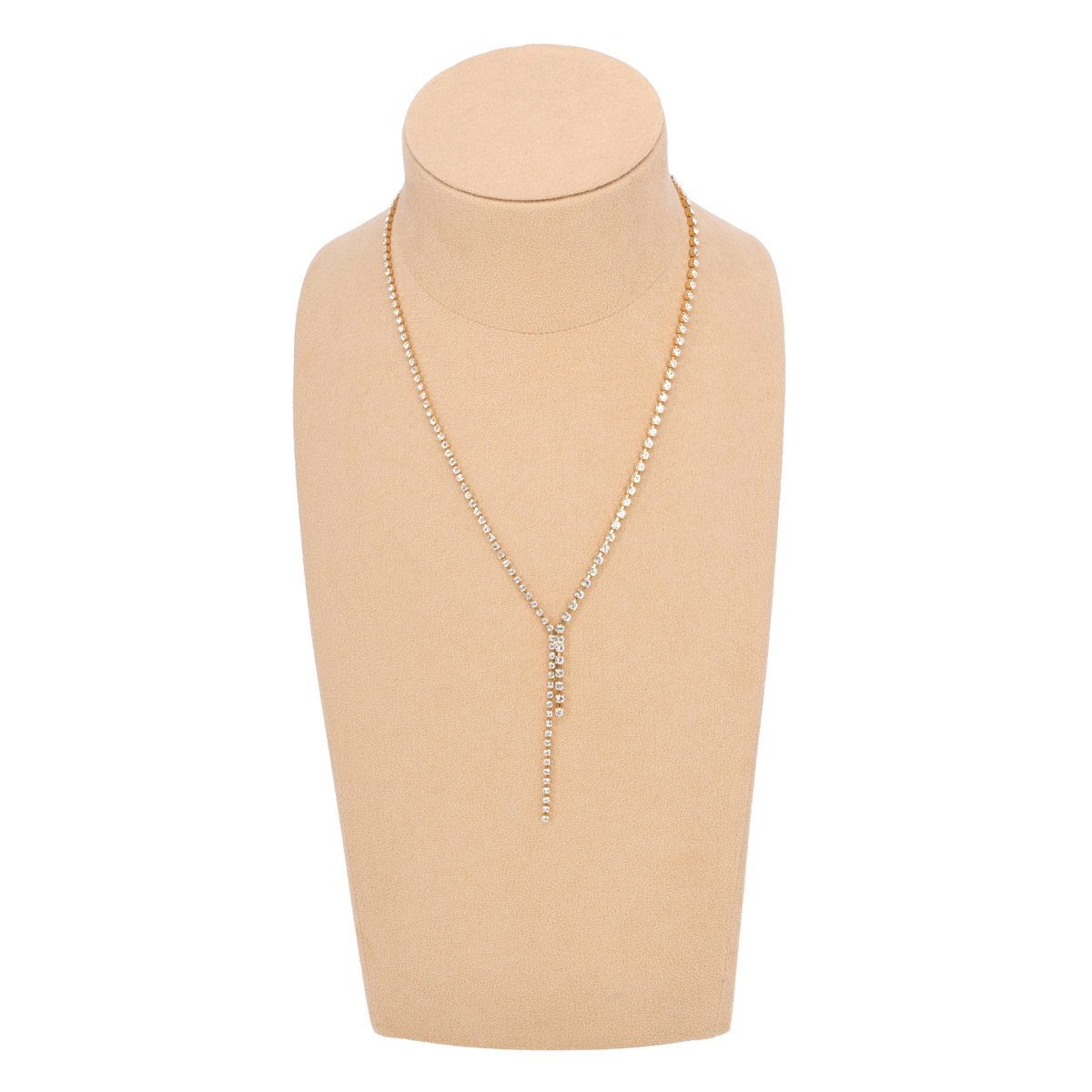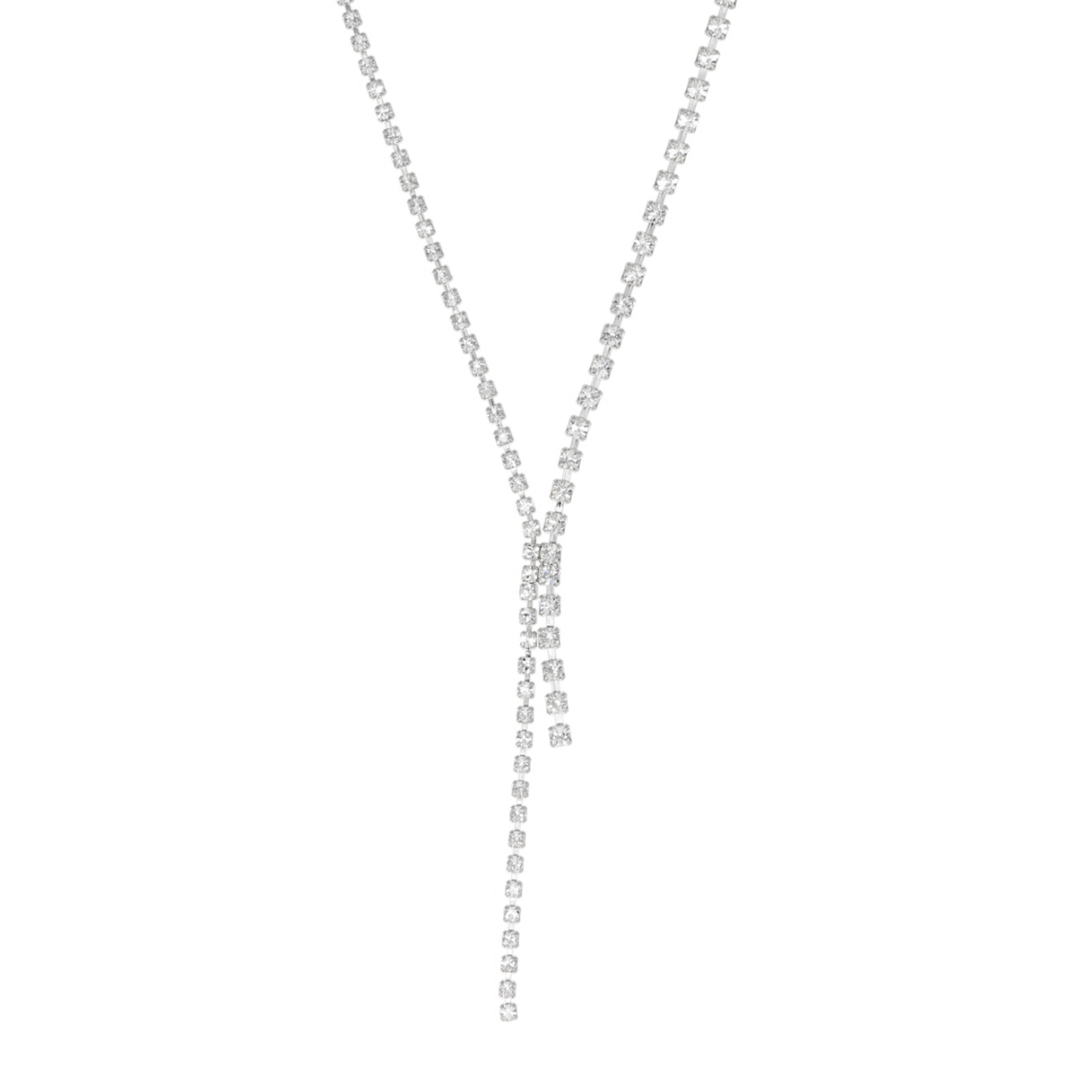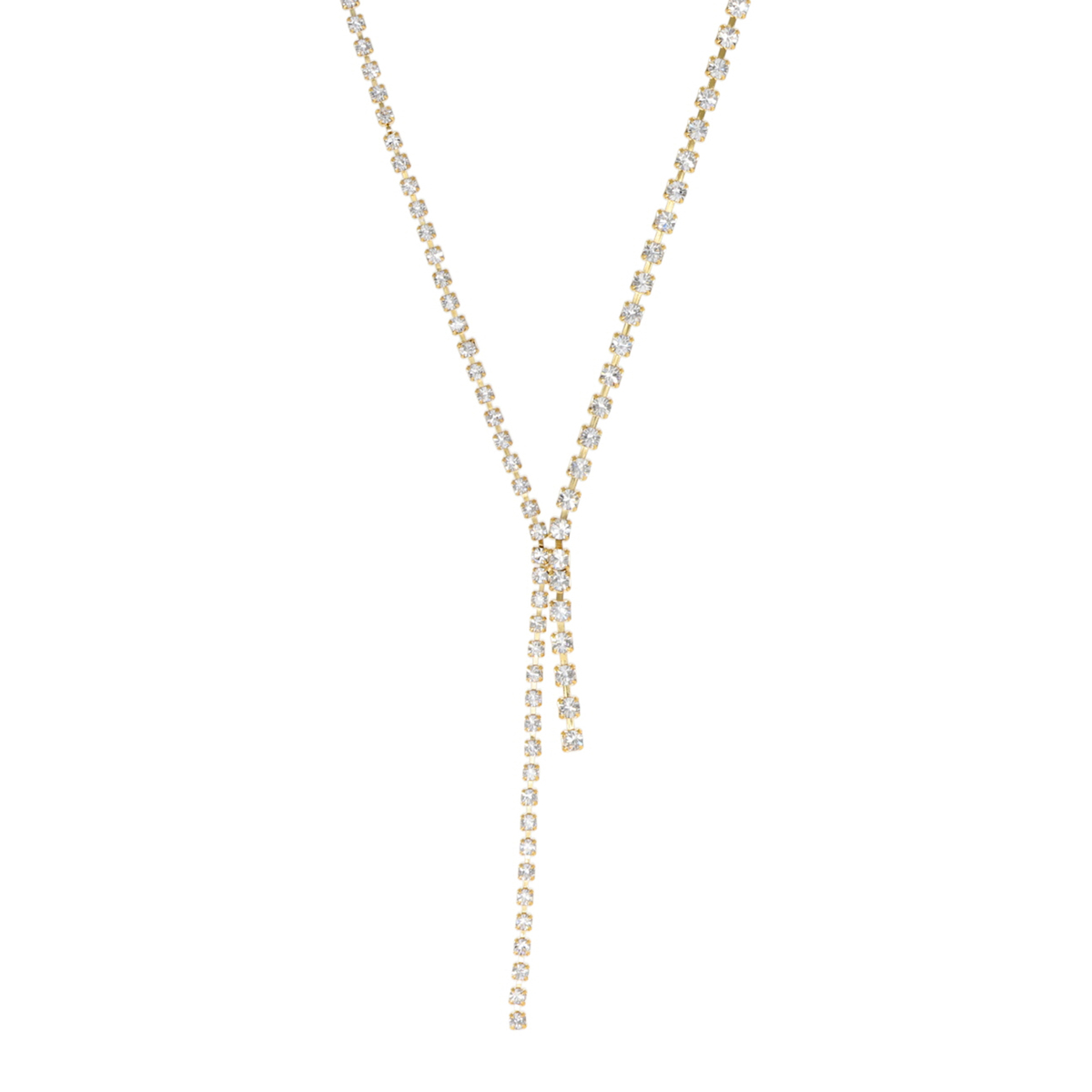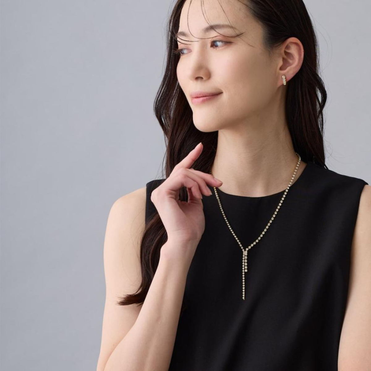 しなやかに揺れるY字ラインが首元をすっきりと見せ、エレガントな雰囲気を引き立てるビジューネックレス。煌びやかなデザインが特別感を演出します