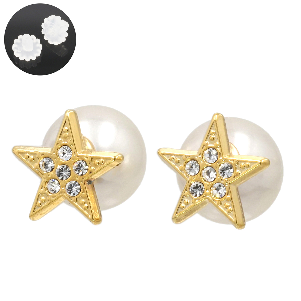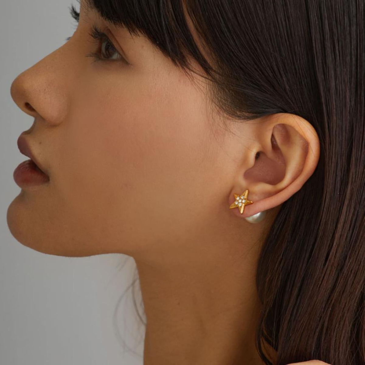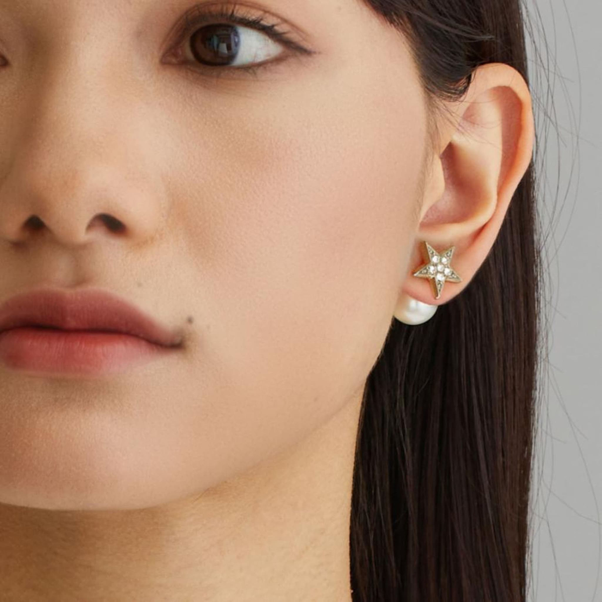パールビジューのバックキャッチと、煌めくスターモチーフのピアス。どの角度から見ても可愛いデザインで、さりげない遊び心を添えるスターモチーフが洗練された装いを演出。付属のシリコンキャッチに付け替えれば、違った表情も楽しめます