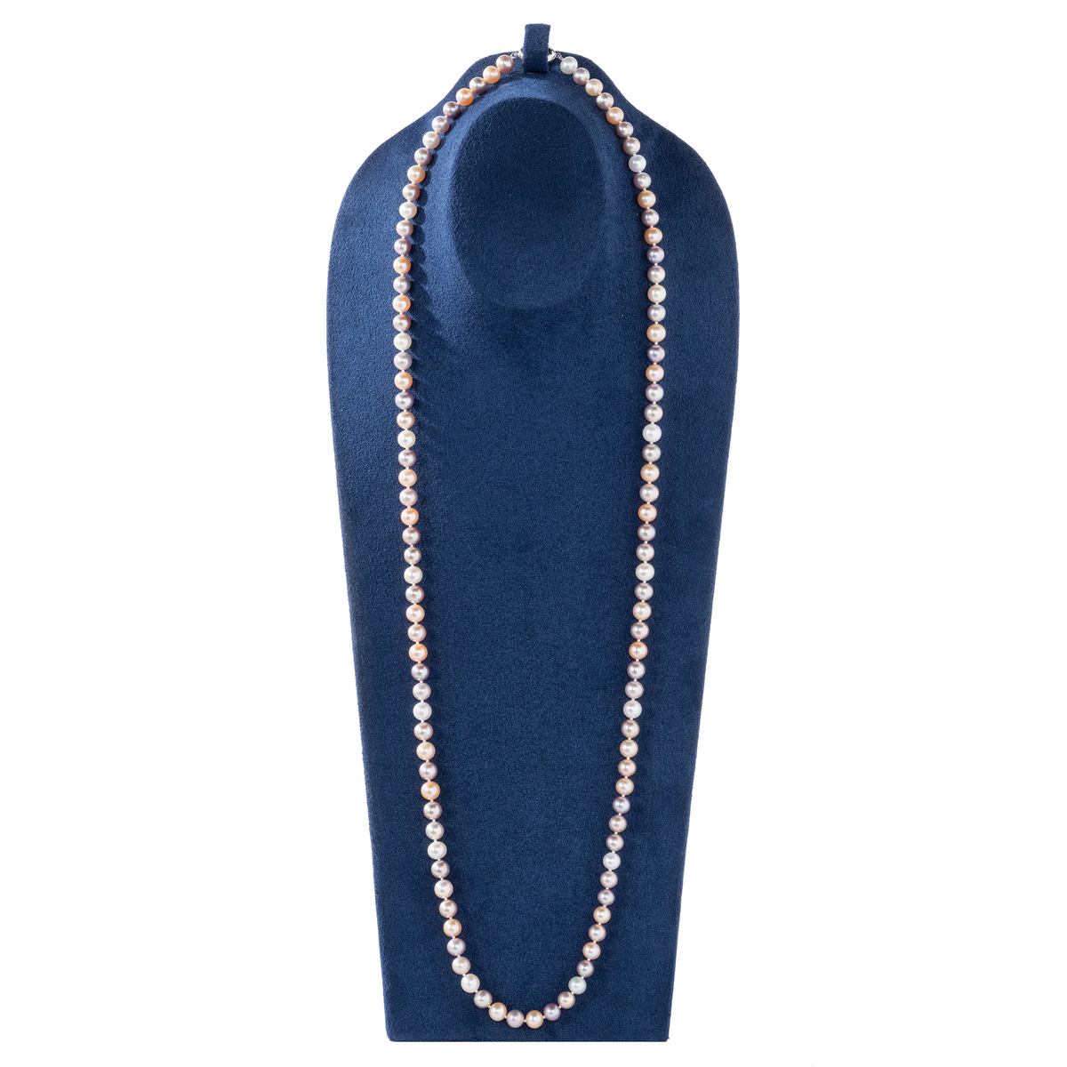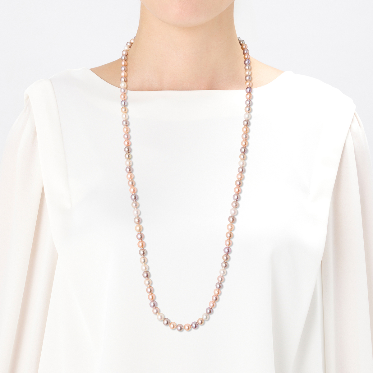 淡水真珠を連ねたロングネックレス。淡水真珠特有のパープル系やオレンジ系をミックスしたマルチカラーデザインで、2連にするなどアレンジも楽しめます