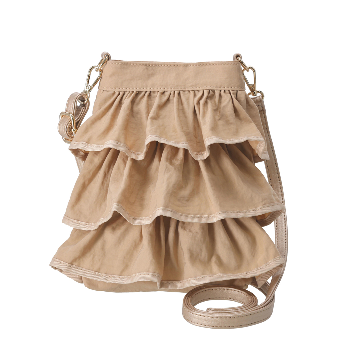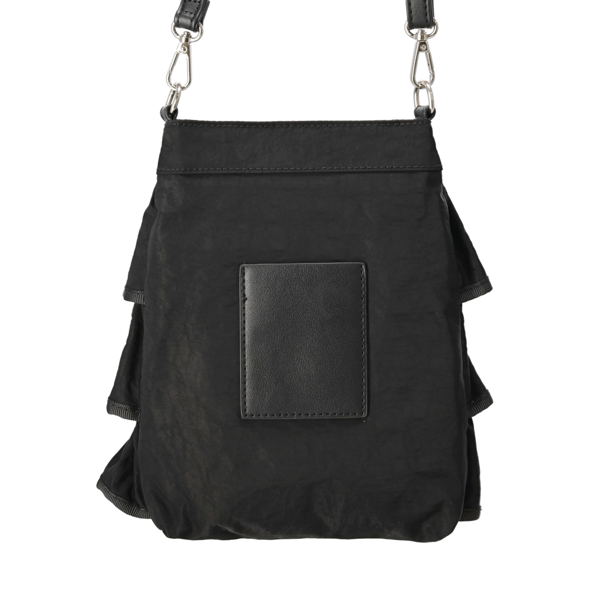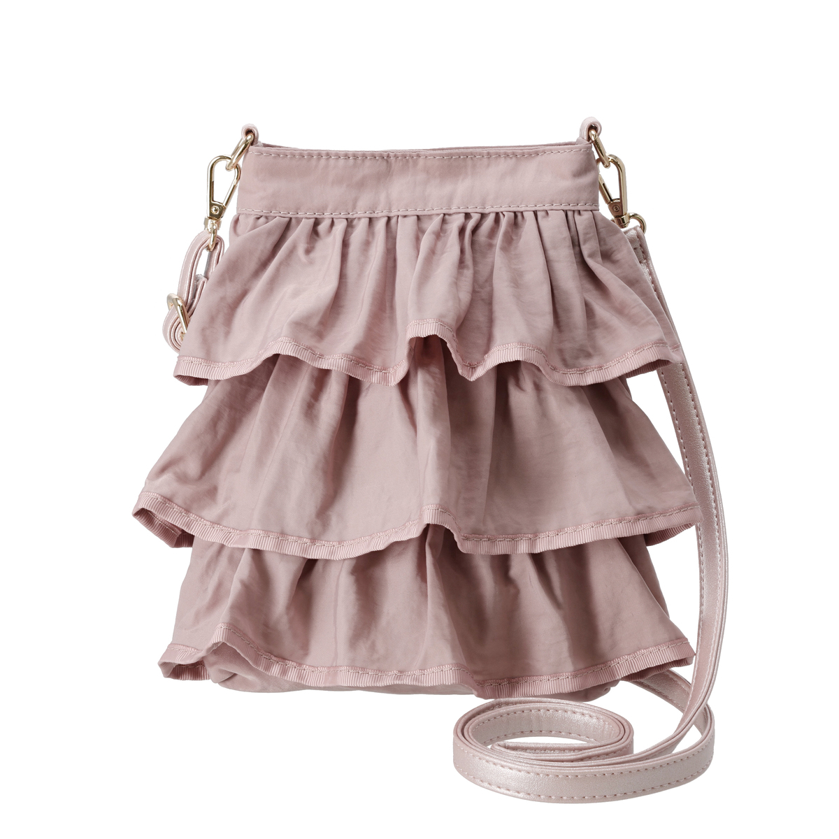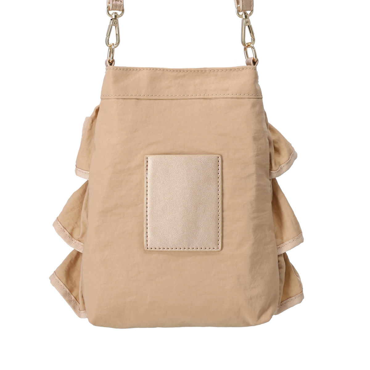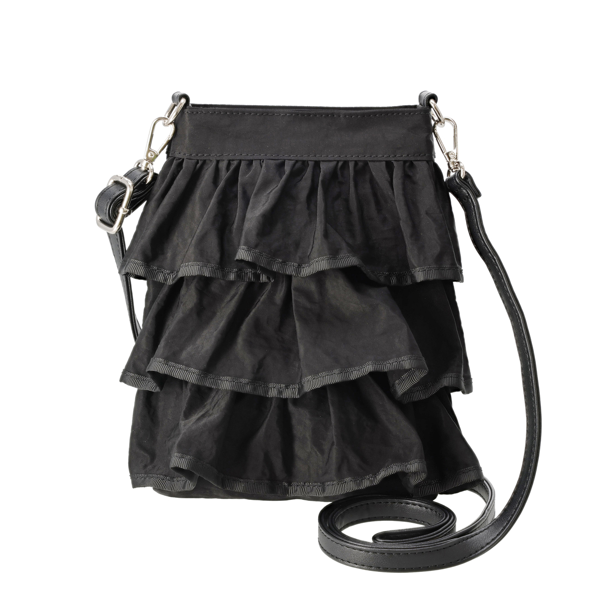 3段のティアードフリルを施したポシェット。長財布が縦に入り、スマートフォンも楽々収納できるるサイズ感で、バッグの背面には便利なカード入れポケット付き。表地は普段使いしやすいナイロン素材で、開閉はマグネット式です