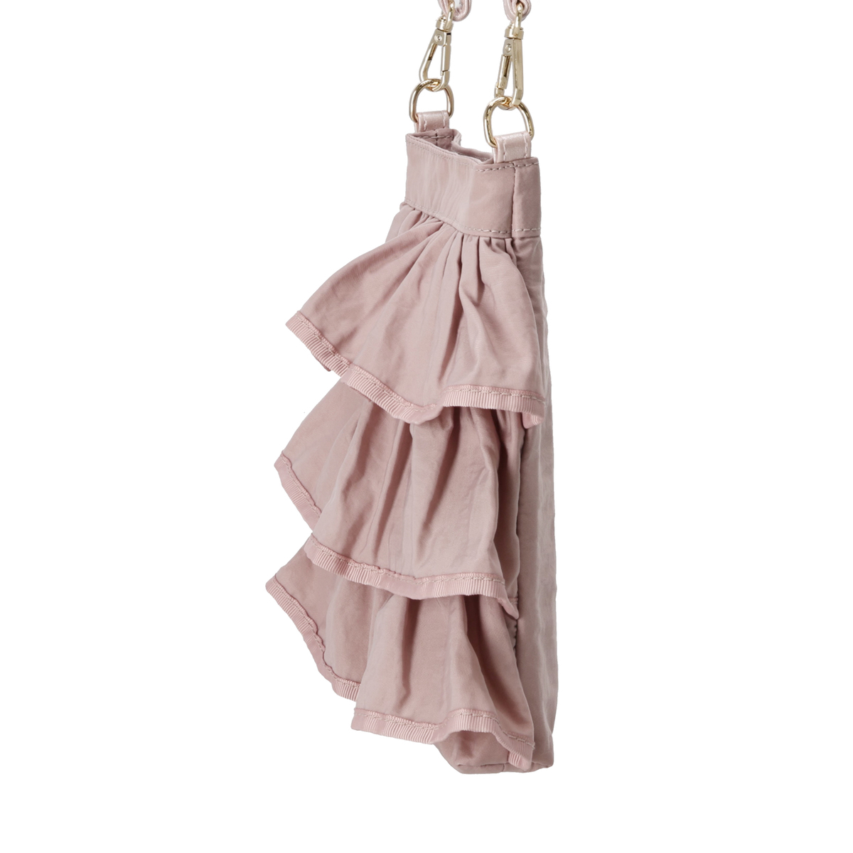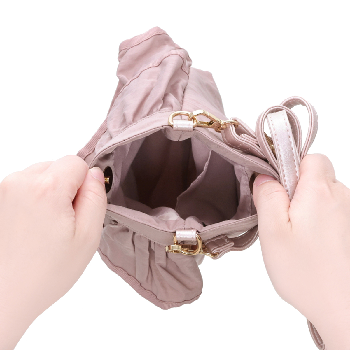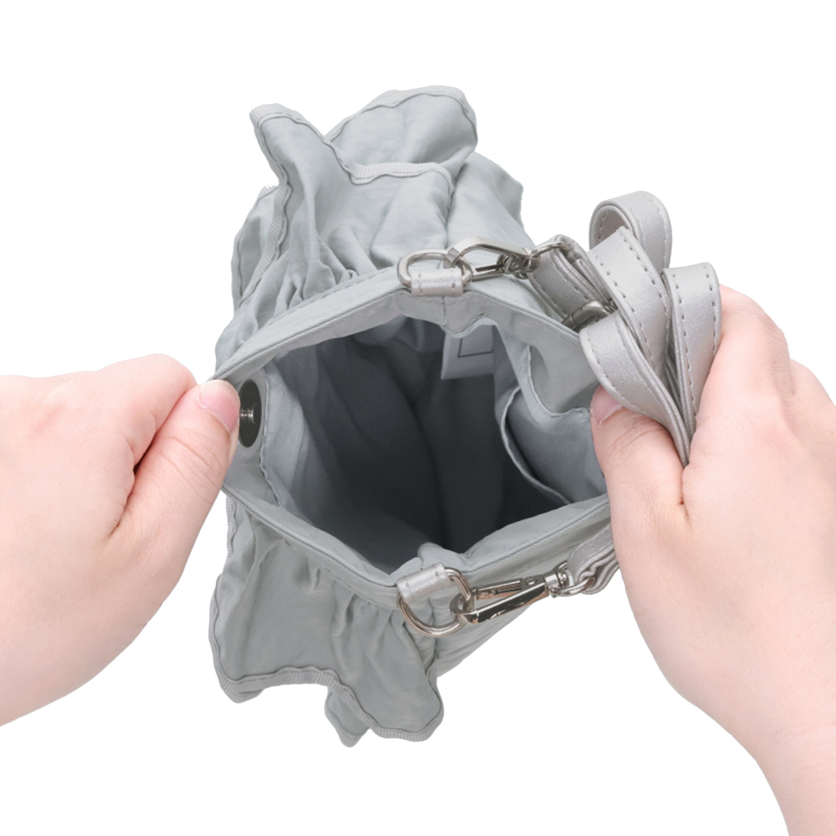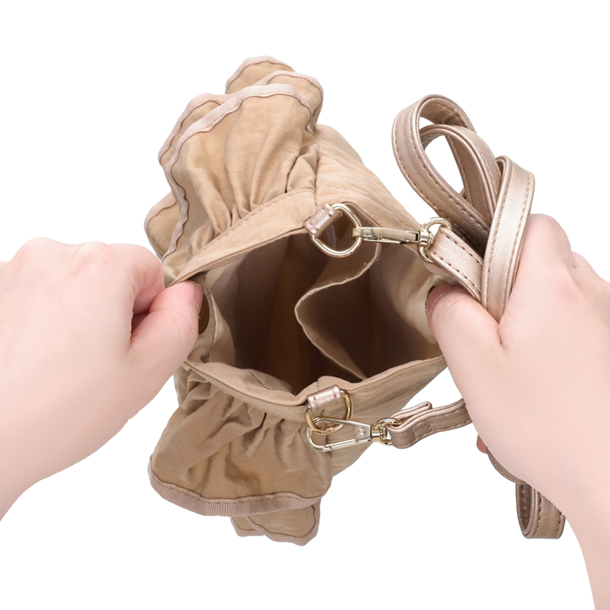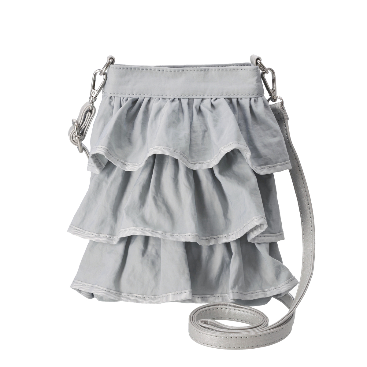 3段のティアードフリルを施したポシェット。長財布が縦に入り、スマートフォンも楽々収納できるるサイズ感で、バッグの背面には便利なカード入れポケット付き。表地は普段使いしやすいナイロン素材で、開閉はマグネット式です