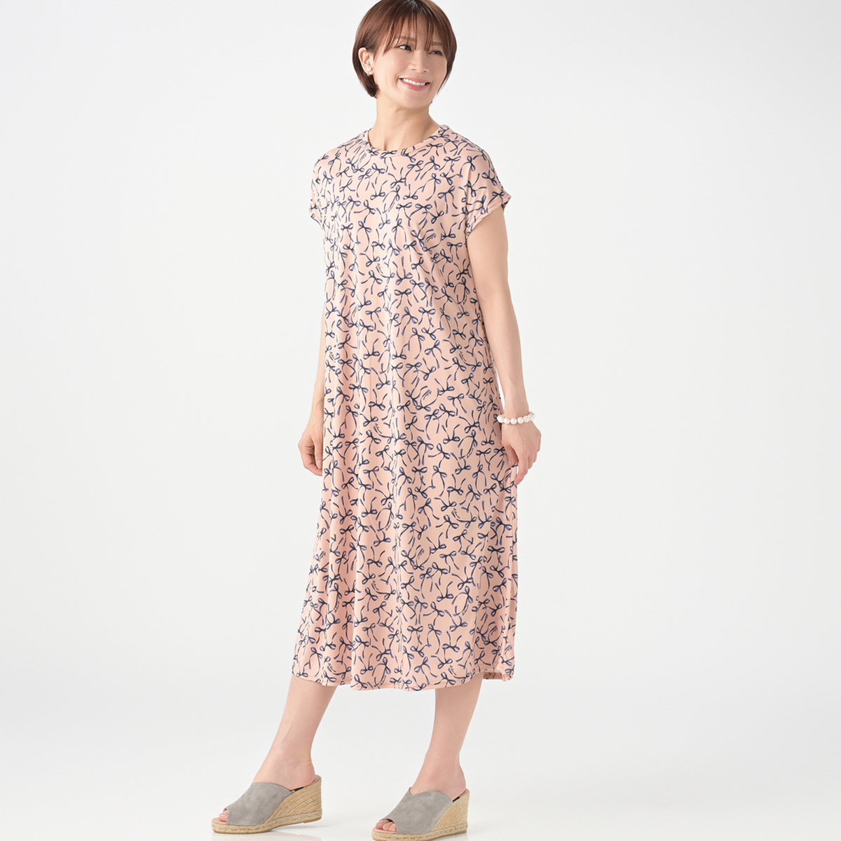フレンチのお袖で二の腕もさほど気にならず着られます。ただこの猛暑で、どこでもエアコンが効いているので、私はカーディガンを合わせています。昔のアンドラブのワンピースやチュニックはこの素材が多かったなあと懐かしい気持ちになりました。 リボン柄もそんなに甘すぎずどこにでも着て行けます。洗ったらすぐ乾くし、ポケットもある。実に快適。 ピンクはウエストから下が皺だらけで太って見えたのでお返しします。