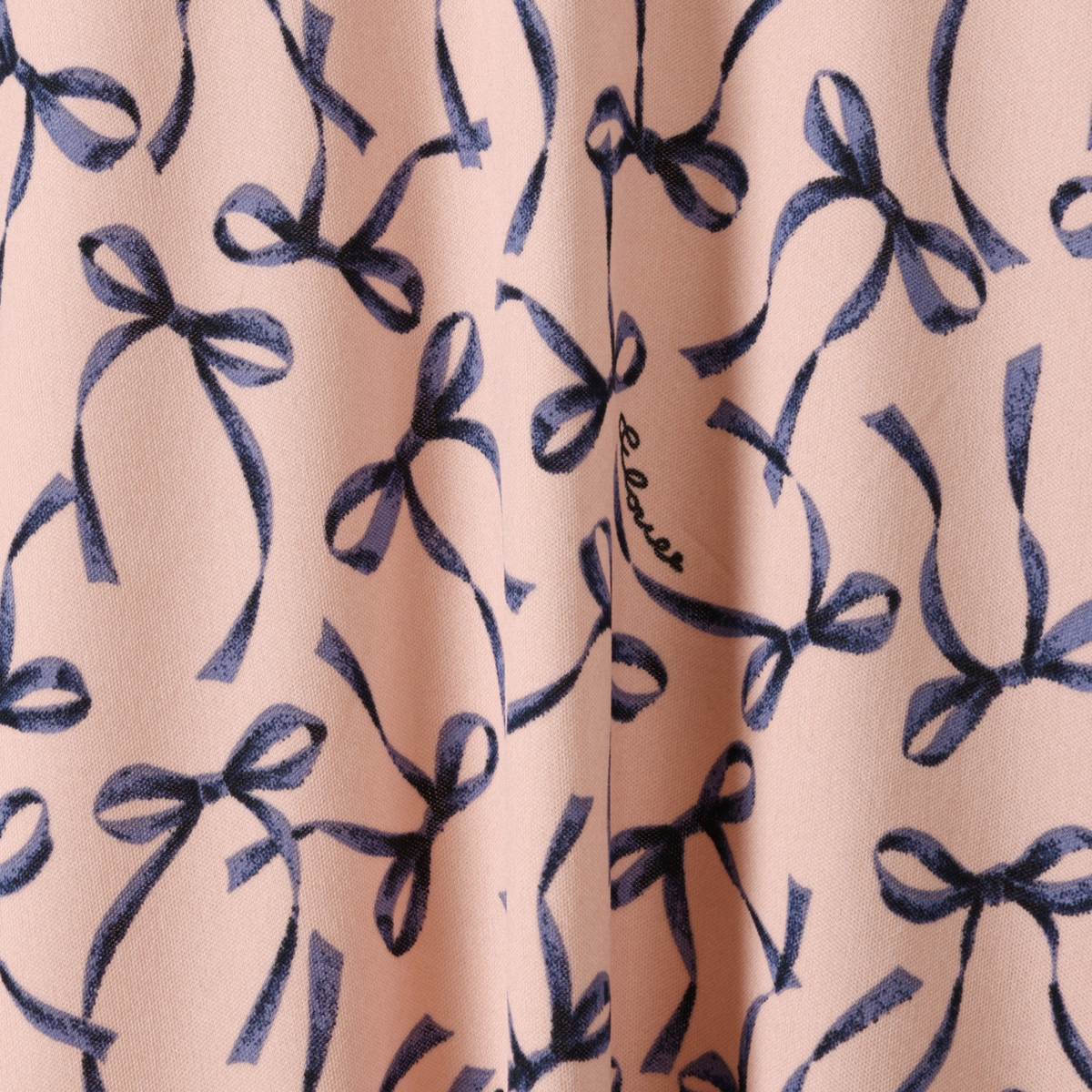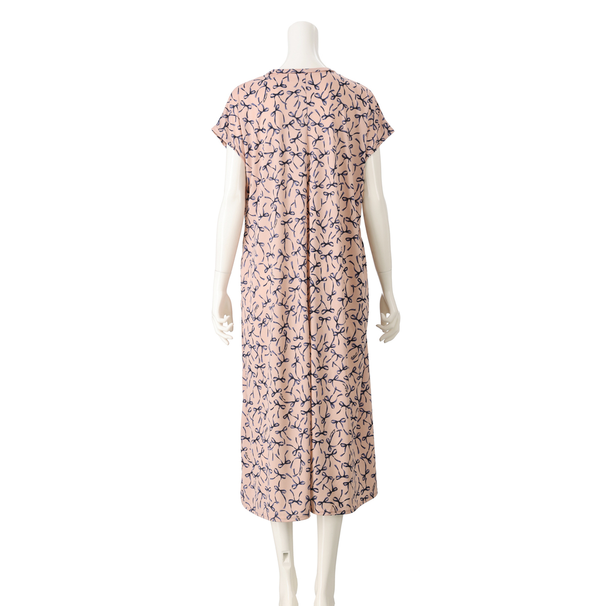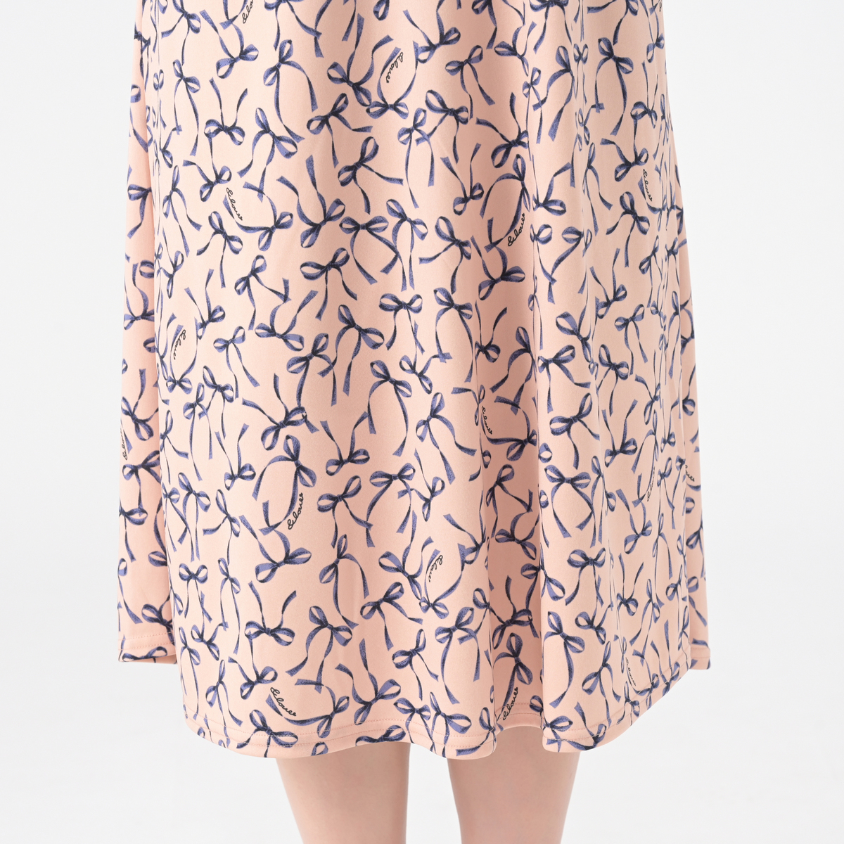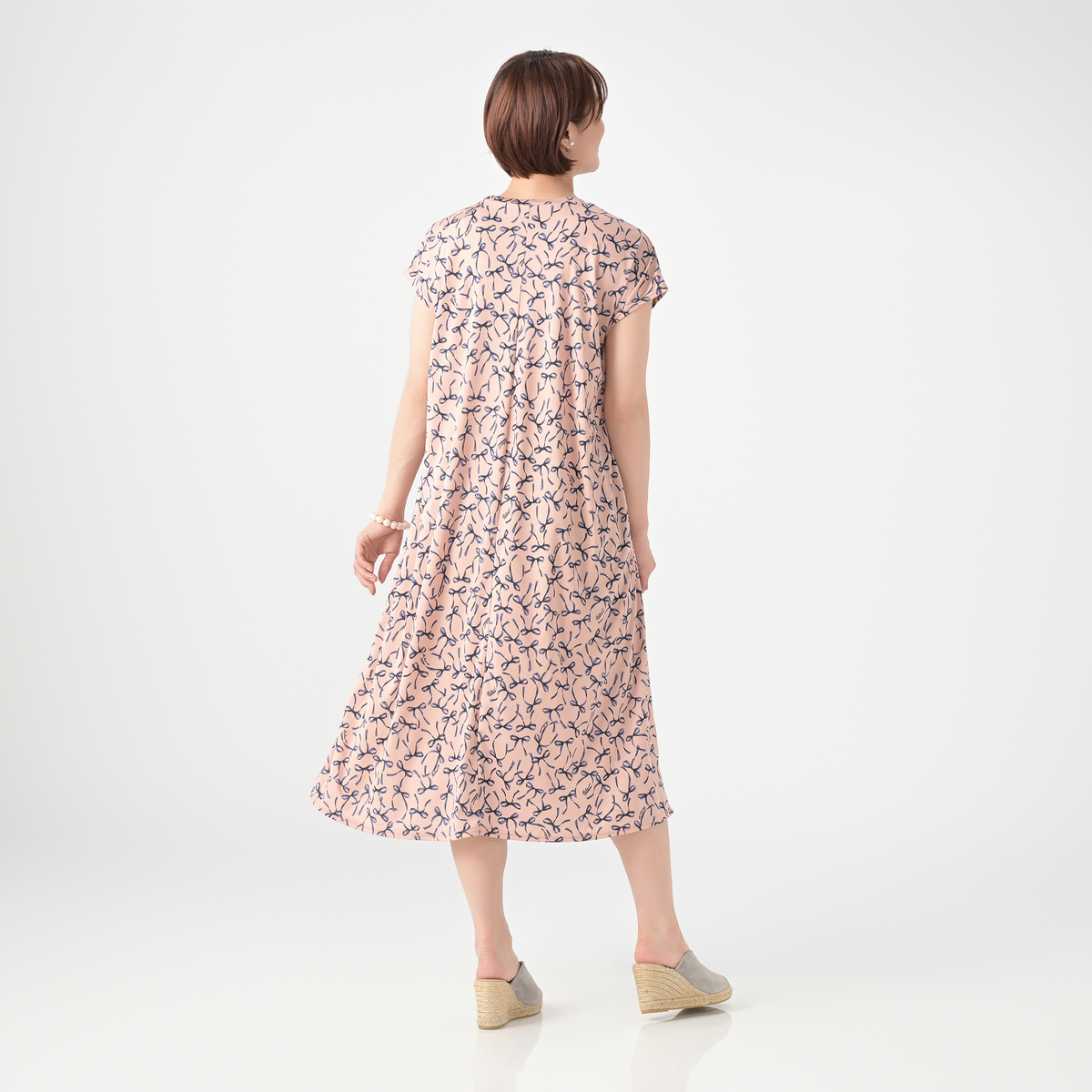 キュートな結び目のリボンを散りばめた、リボンプリントの総柄(*)ワンピース。ゆったりとしたAラインシルエットでミモレ丈に仕上げました