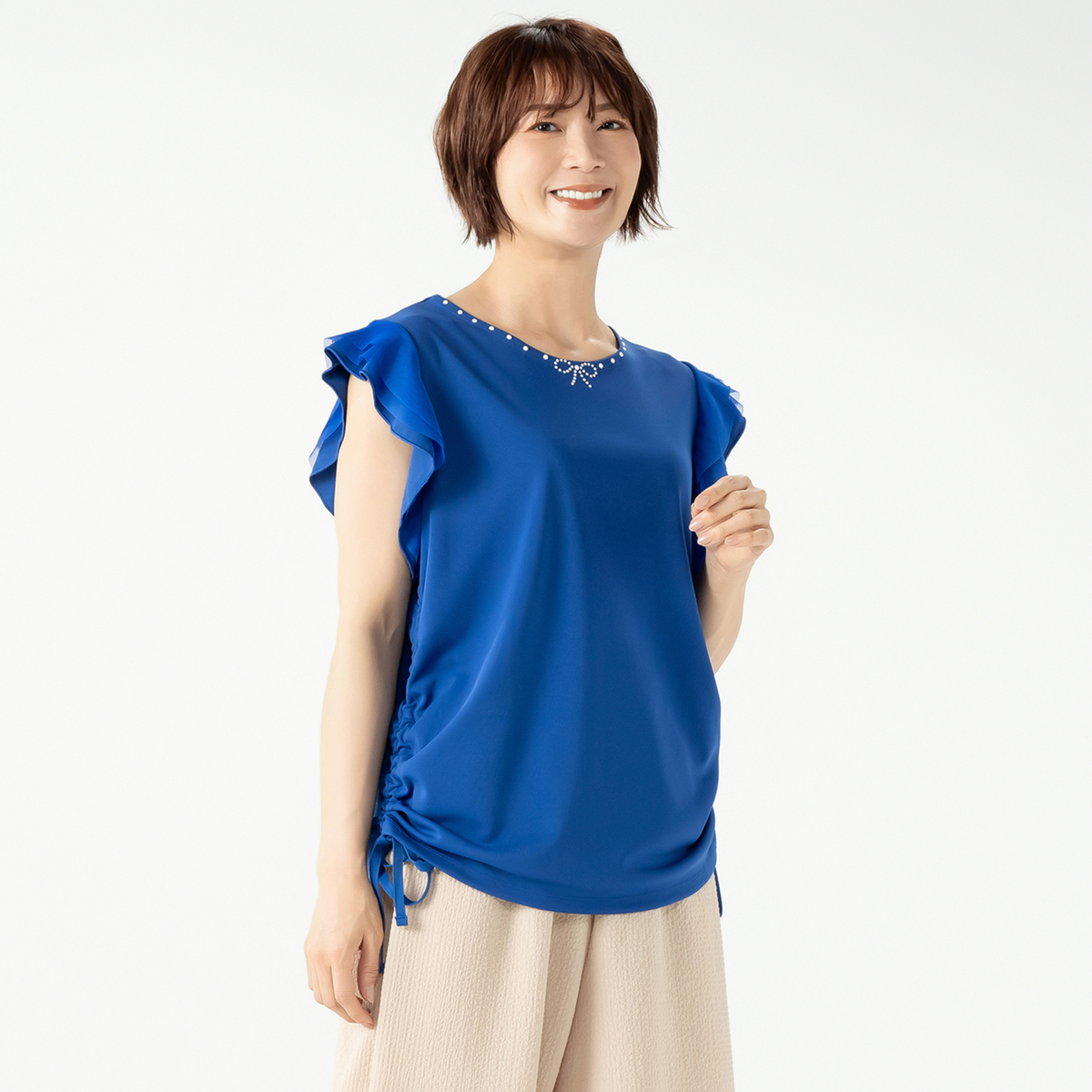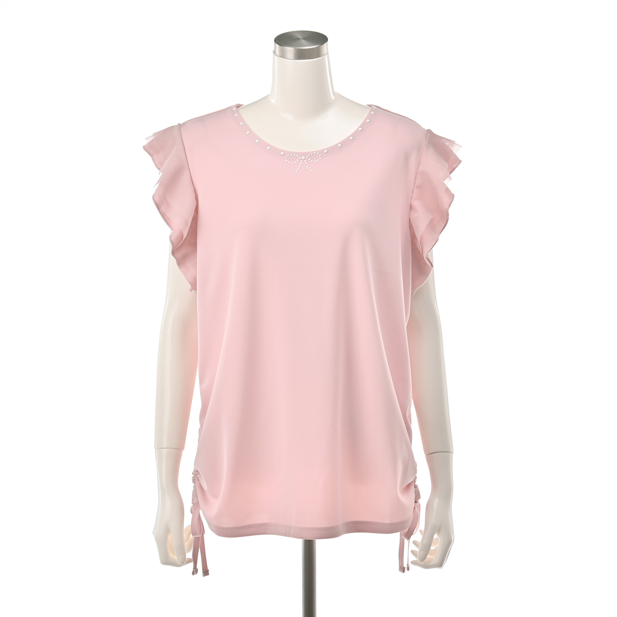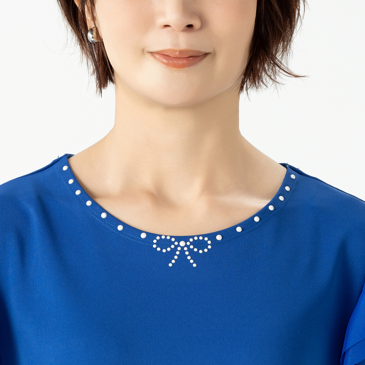 カットジョーゼット素材のプルオーバー。衿ぐりにパール調ビジューを施し、中心のリボンデザインがアクセントになり、上品な華やかさを演出します。袖はチュール素材を重ねたラッフルフレアのフレンチスリーブ。アームホール下には脇当てを付けています