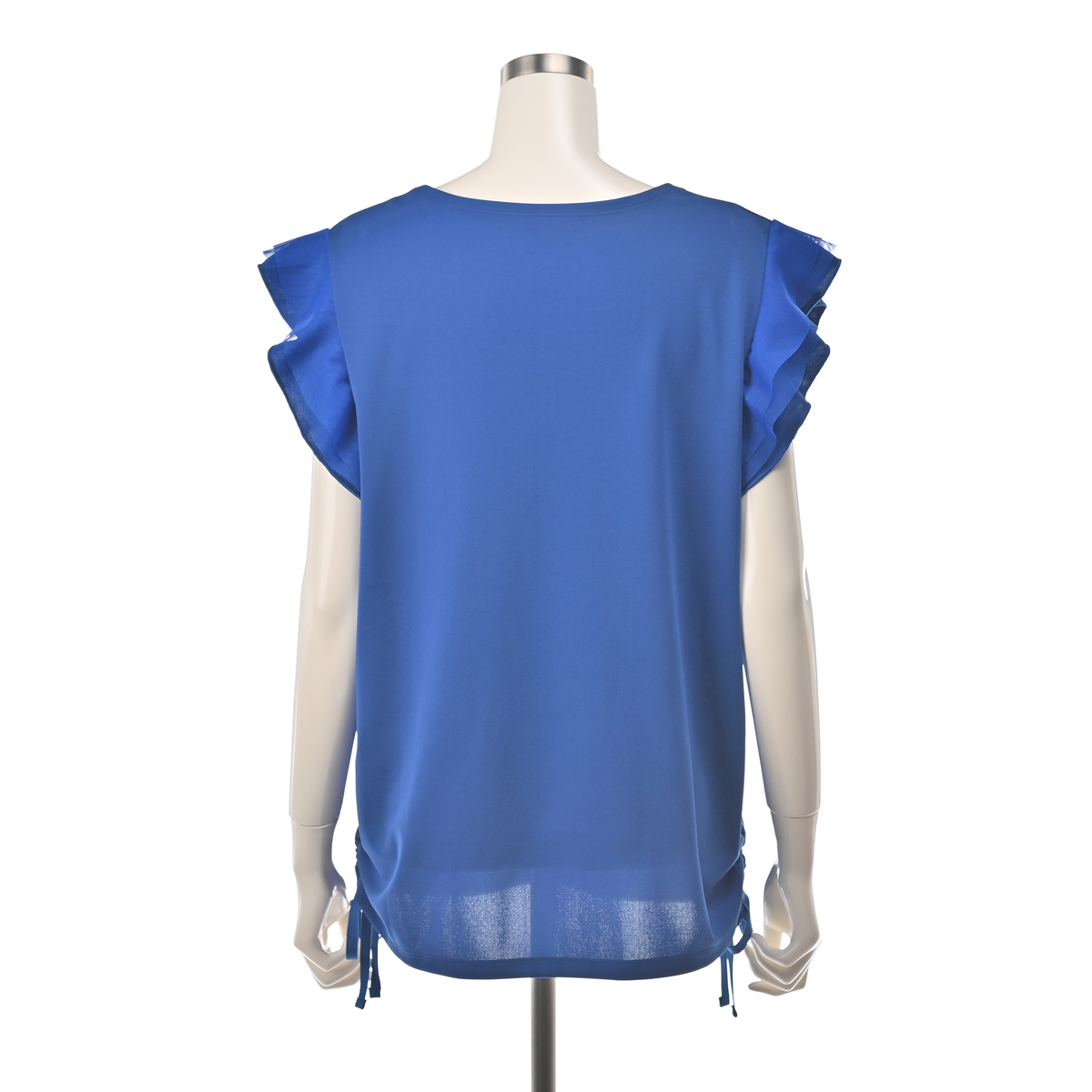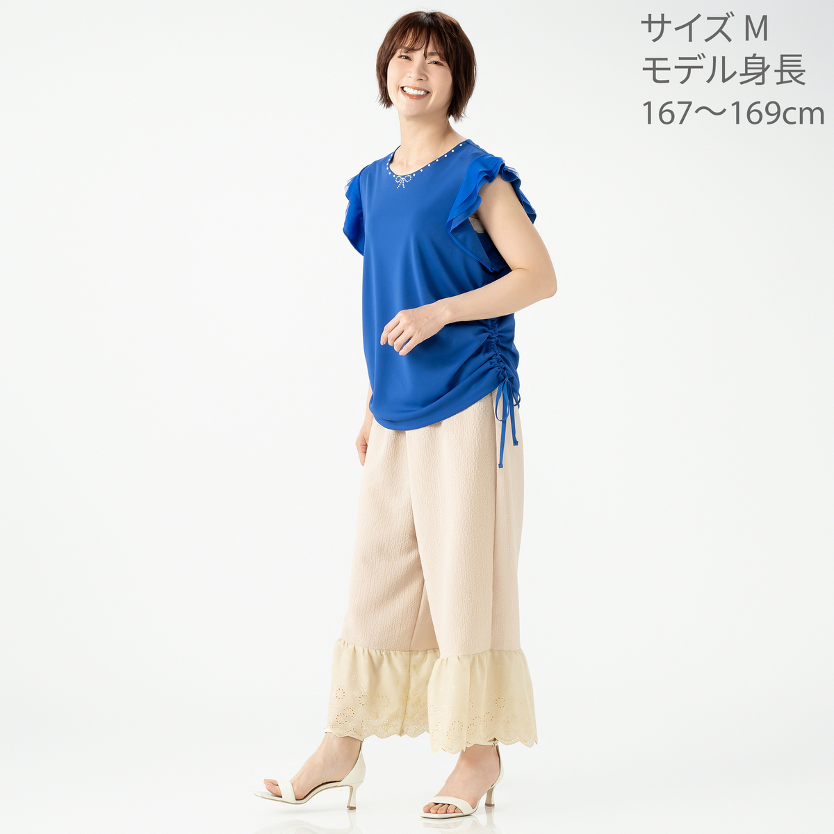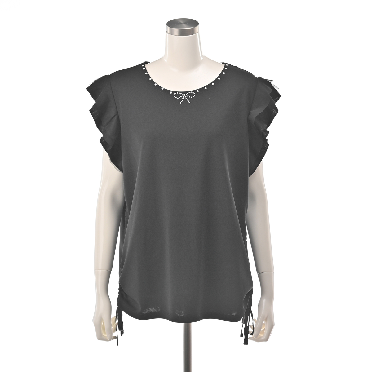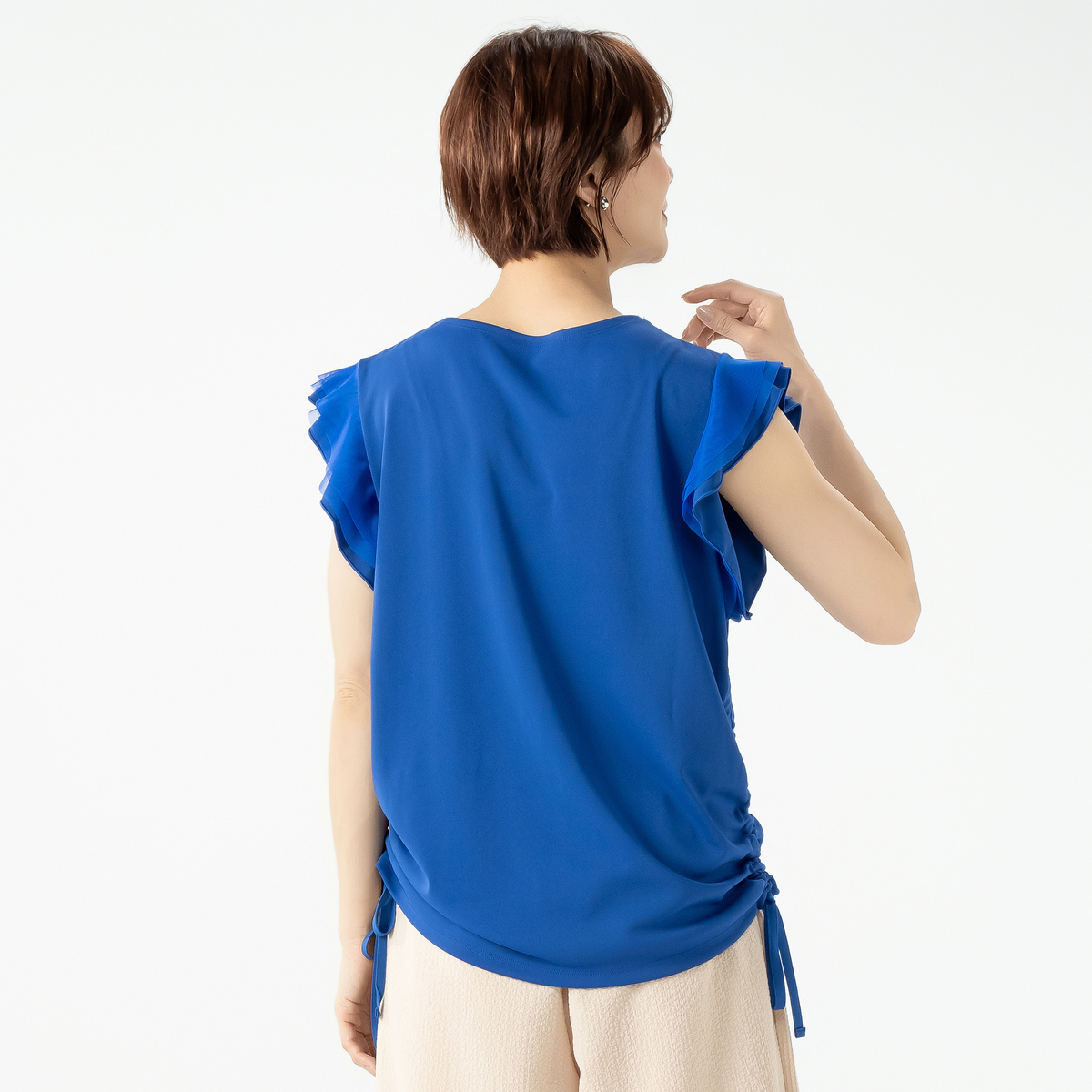 カットジョーゼット素材のプルオーバー。衿ぐりにパール調ビジューを施し、中心のリボンデザインがアクセントになり、上品な華やかさを演出します。袖はチュール素材を重ねたラッフルフレアのフレンチスリーブ。アームホール下には脇当てを付けています
