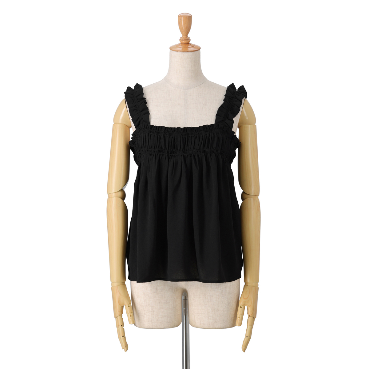 ギャザーフリルやシャーリングが、フェミニンな印象を演出。肩ひもはお好みの長さに調整可能なアジャスター付きです