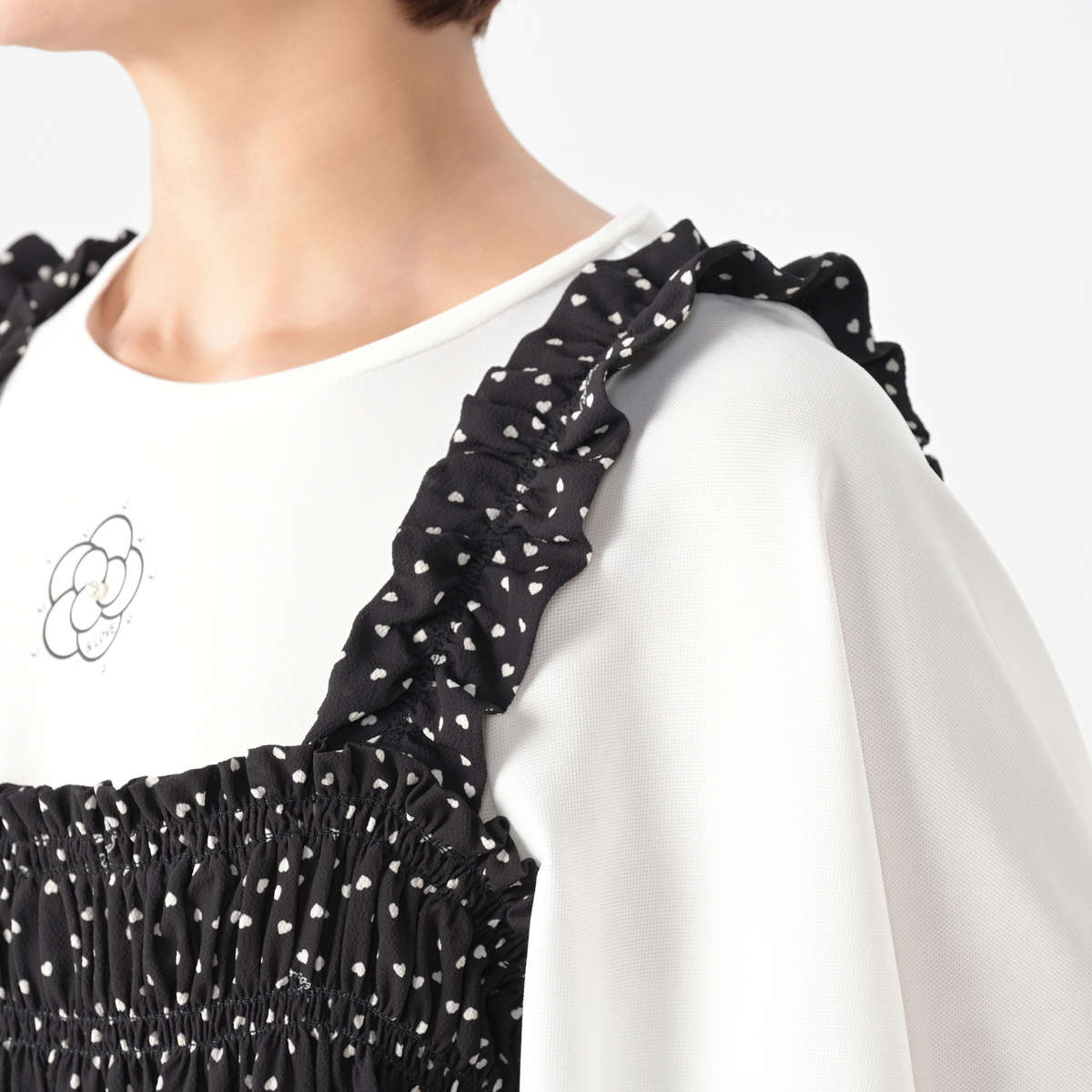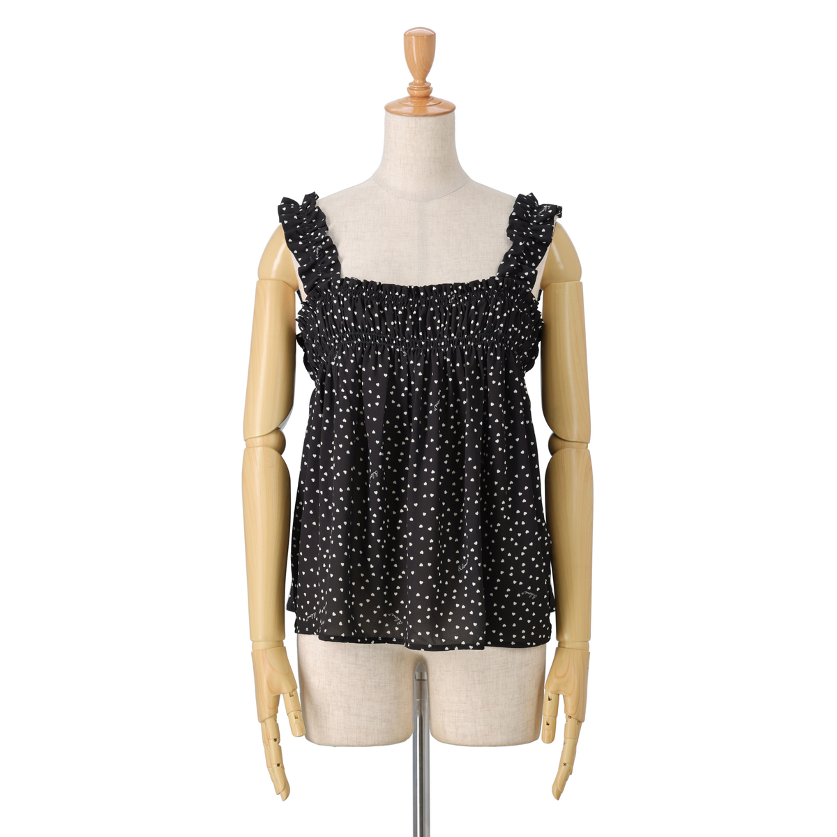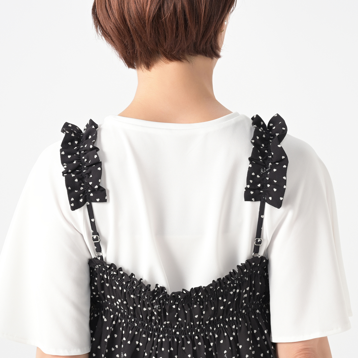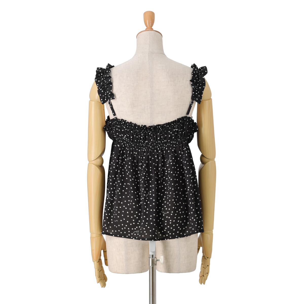 軽やかなジョーゼットクレープ素材のビスチェ。オリジナルのハートドット柄がキュートなアクセントになり、シンプルなトップスに重ねるだけで可憐なコーディネートにります