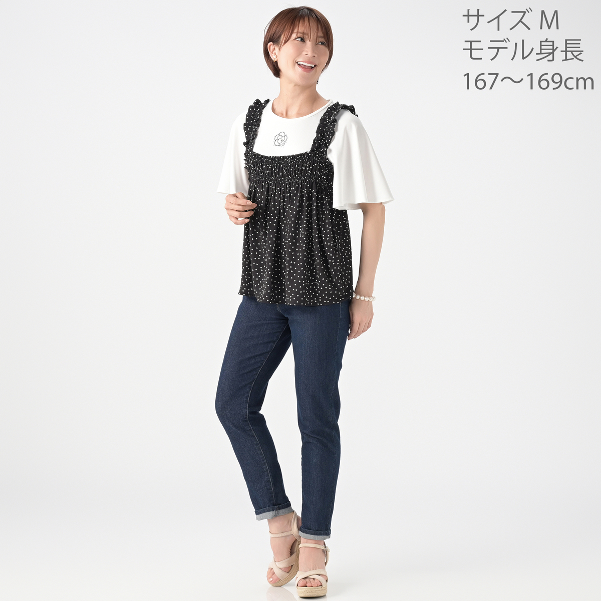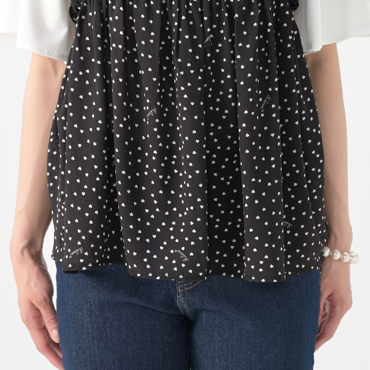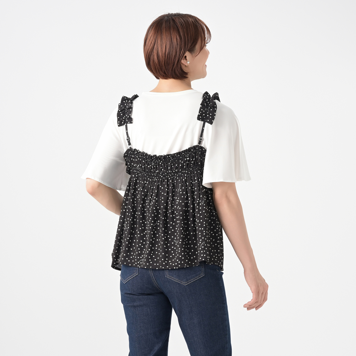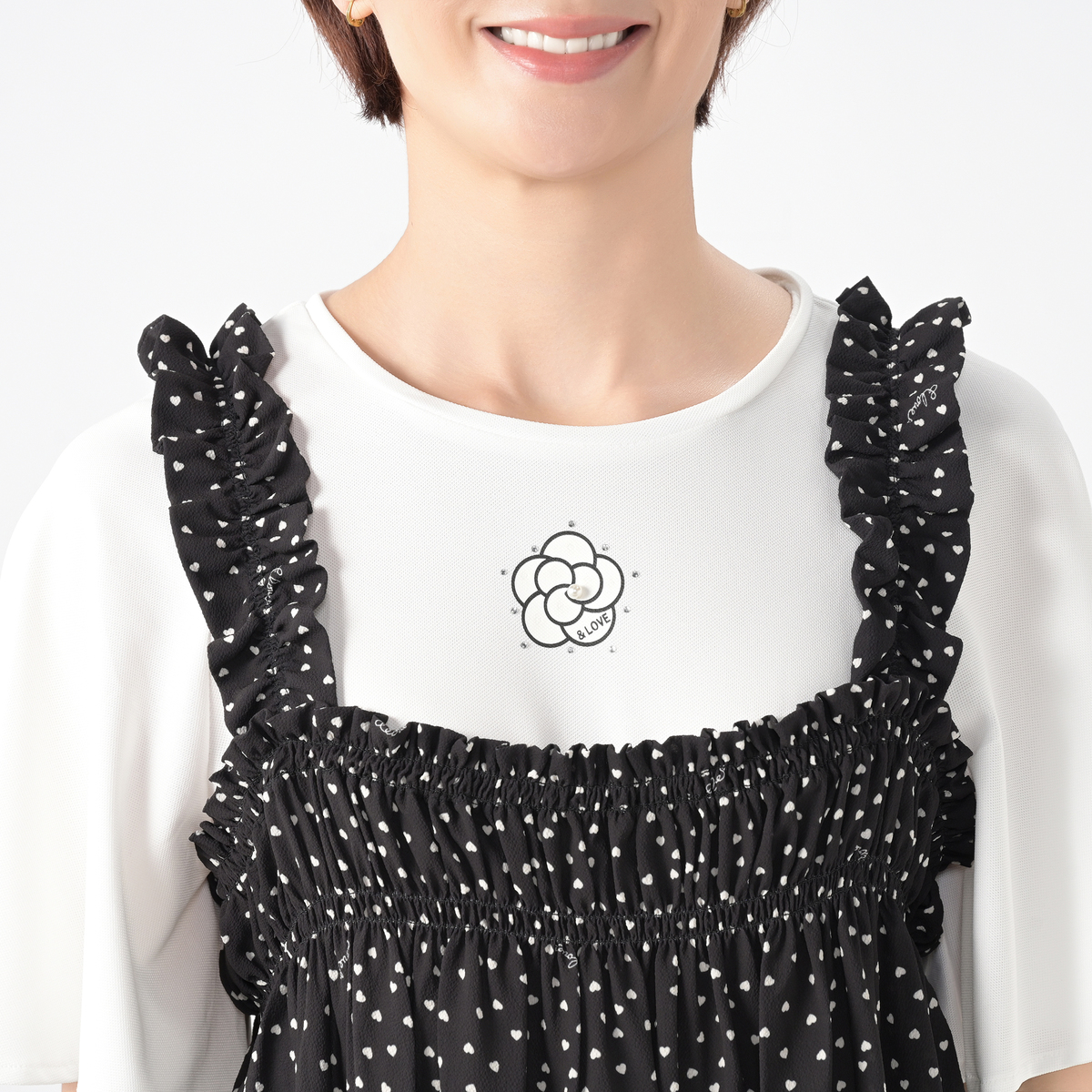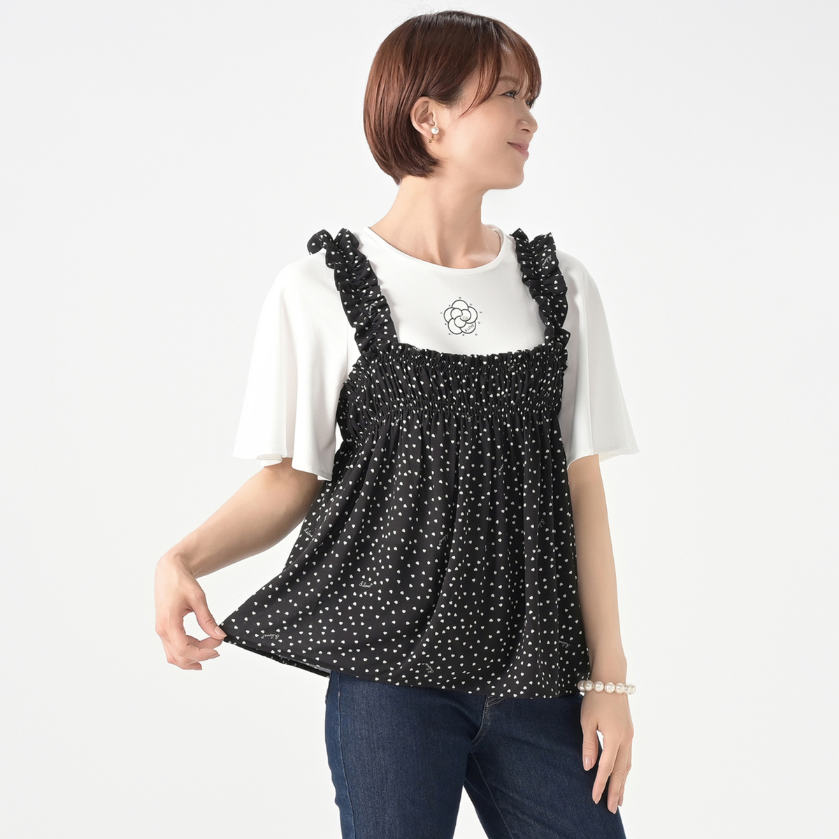 軽やかなジョーゼットクレープ素材のビスチェ。オリジナルのハートドット柄がキュートなアクセントになり、シンプルなトップスに重ねるだけで可憐なコーディネートにります