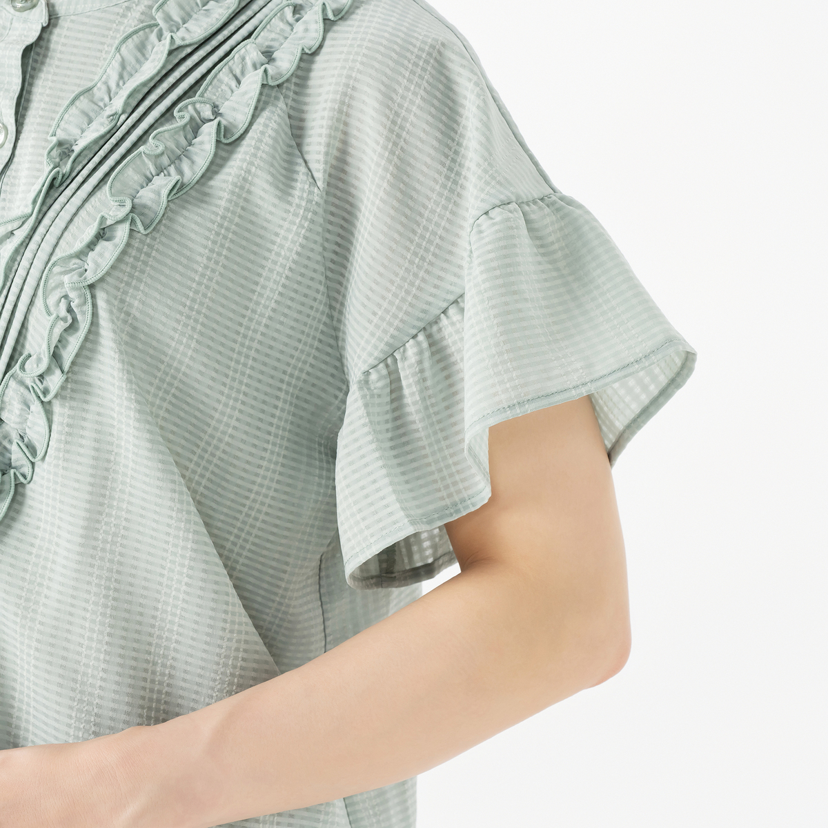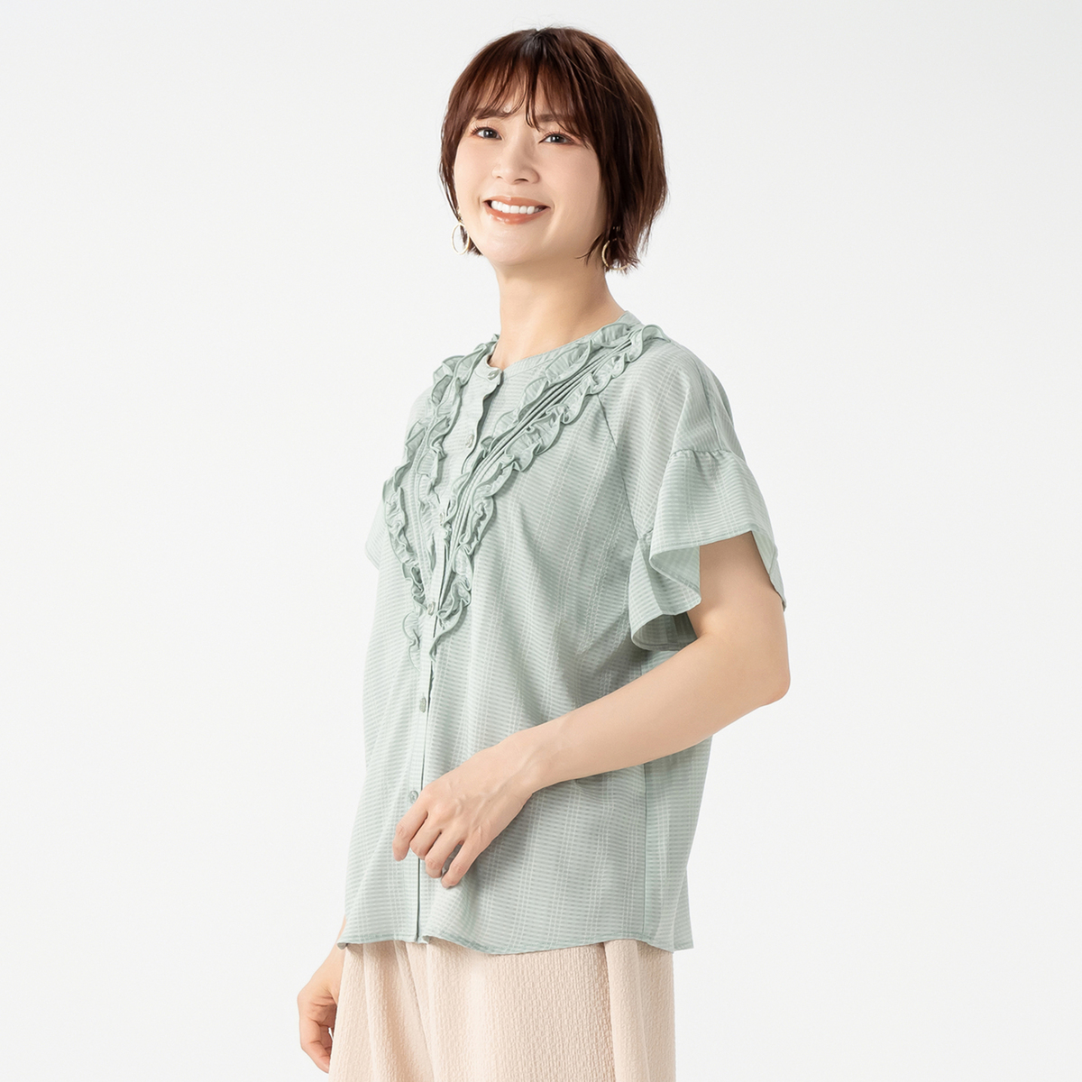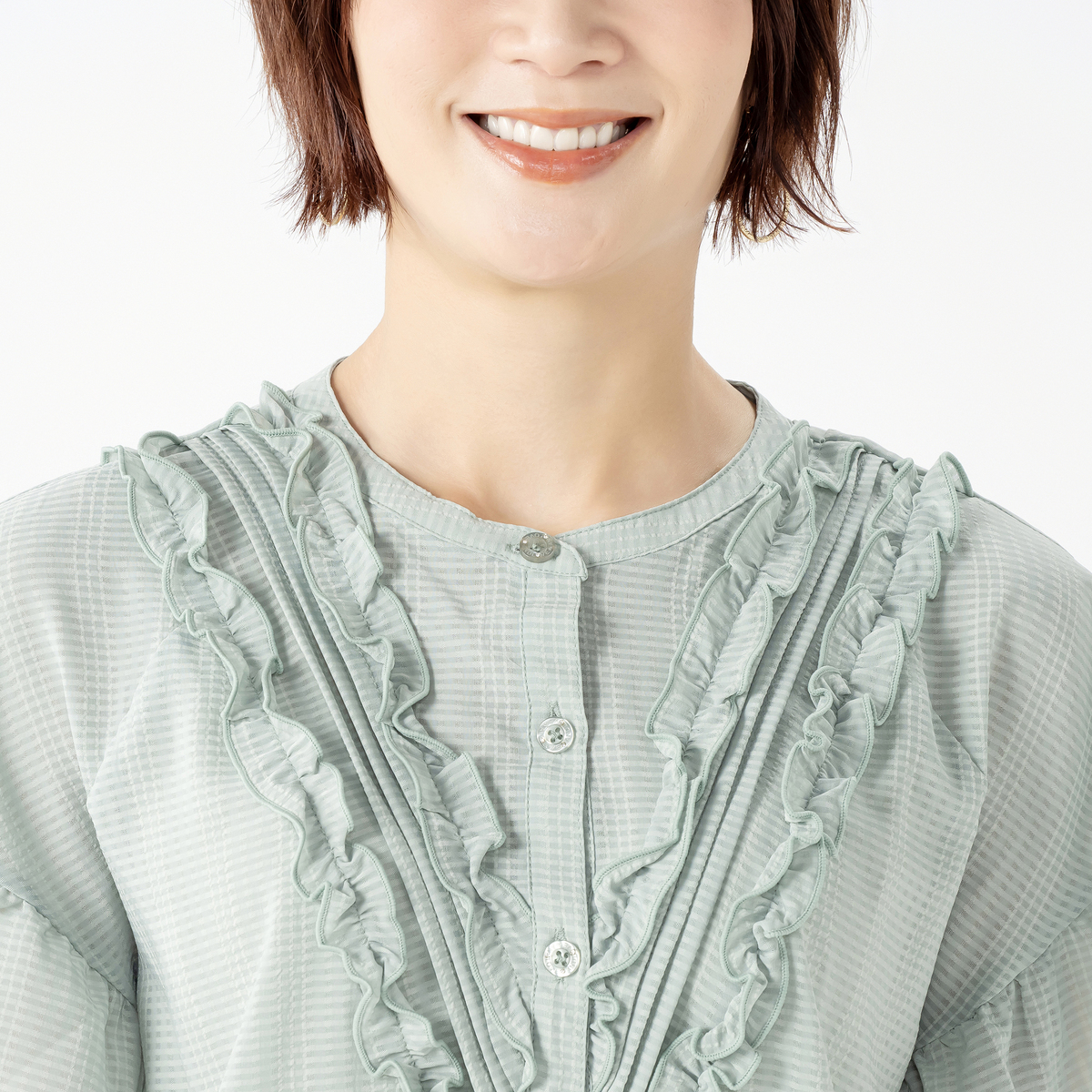 前身頃に立体的なピンタックと共地フリルを配したブラウス。スッキリとしたVラインに配置されたフリルで、細見え効果にも期待できます。ストンと落ちる美しいラインで、裾に向かってやや広がるシルエットも細見え効果をプラス。少しふんわりとした袖はフェミニンな印象を引き立てます。&LOVEロゴ入りのキラキラボタンもデザインポイントに