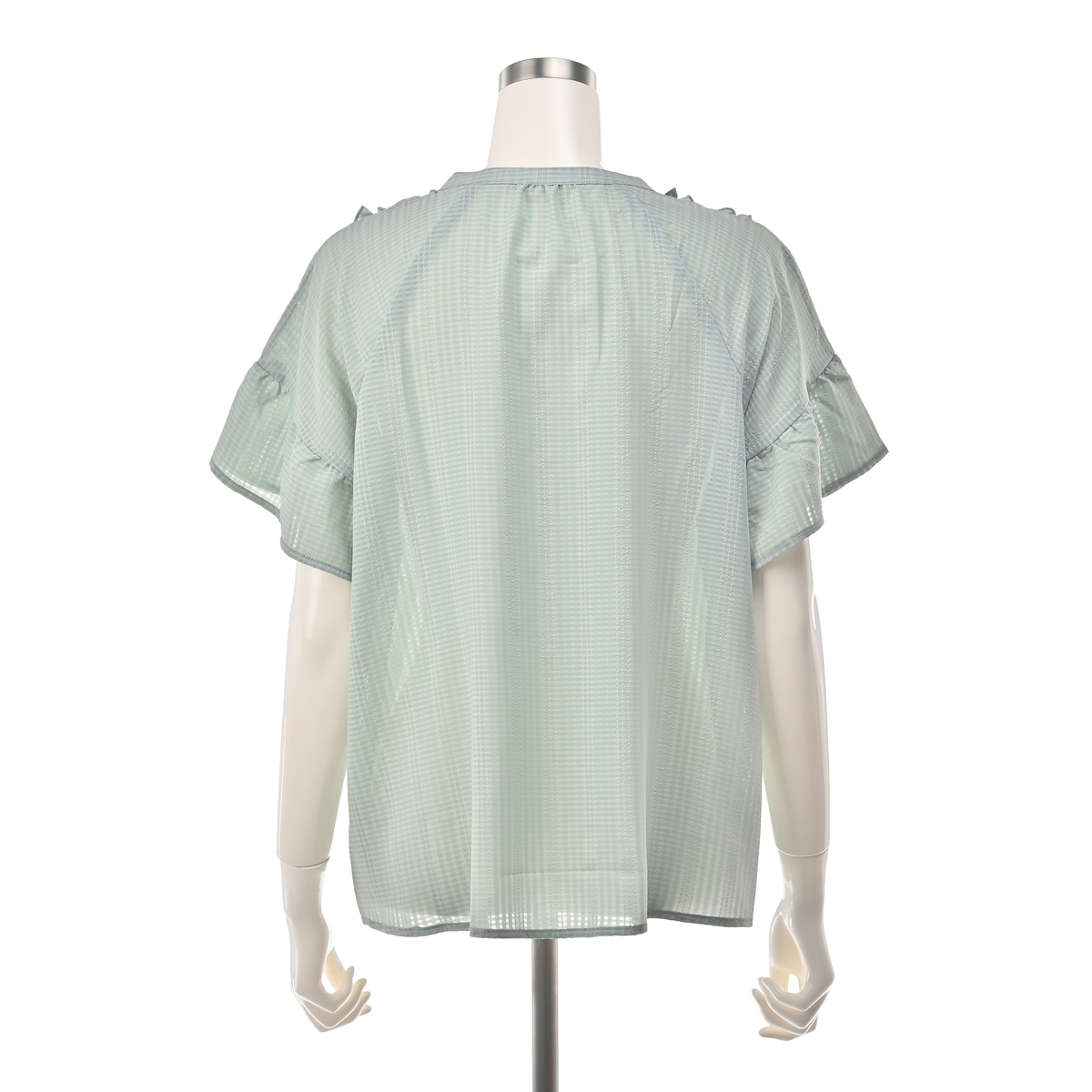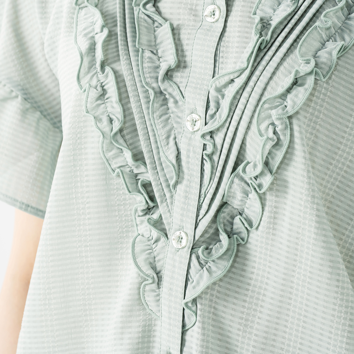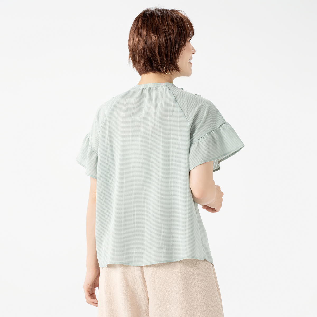 前身頃に立体的なピンタックと共地フリルを配したブラウス。スッキリとしたVラインに配置されたフリルで、細見え効果にも期待できます。ストンと落ちる美しいラインで、裾に向かってやや広がるシルエットも細見え効果をプラス。少しふんわりとした袖はフェミニンな印象を引き立てます。&LOVEロゴ入りのキラキラボタンもデザインポイントに