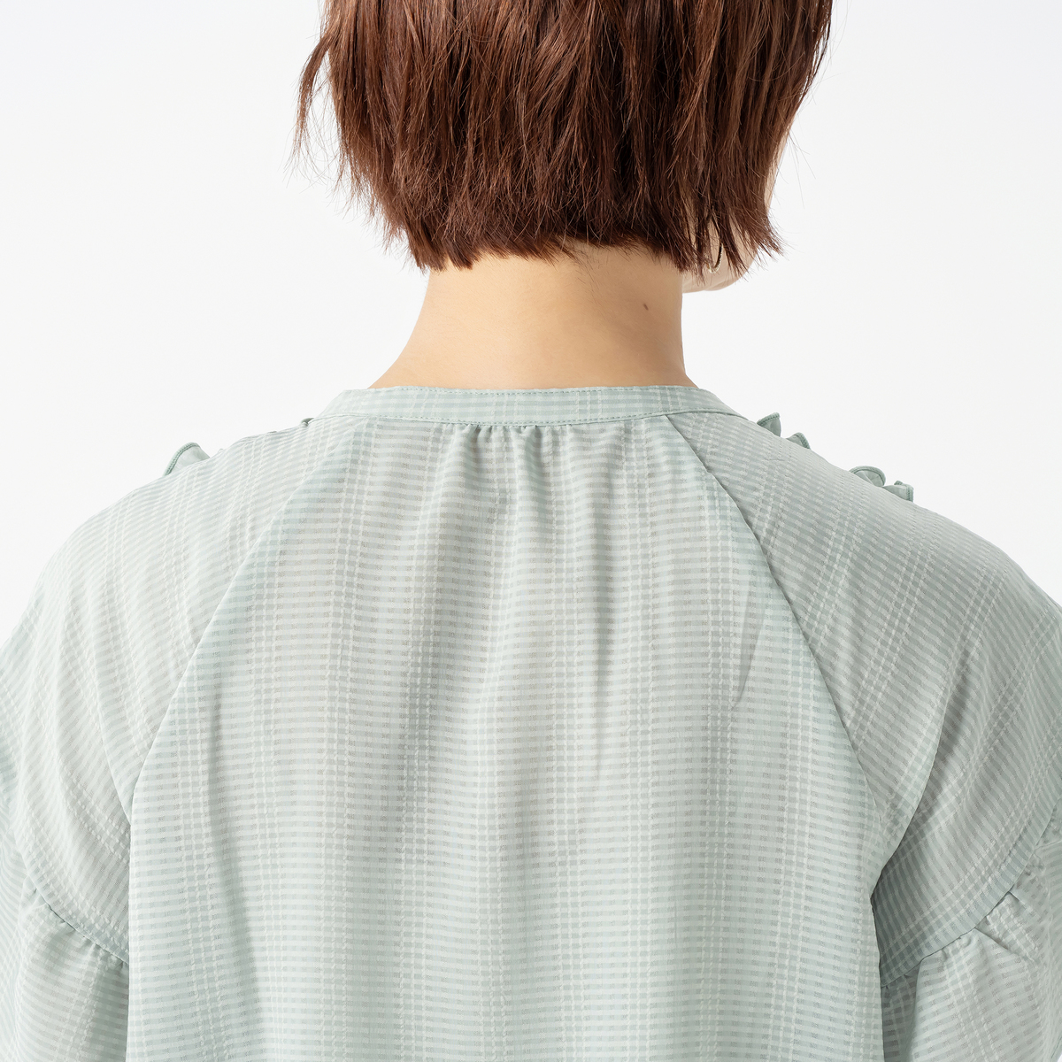 さらりとした肌触りの布帛素材を使用。表面感のあるシャドーチェック素材です。無地に見えながら、近づくとチェック柄が浮かび上がり、印象的で高級感のある素材で立体感があり、洗練された印象を与えます