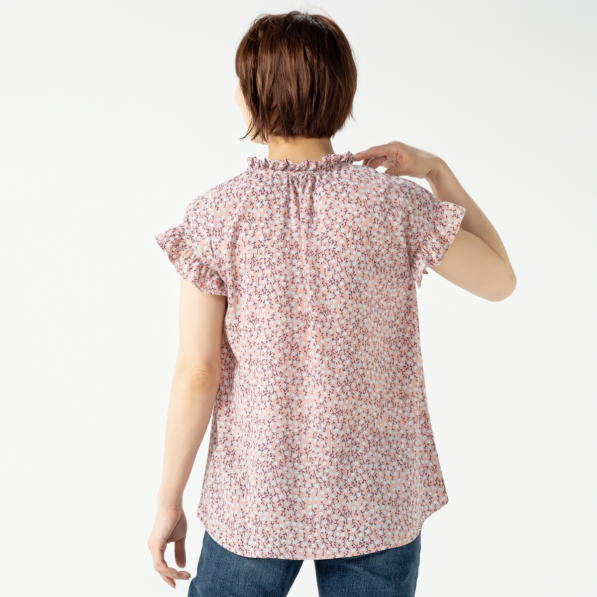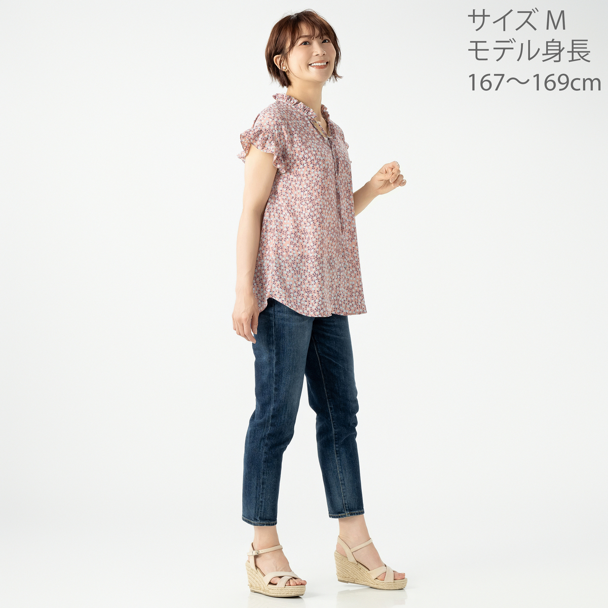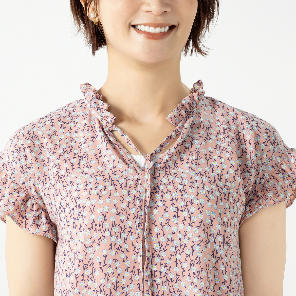 以前の夏は七分袖、半袖が主流でノースリーブやフレンチは殆ど着ずに過ごしていました 近年温暖化で私のブラウス用クロゼットにはノースリーブやフレンチが急ピッチで増えています! 今回、こちら袖口のフリフリが年配の私には気になるも小花柄でしたのでピンク LLサイズを購入 届いた翌日に数年前に&Loveで購入のアンクルに近い真珠の付いたクロップドパンツ(焦茶色)に 合わせ着て外出、軽く涼しく爽快でした! 強いて言えば… 袖口かと、若干狭めの為 動かしし過ぎると脇辺りが擦れかゆみが出て… 残念! 前側の脇口のフリル幅を狭めるか裏地の始末を考えるなどの余地あると存じます でもフレンチ袖のフリルのせいで落ち感が良くリボン結んだまま着用もでき素敵なデザインでした!